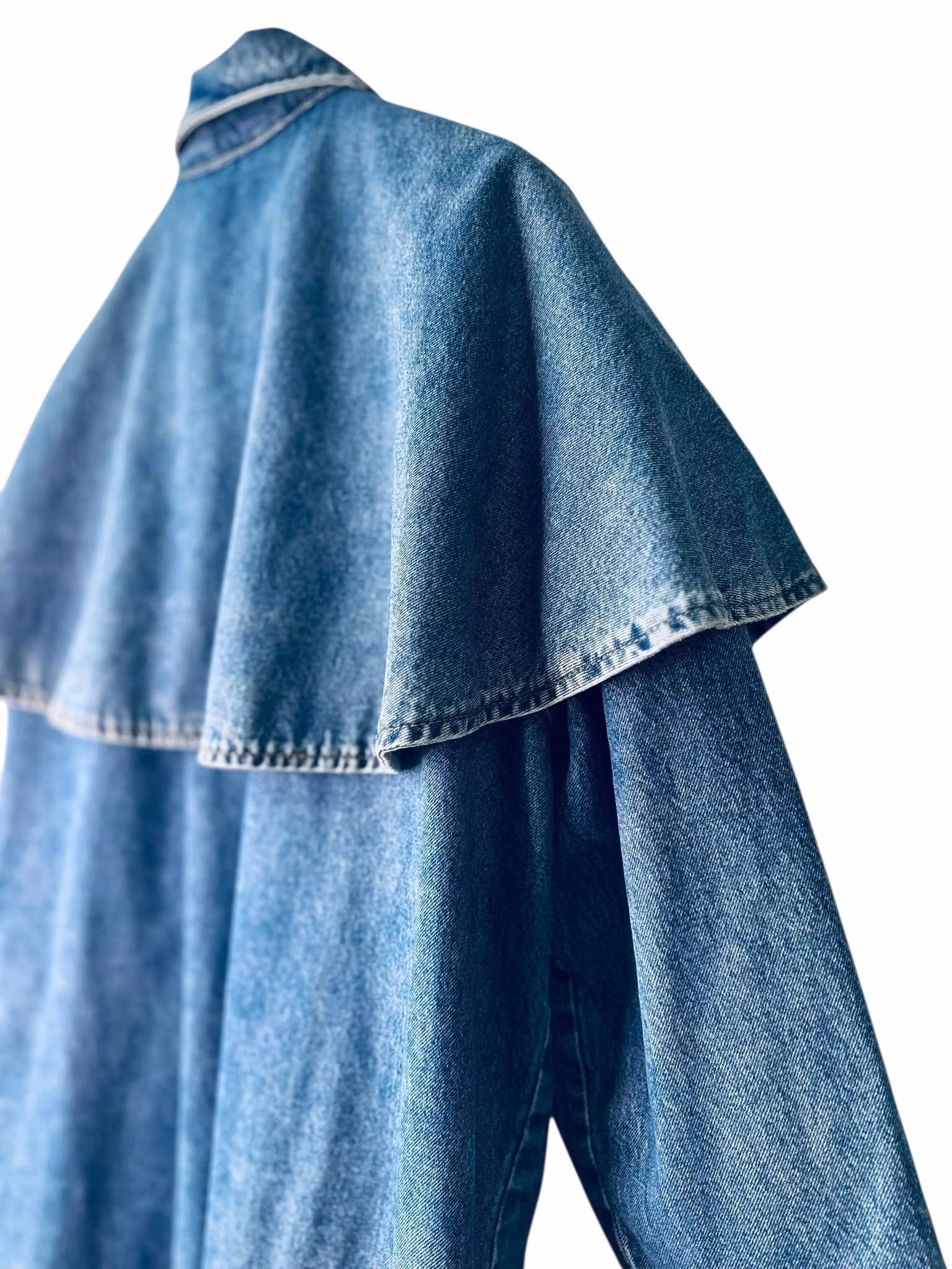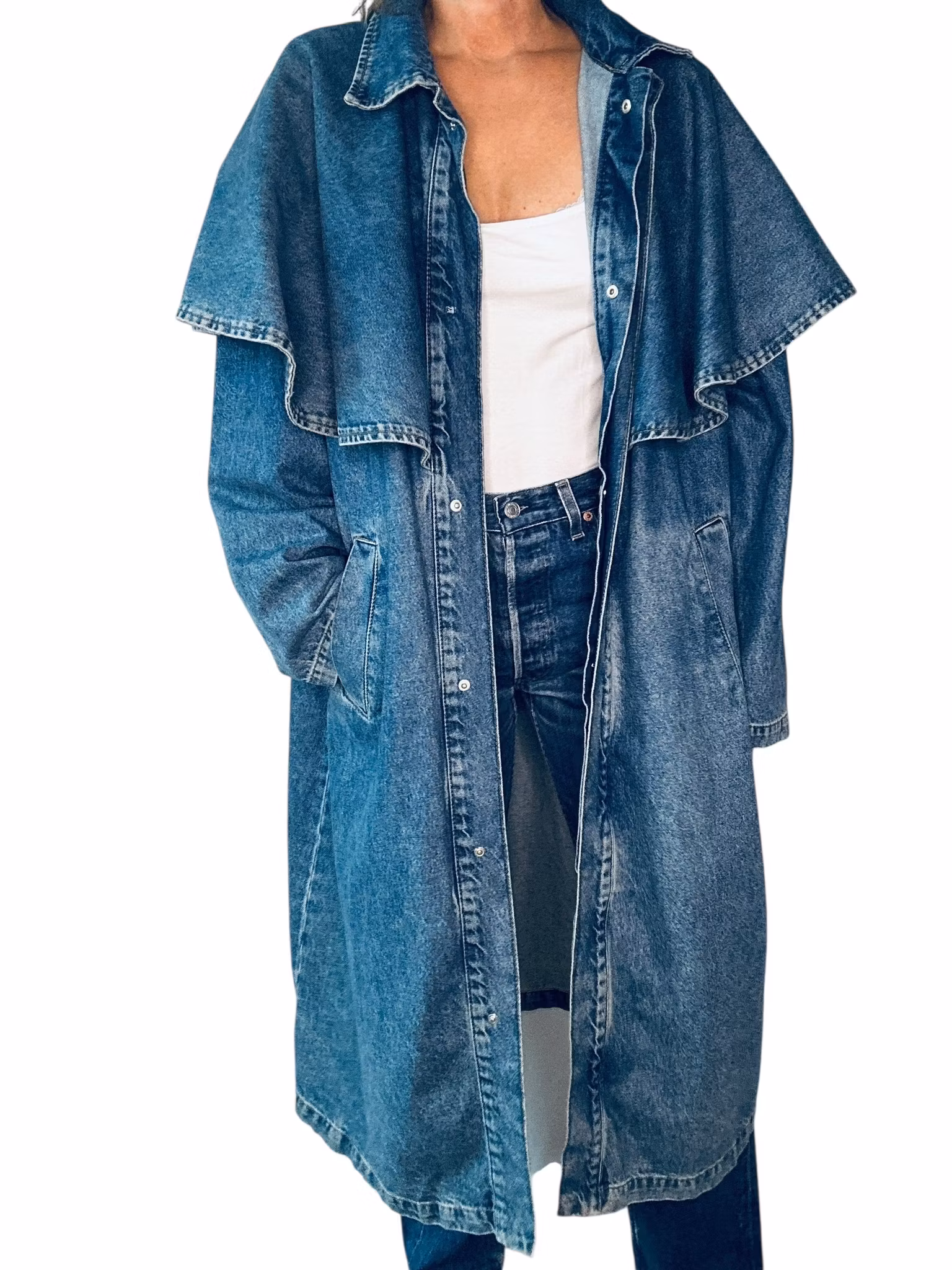 Beskrivning: En drömkappa! Hanna MW och hennes kollektion för Gina Tricot sålde slut i ett nafs och är fortfarande hett eftertraktade på andrahandsmarknaden. Därför är vi glada att kunna erbjuda kollektionens kanske snyggaste plagg - trenchen! I tjock, tvättad denim med en cape över axlarna i sann Sherlock Holmes-anda, dold knäppning med tryckknappar och snedställda fickor i sidorna. En av knapparna är utbytt, men detta syns inte vid användning eftersom de är dolda, se sista bilden. Första bilden är en lånad produktbild