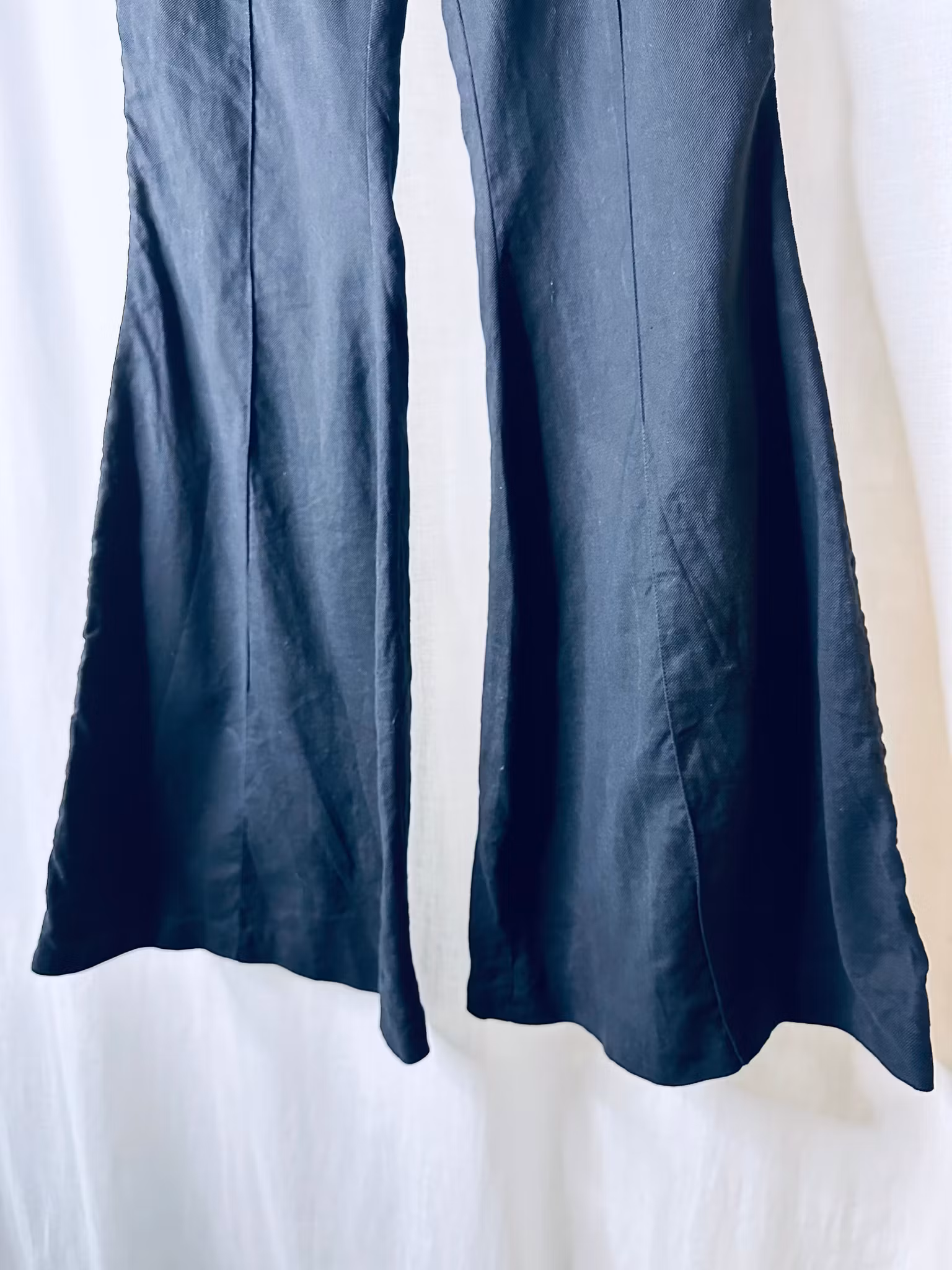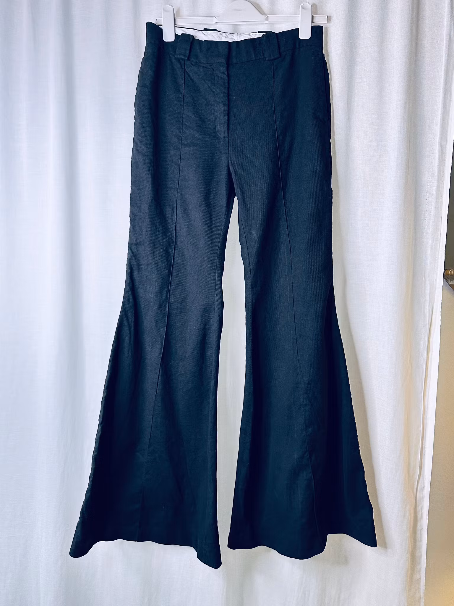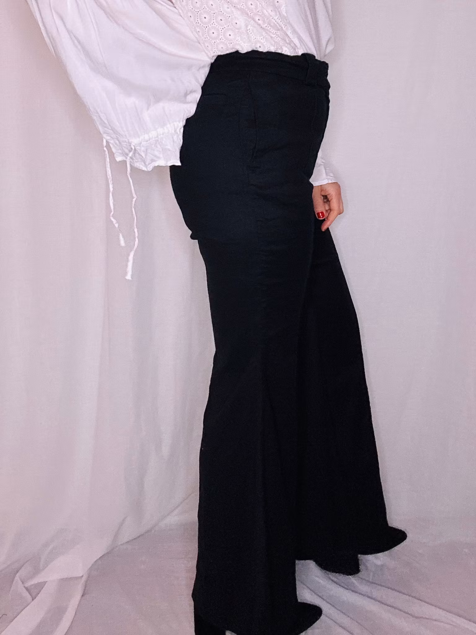 Beskrivning: Svarta kostymbyxor från HM Studio med rejält utsvängda ben. Pressveck och skräddad linning med breda hällor och stängning med hyskor och knapp. Fickor i sidorna och stolpfickor baktill.
