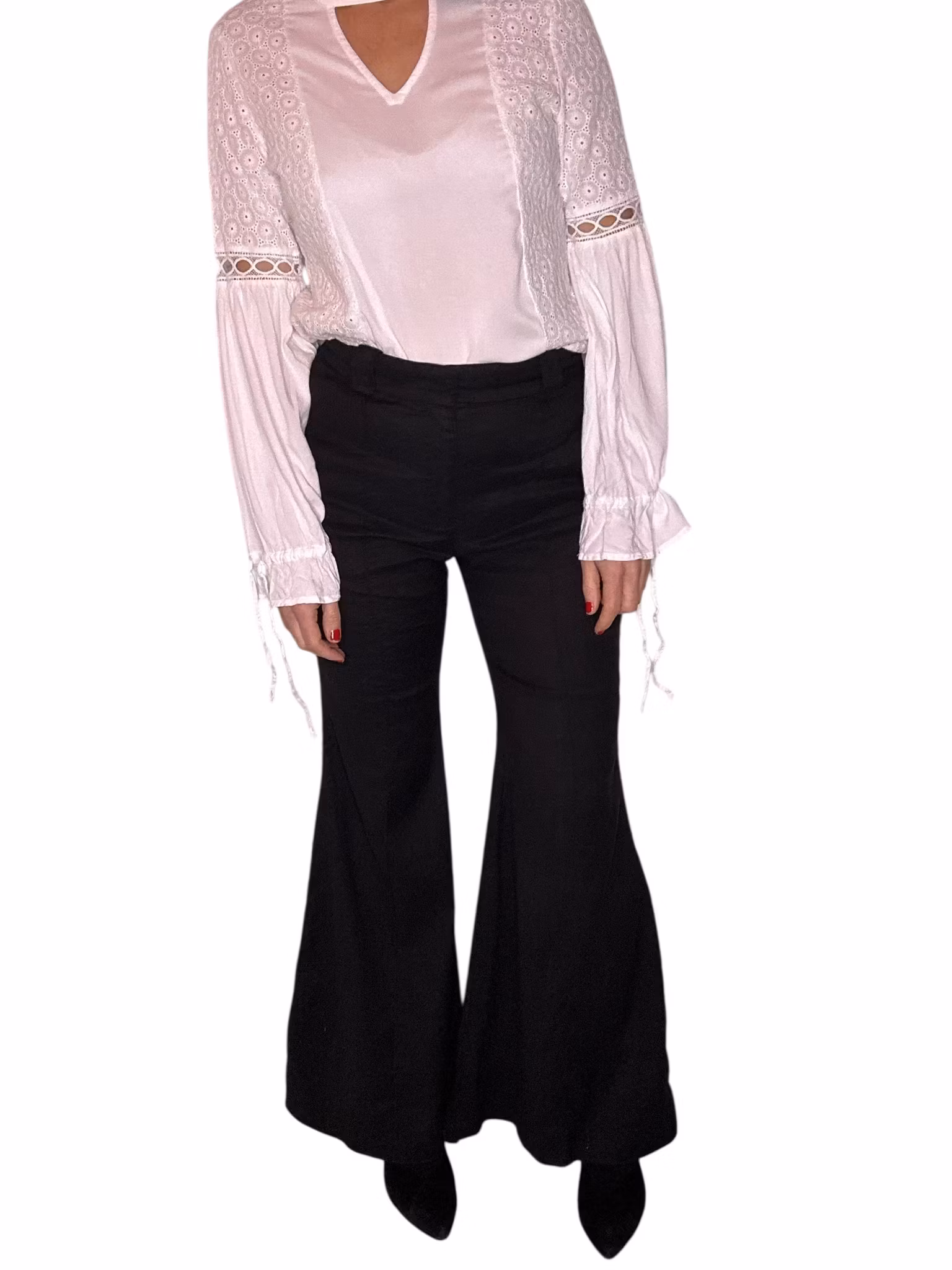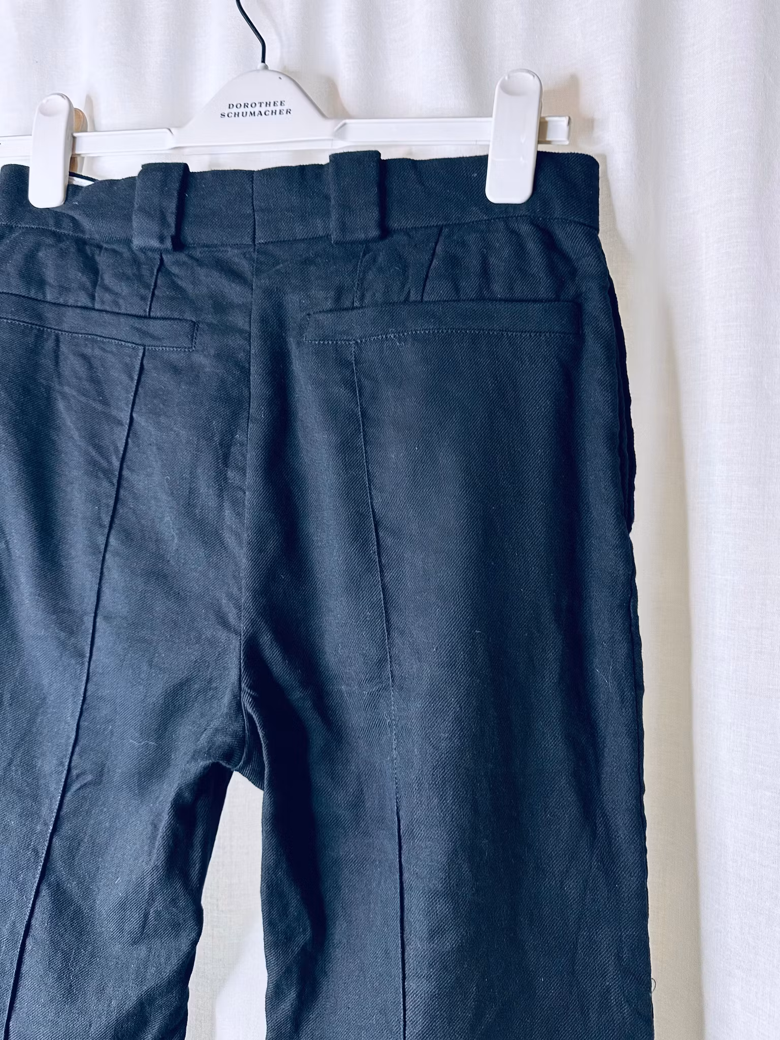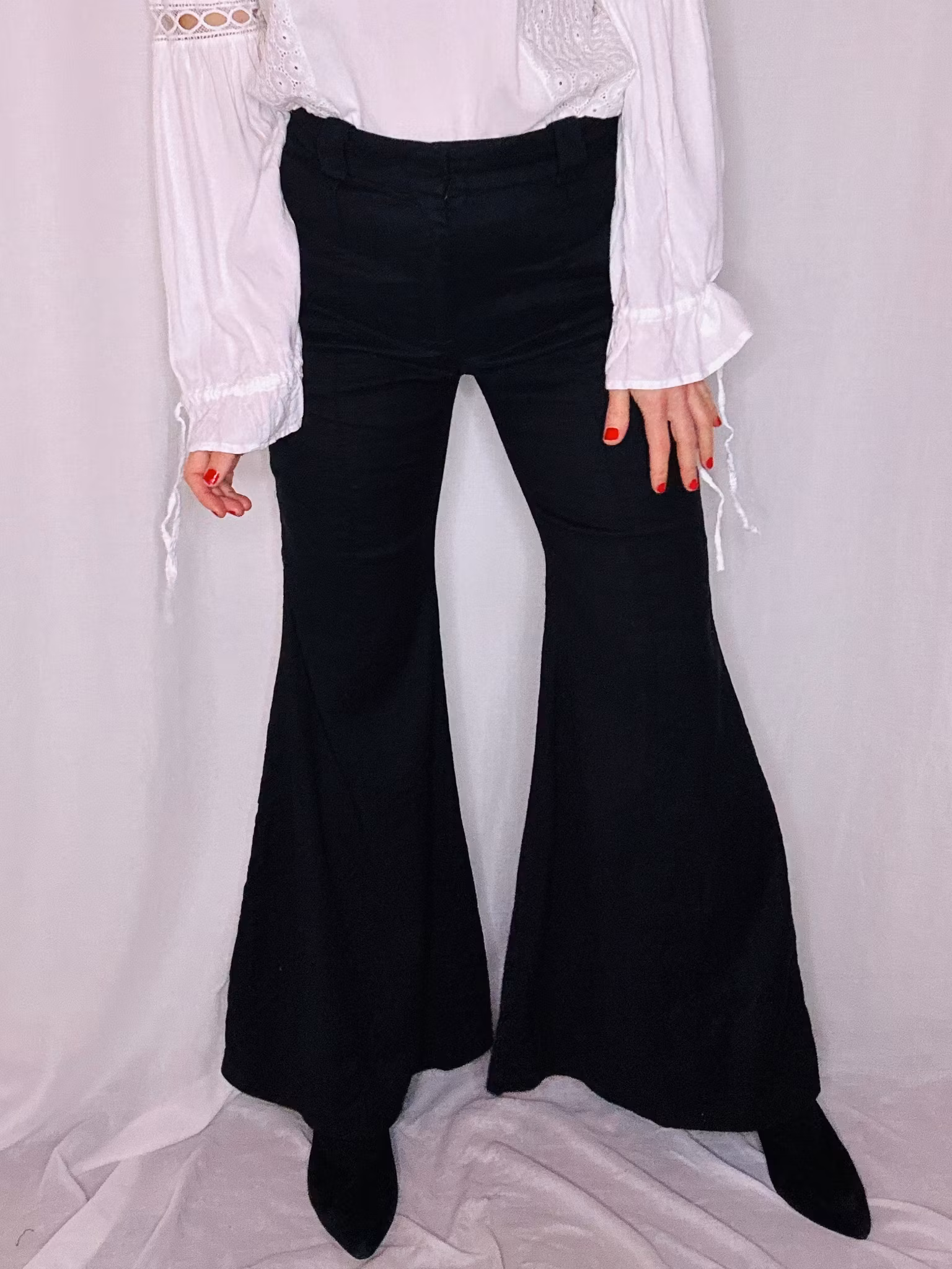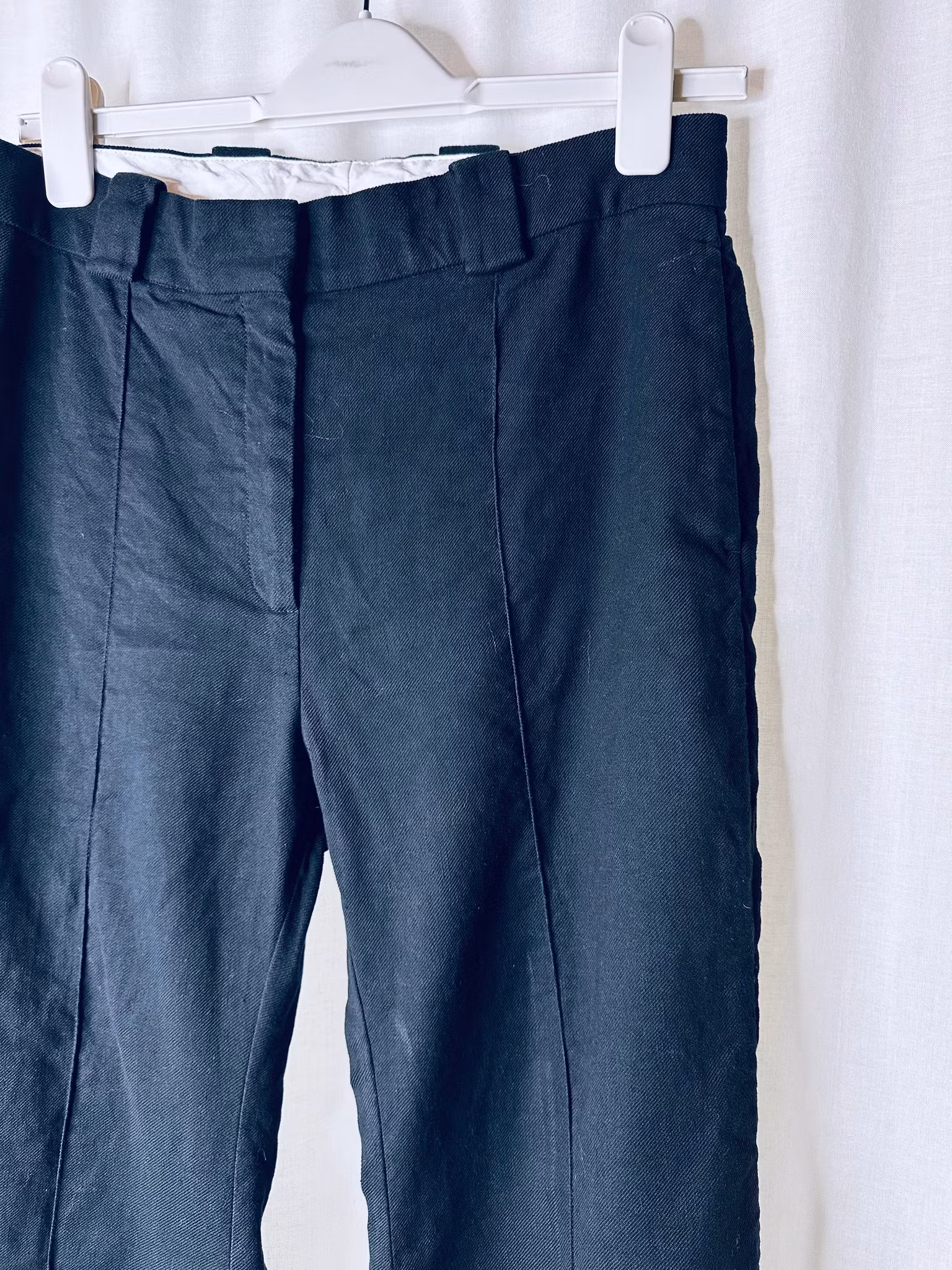 Beskrivning: Svarta kostymbyxor från HM Studio med rejält utsvängda ben. Pressveck och skräddad linning med breda hällor och stängning med hyskor och knapp. Fickor i sidorna och stolpfickor baktill.