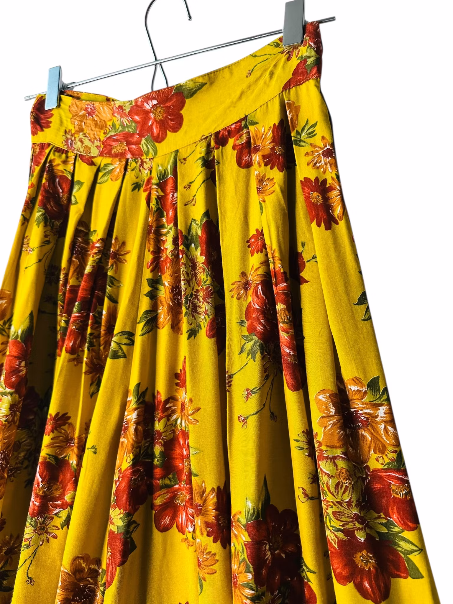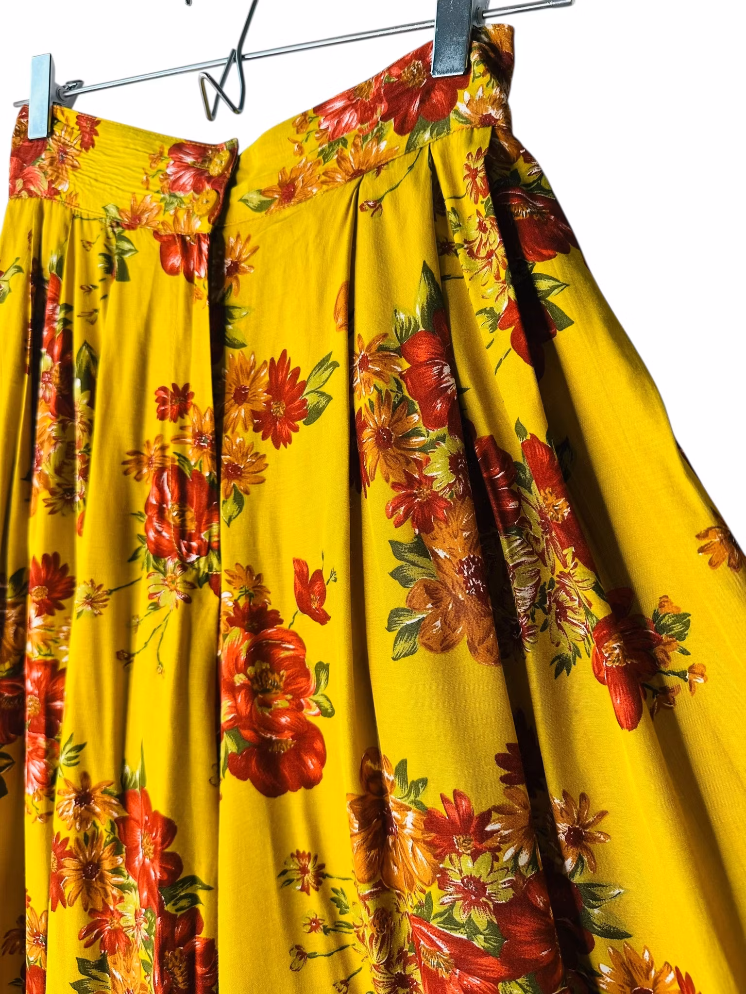 Beskrivning: Italiensk byxkjol i viskos i gult med röda och orange blommor. Hög, veckad midja och sidfickor. Från Pop Eightyfour.