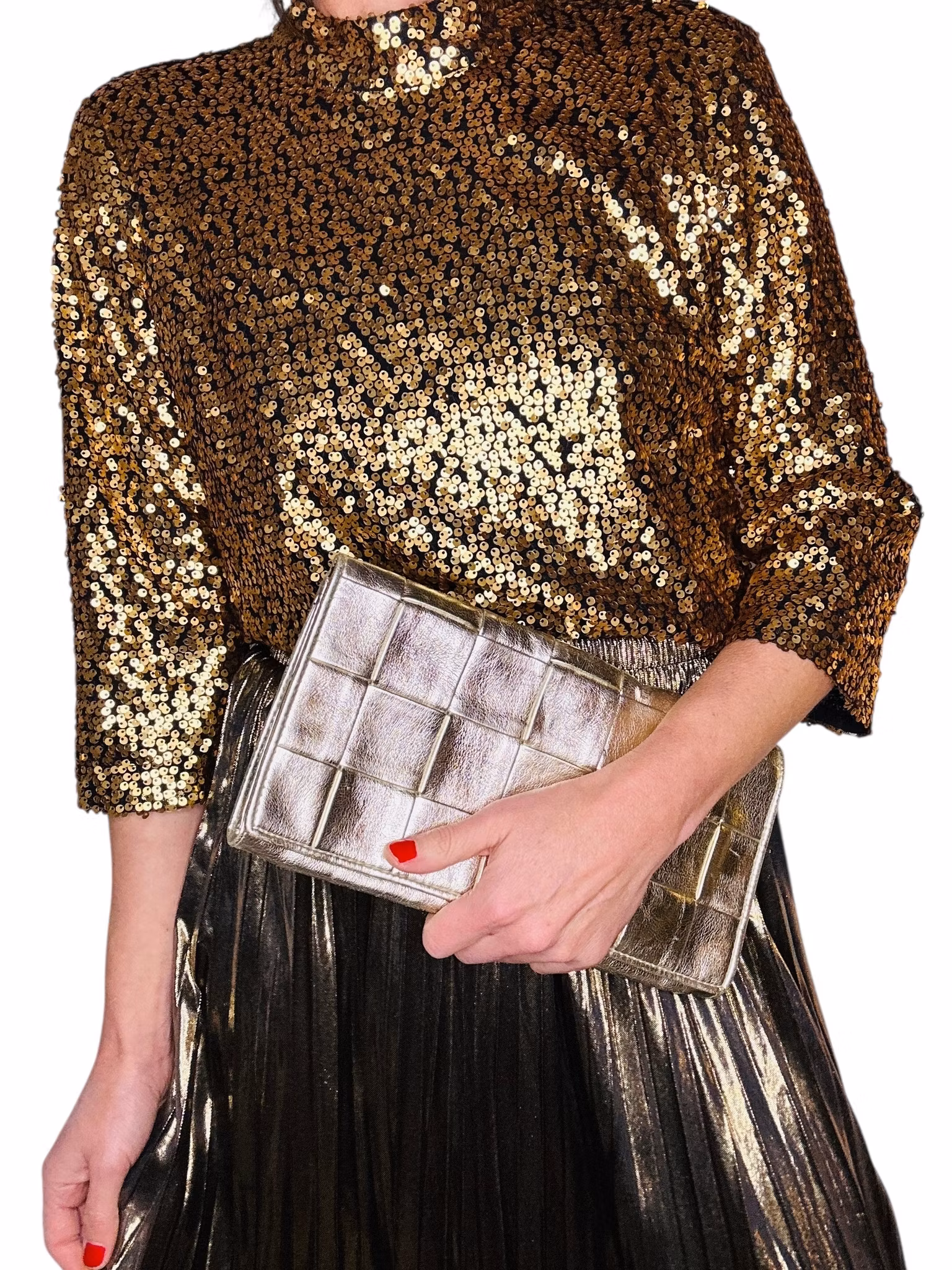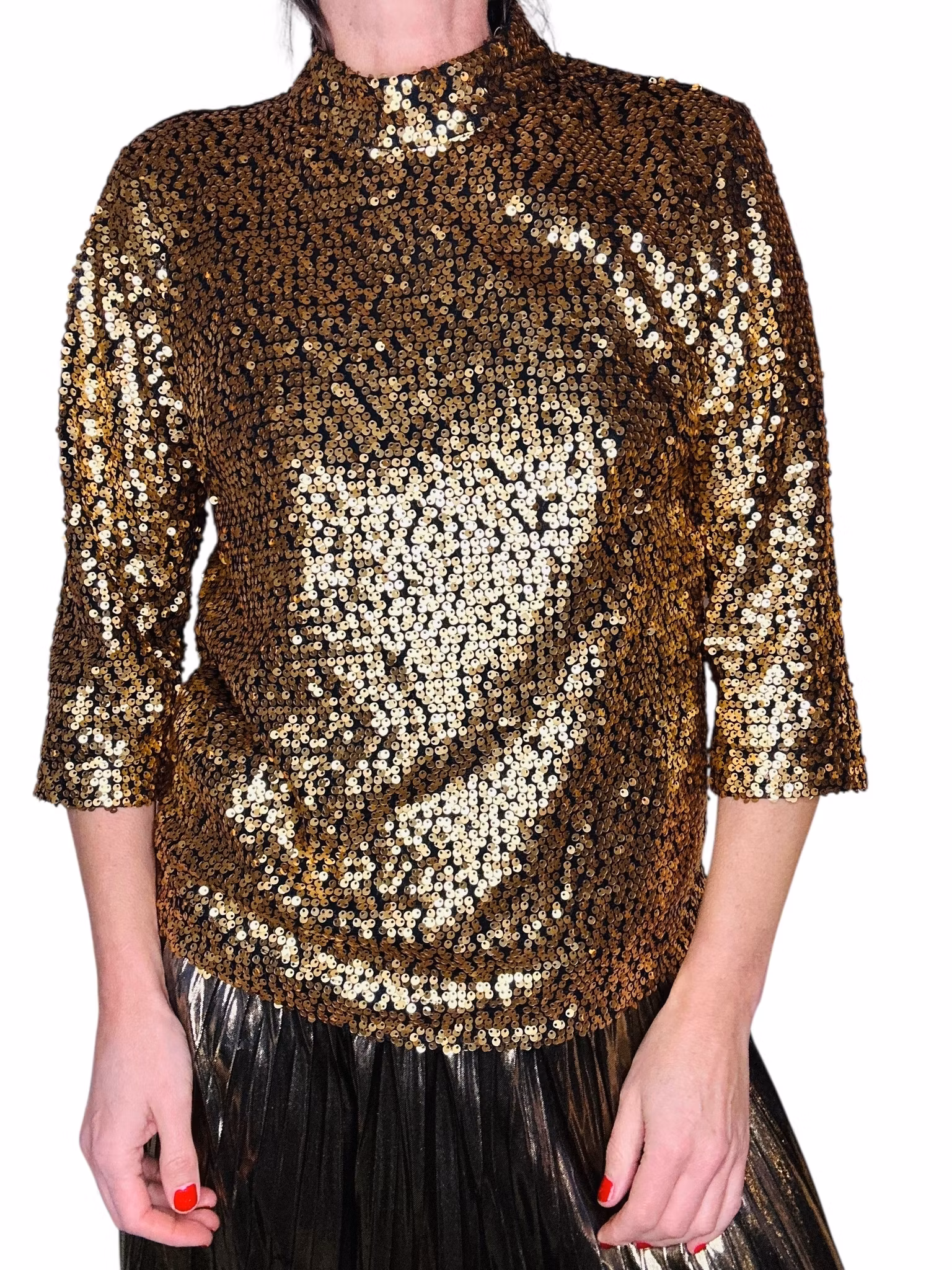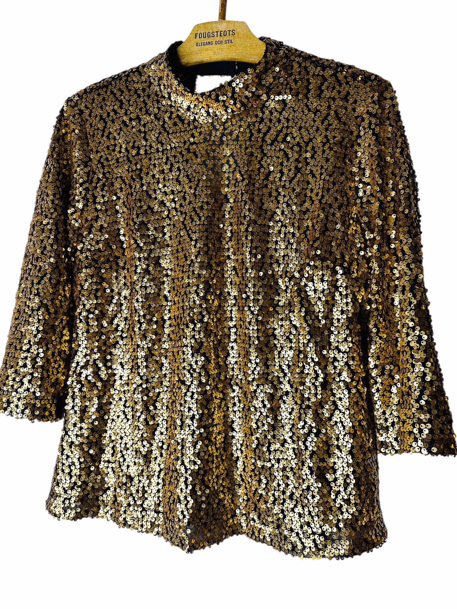 Beskrivning: Guldfärgad topp från numera nedlagda danska Just Female. Rak form, trekvartsärm och en hög krage med trekantig öppning i nacken och stängning med två små knappar. Nypris ca 1200kr.