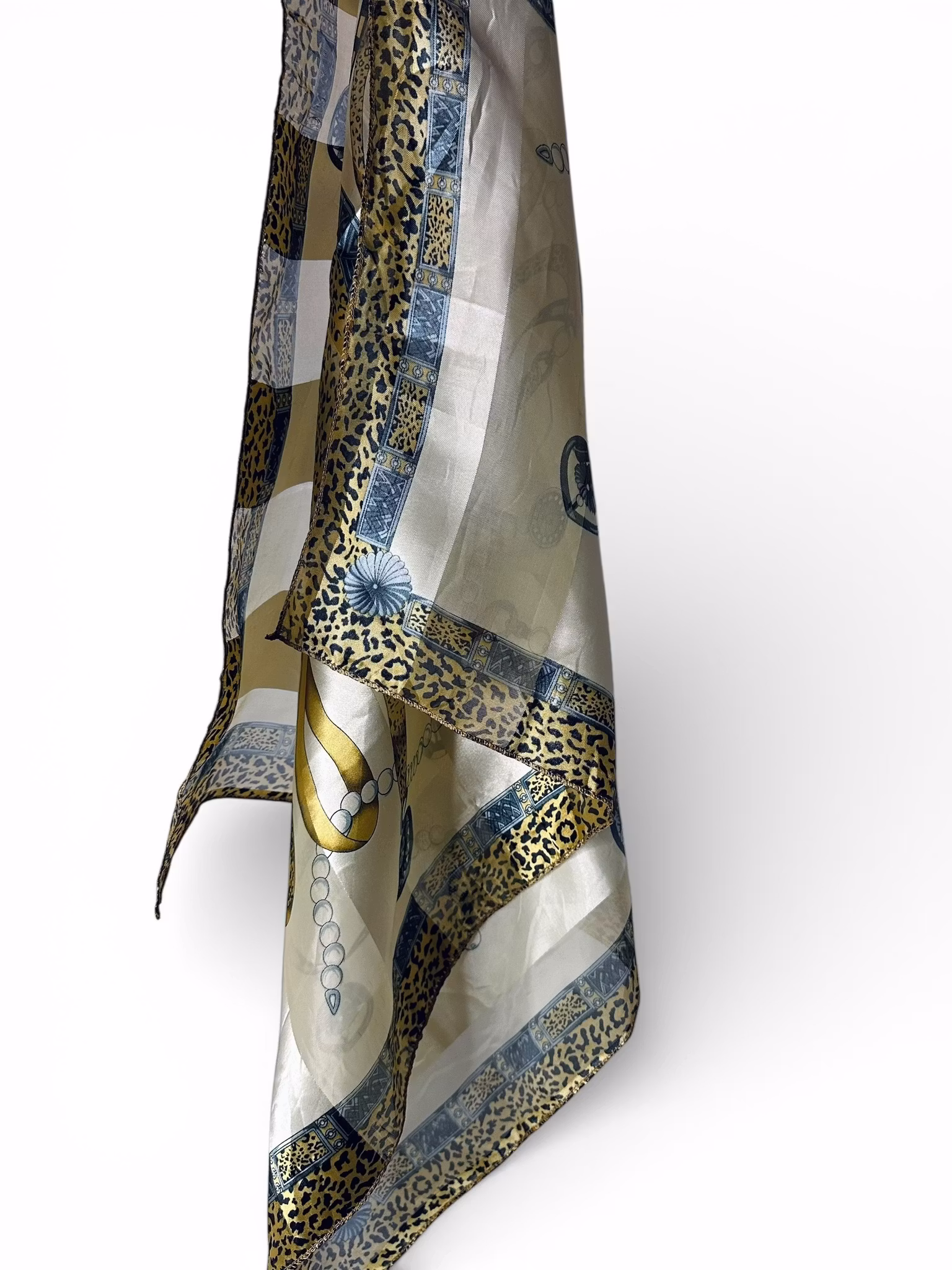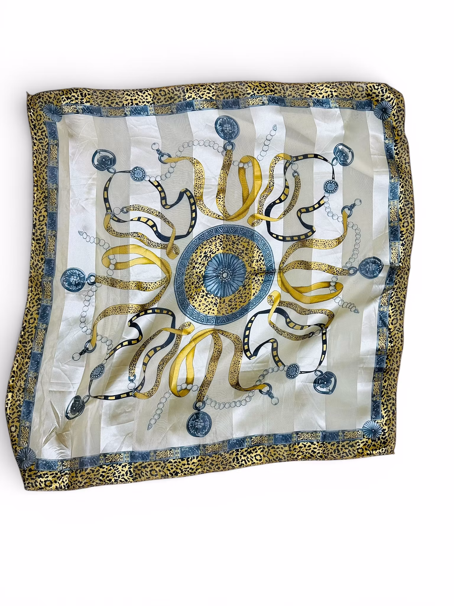 Beskrivning: Vintage fyrkantig scarf med klassiskt mönster på beige botten. Mönster som leo, kedjor, spännen och pärlband.