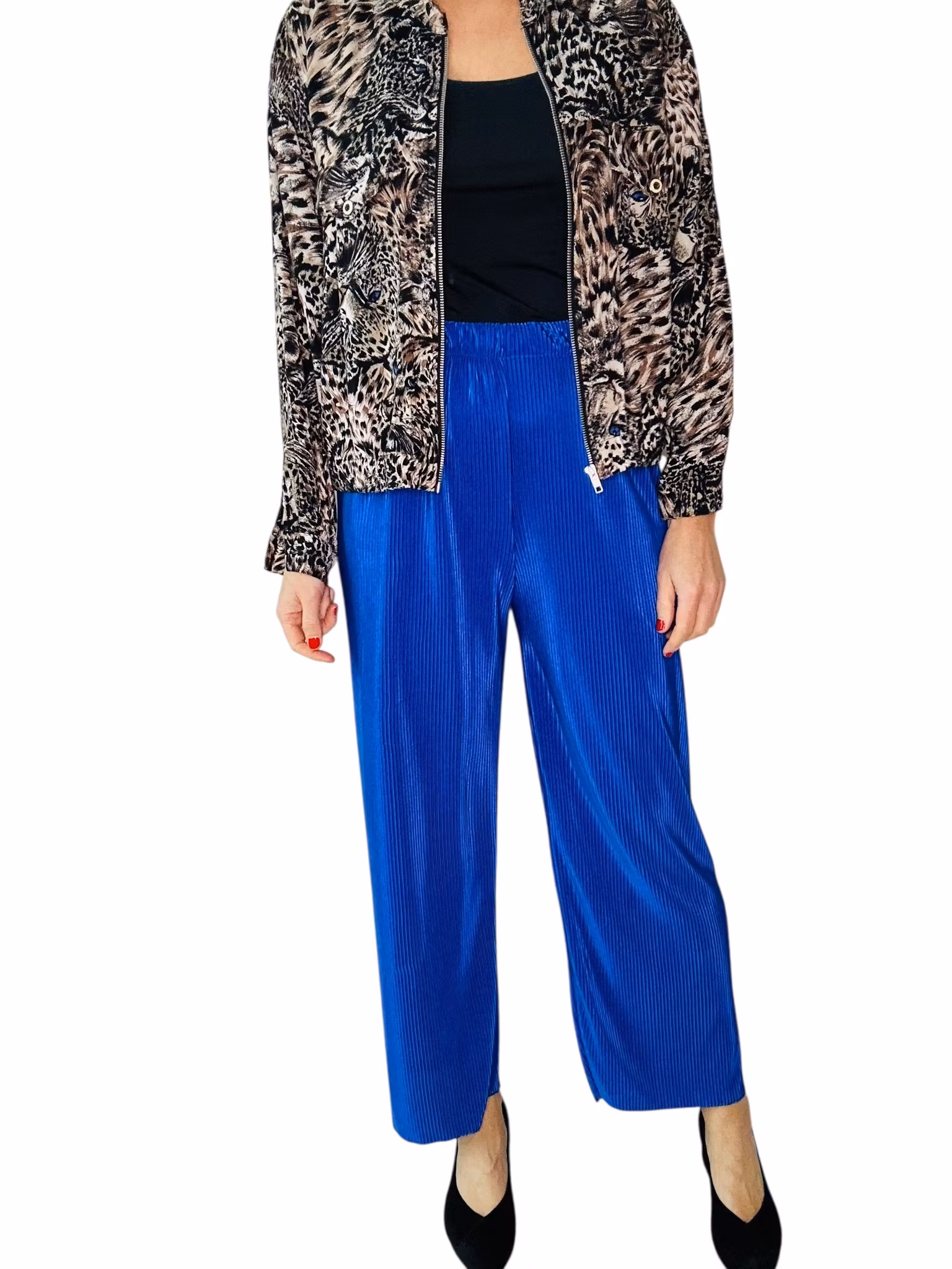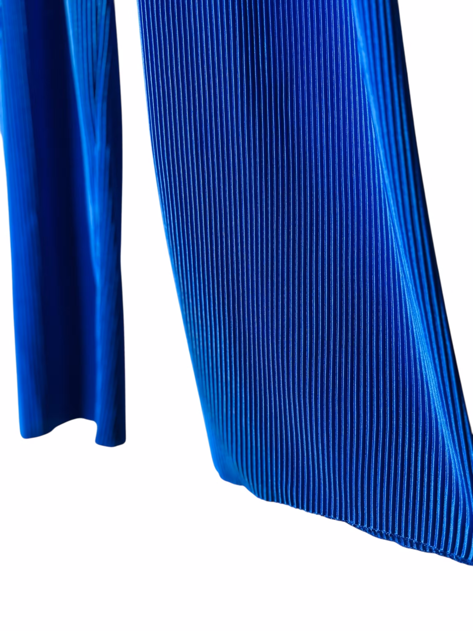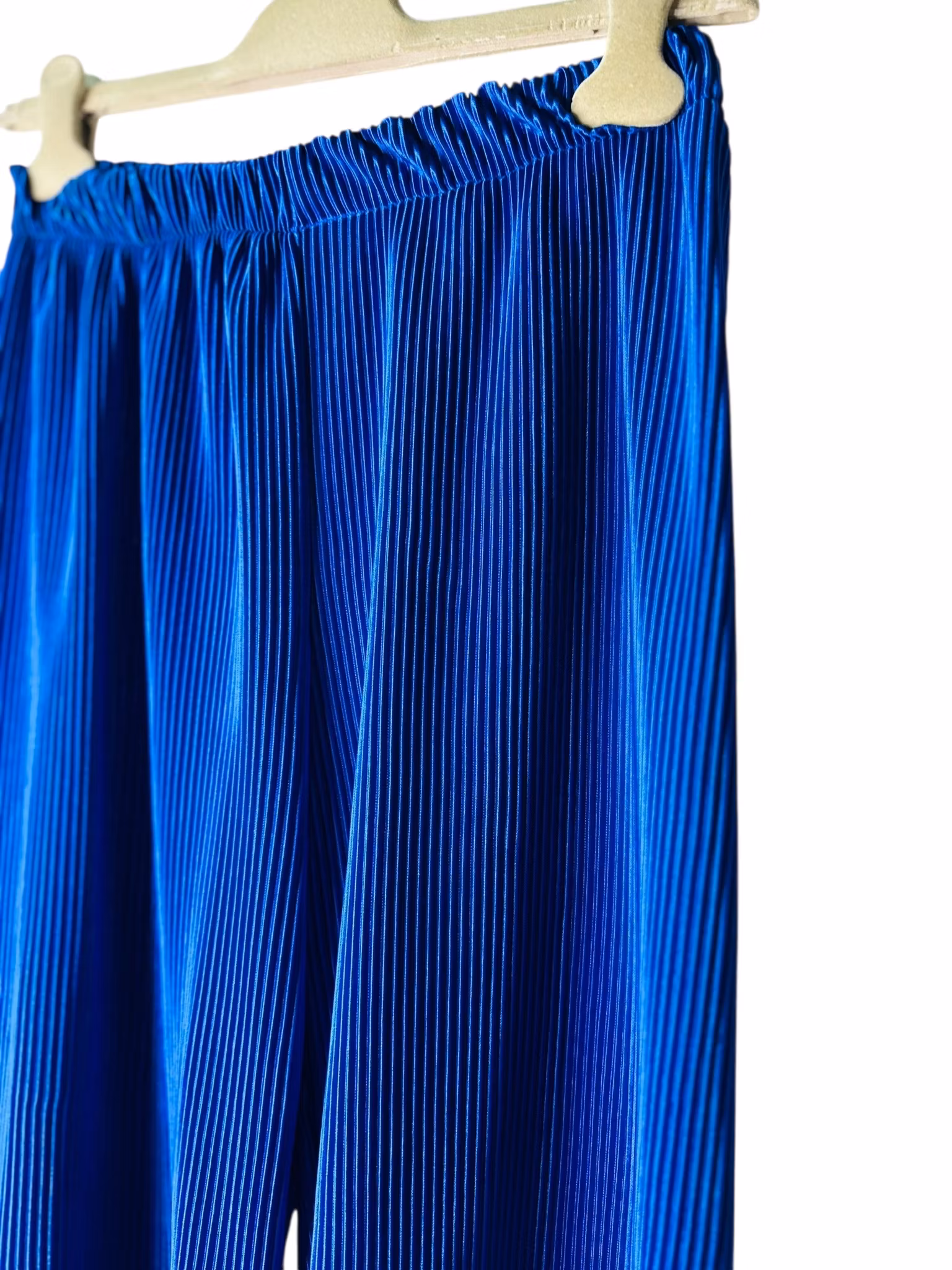 Beskrivning: Kanske världens bekvämaste bralla! Dessa plisserade blanka byxorna funkar både som lounge och till jobb och fest! Här i kornblått med vida ben. Uppfattas som något liten i storlek.