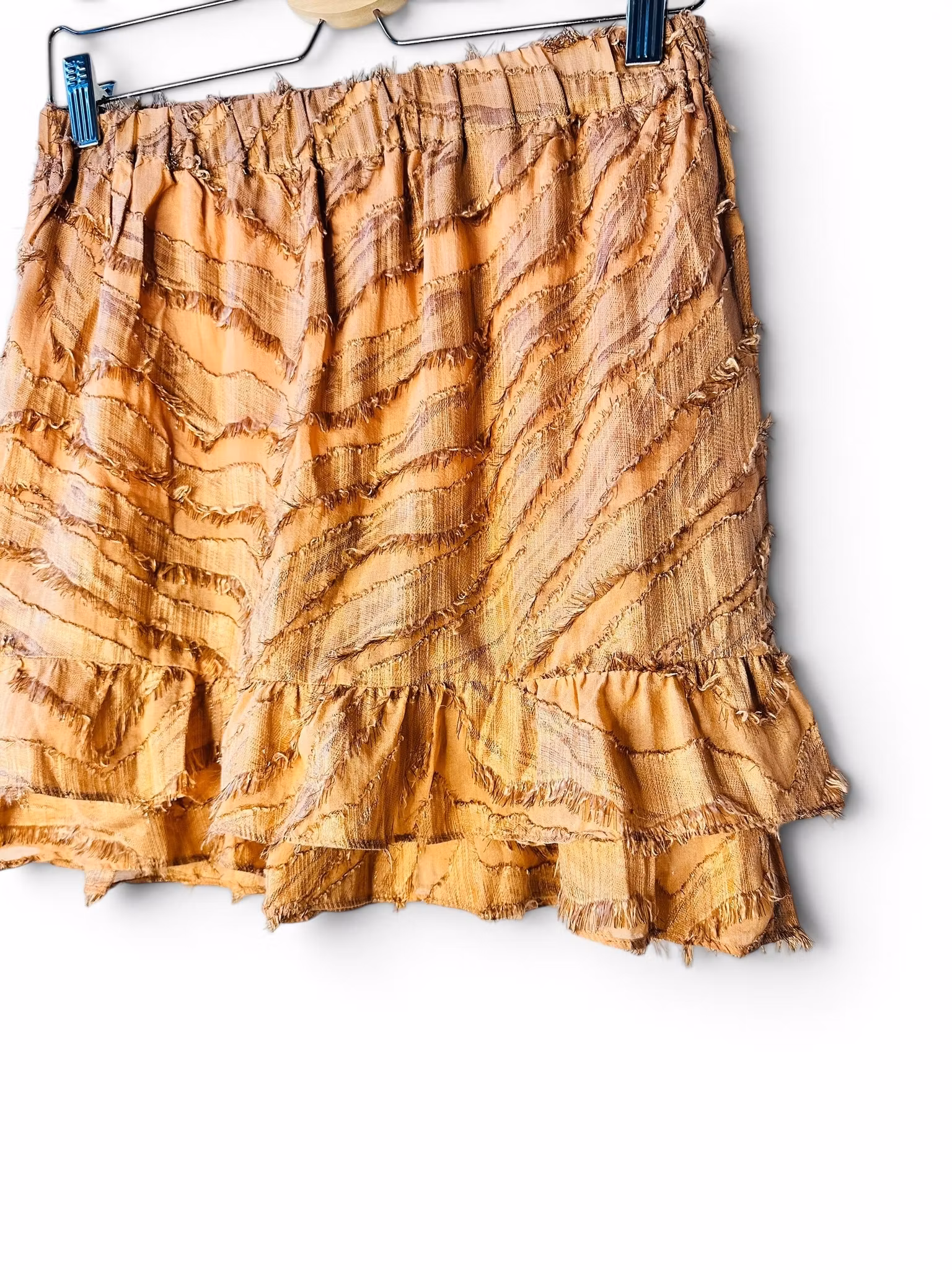 Beskrivning: En kjol med det lilla extra – både i känsla och detaljer. Den här modellen från Second Female är gjord i en lyxig sidenmix (70% siden) som ger ett vackert fall och en lätt, exklusiv känsla mot huden. Designen sticker ut med sin strukturerade yta och fransade partier som skapar liv och rörelse i tyget. Den varma karamelltonen gör den enkel att matcha, medan volangkanten ger en feminin silhuett. Elastisk midja för en bekväm passform som funkar lika bra till vardag som till fest. En sån där kjol som känns genomtänkt – men ändå effortless. Nypris ca 1200kr.