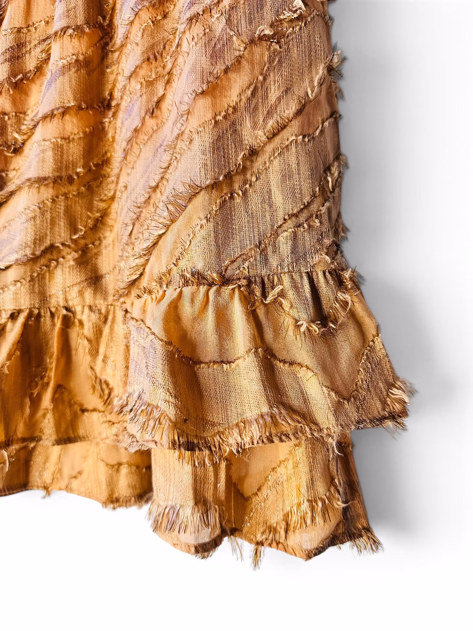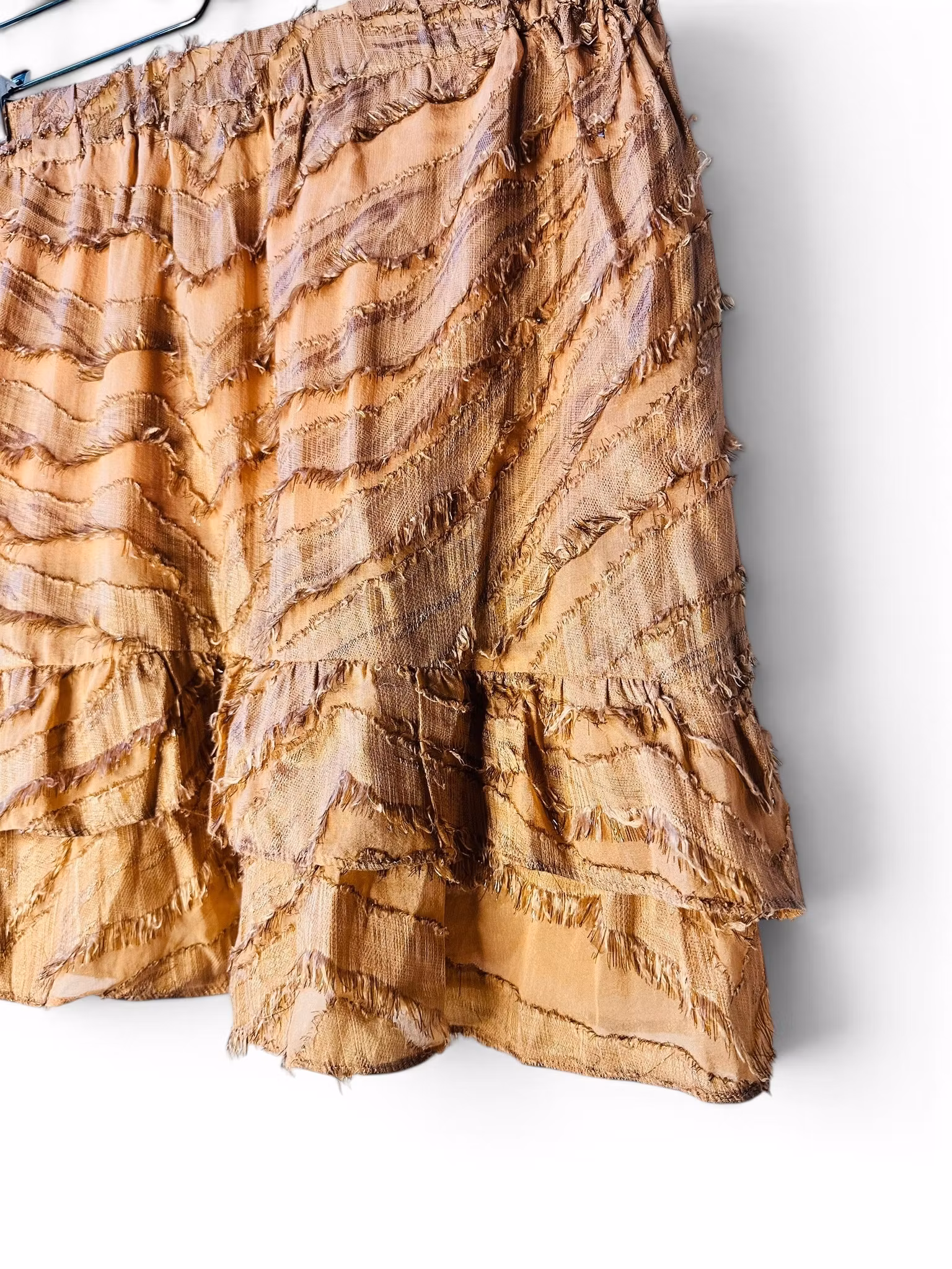 Sökord: Second Female kjol, sidenkjol dam, texturerad kjol, bohemisk kjol, volangkjol dam, silk mix skirt, brun kjol dam, unik kjol second hand, vintage sidenkjol, skandinavisk design kjol