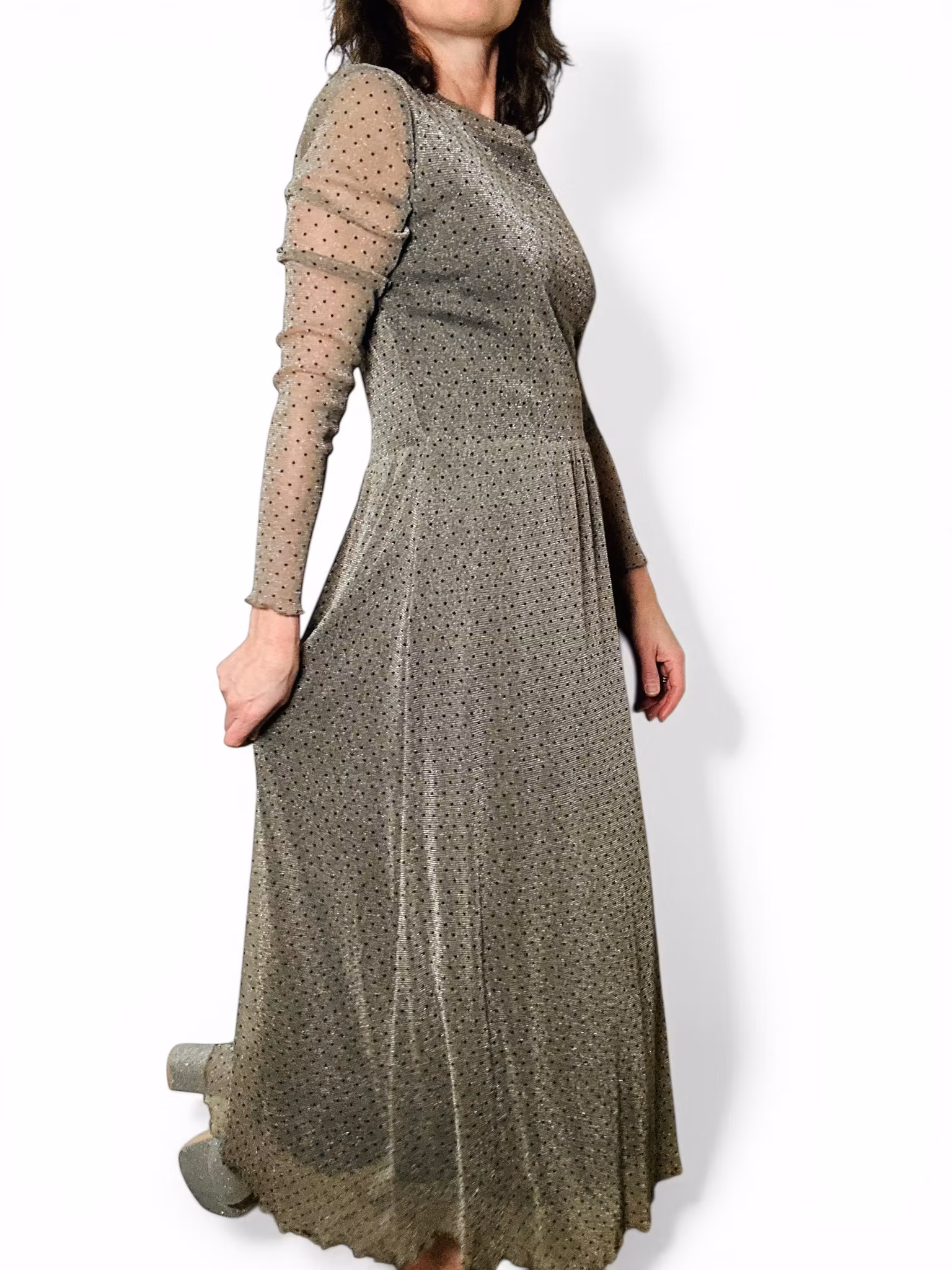 Beskrivning: Lång, glittrig och stretchig klänning från danska Moves. Översta tyget är transparent och hela klänningen utom ärmarna är foddrade. Tyget är guldigt och glittrigt med små prickar. Elastisk midja.