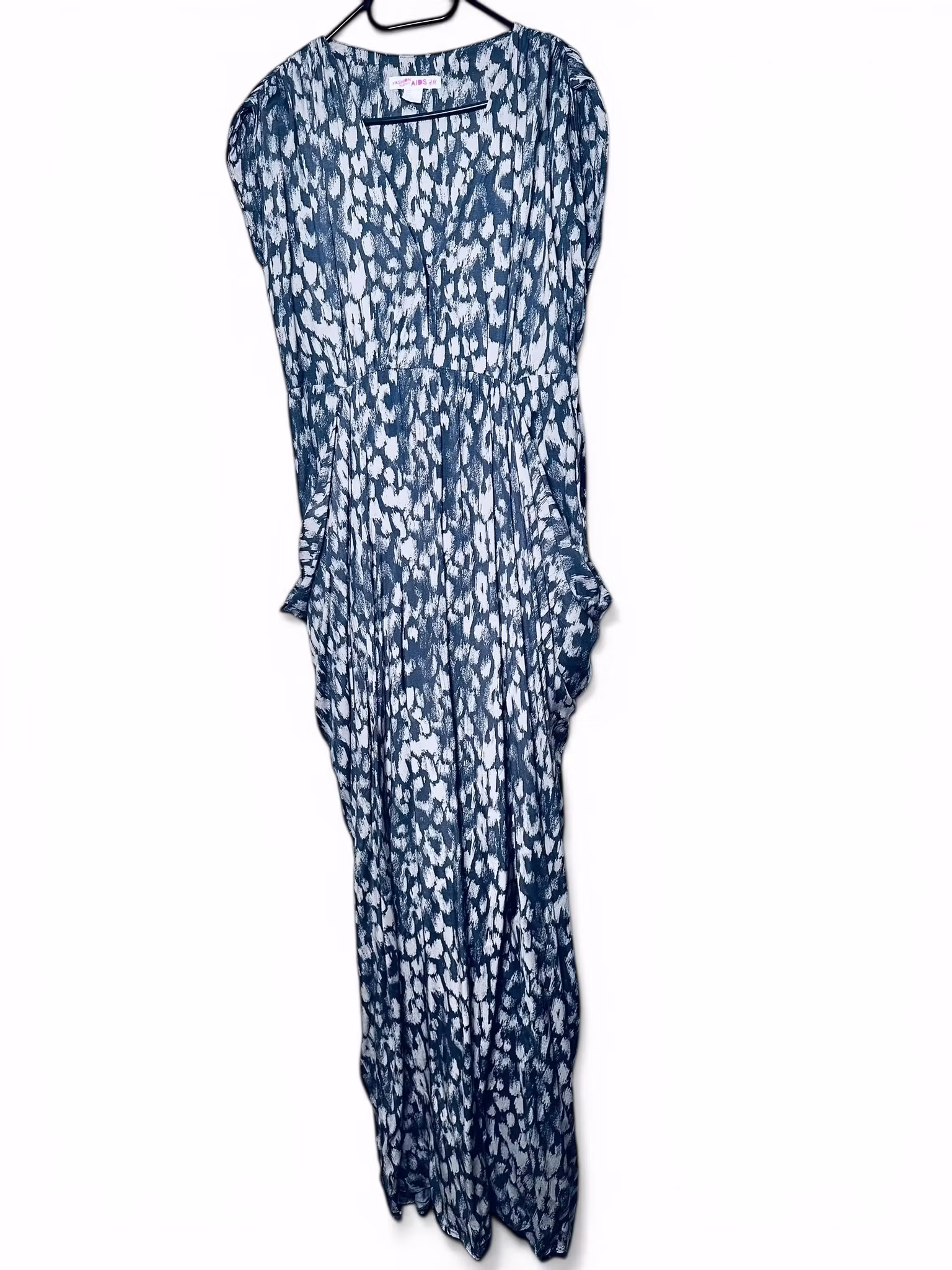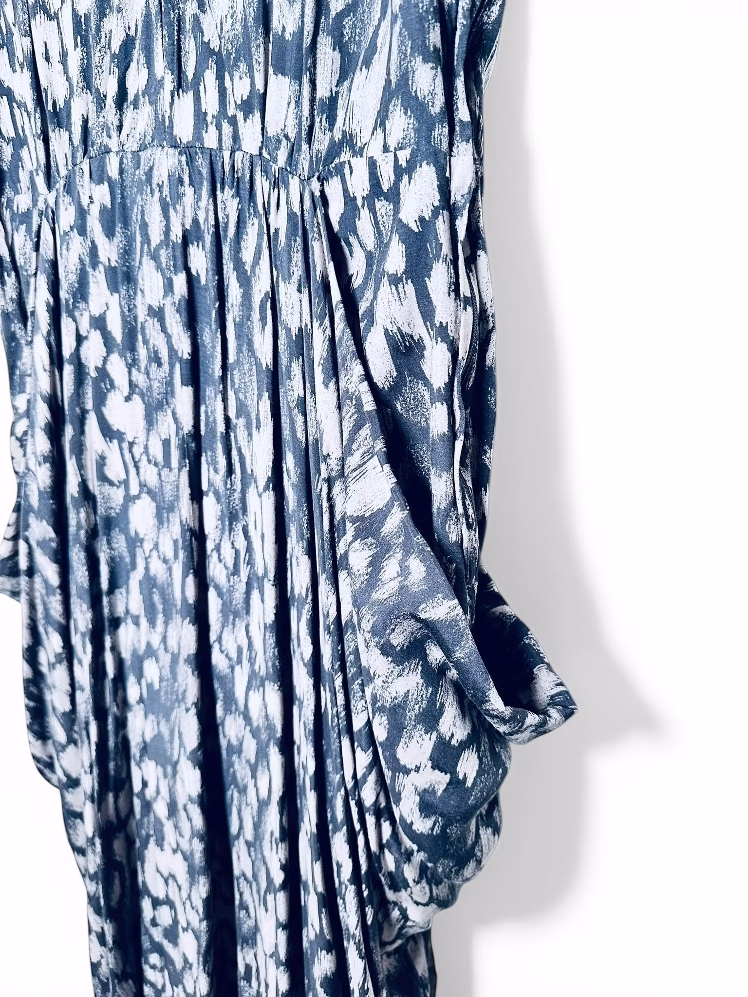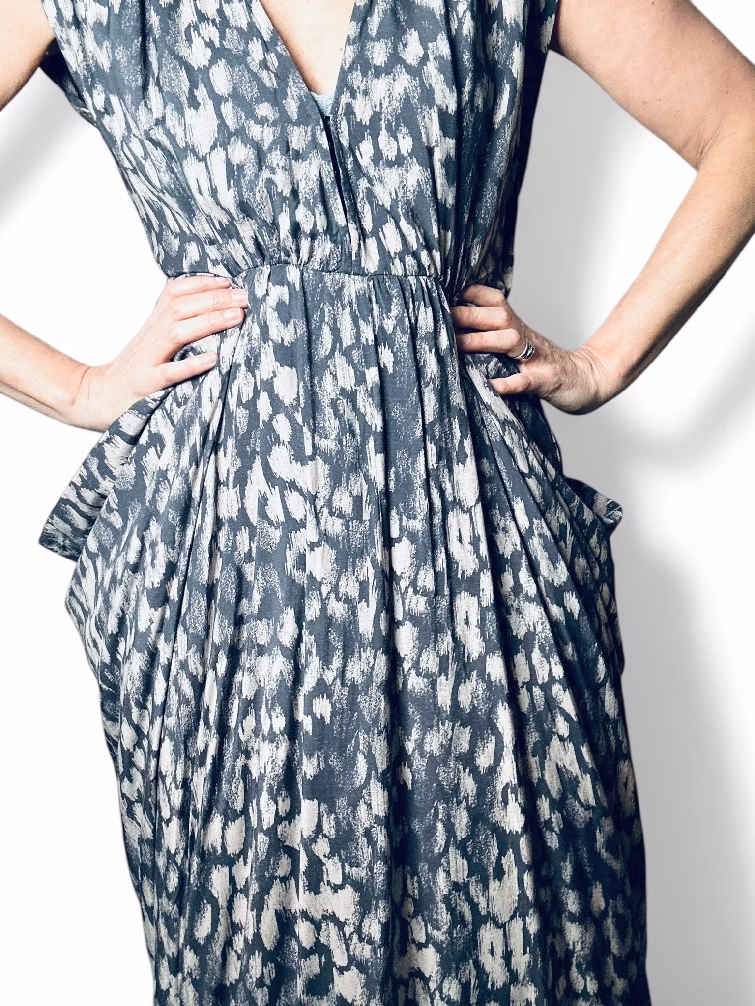 Beskrivning: En lång viskosklänning från HMs under 00-10-talet återkommande kollektion Fashion Against Aids. Denna är från 2010 när de satsade på festivaltema. Klänningen är i mönstrad viskos med vackra veck vid axeln och dramatiska draperingar över höfterna. Stängs med dragkedja i sidan.