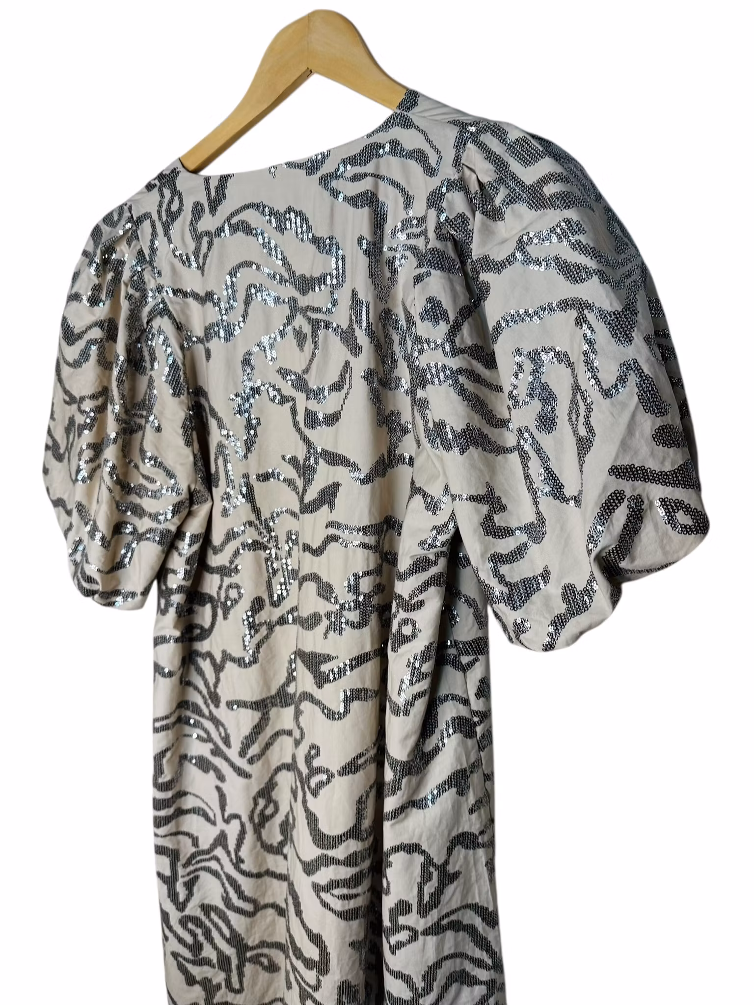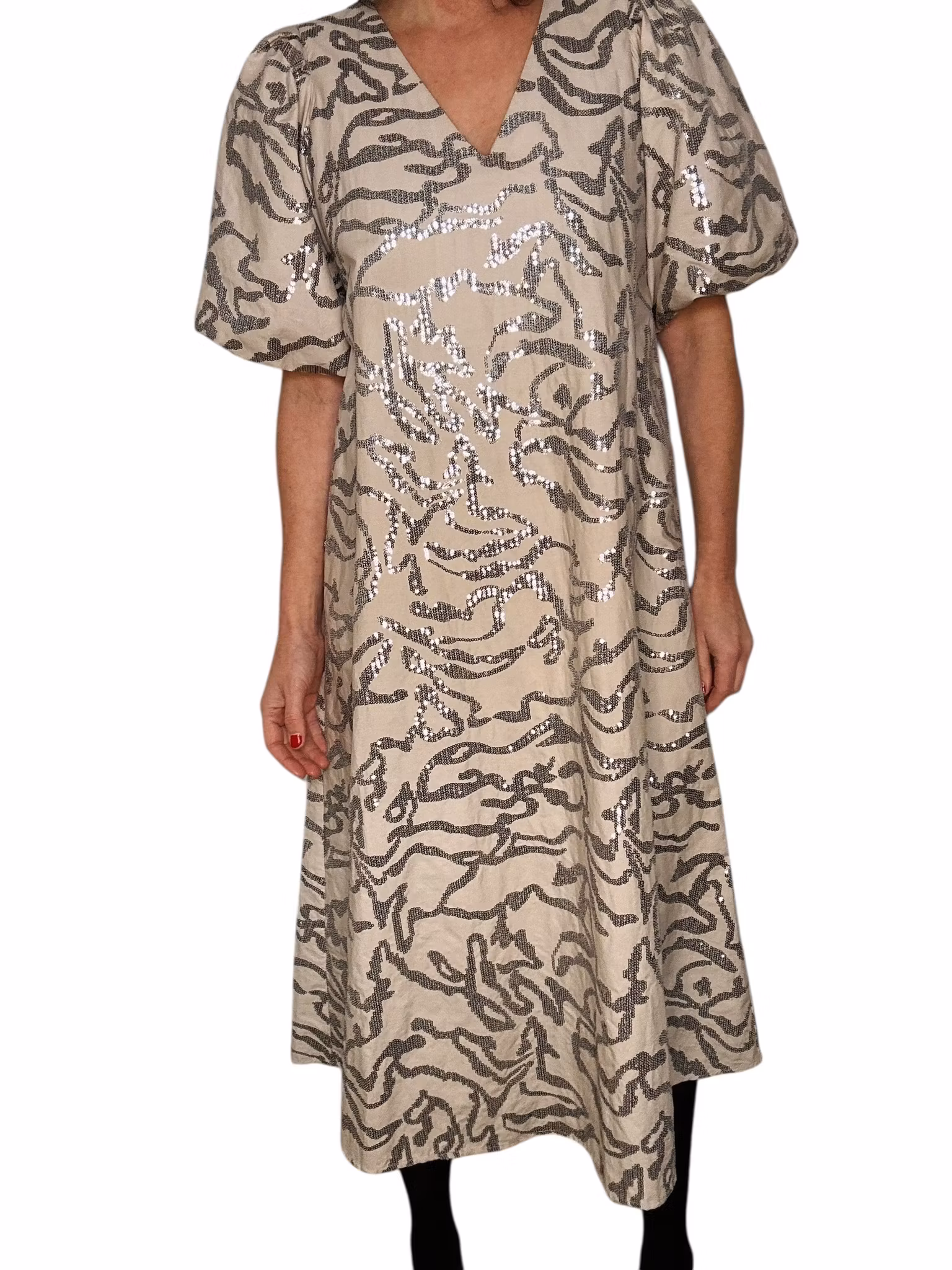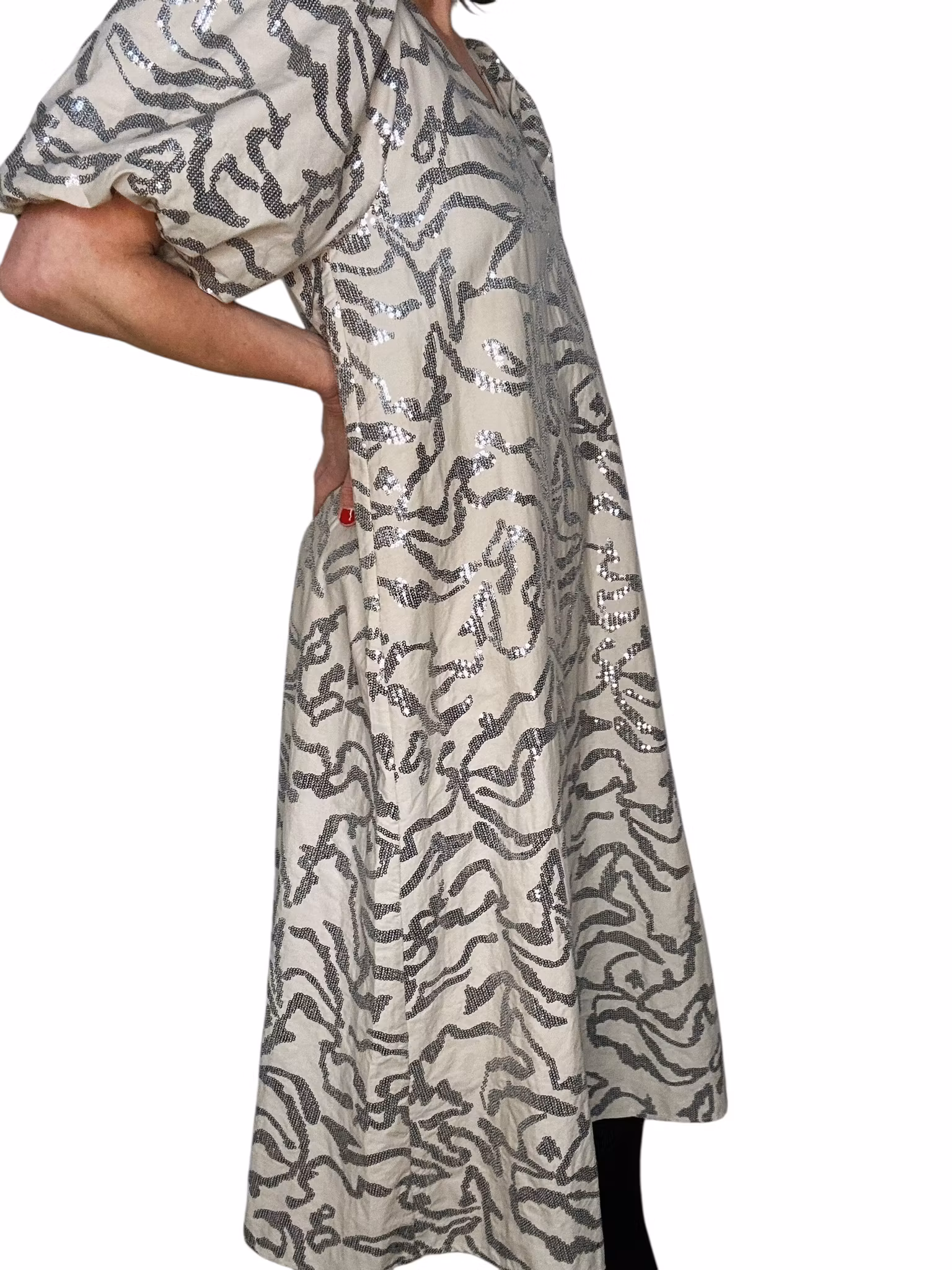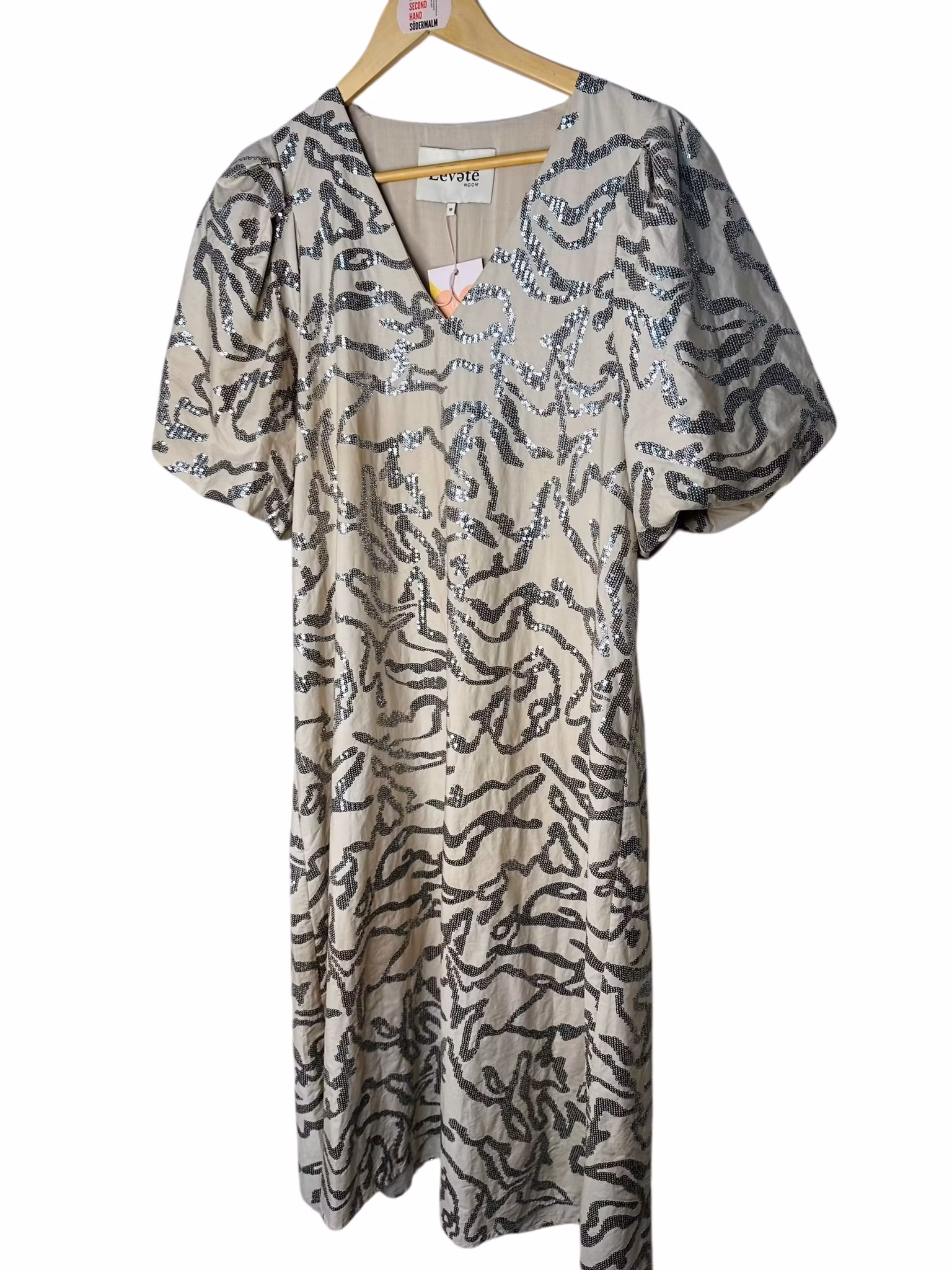 Beskrivning: En paljettklänning i bomull? Ja men hur fiffigt? Särskilt som denna har puffärmar som verkligen kommer till sin rätt i det lite stadigare bomullstyget. Fint också med den naturfärgade botten mot de metallicskimrande paljetterna som är sydda i ett vackert mönster över hela klänningen. Från danska Leveté Room. I nyskick. Nypris ca 1500kr.