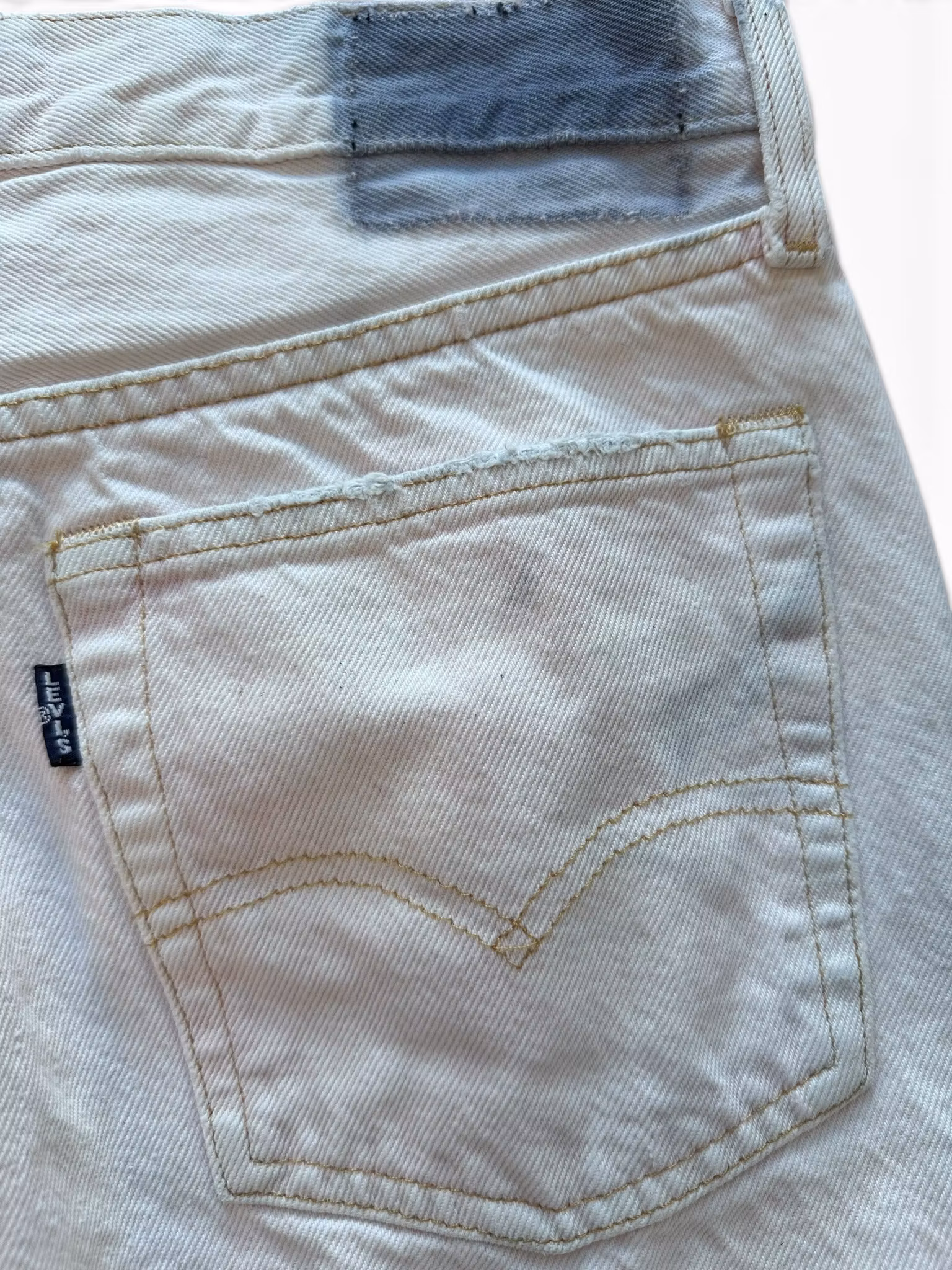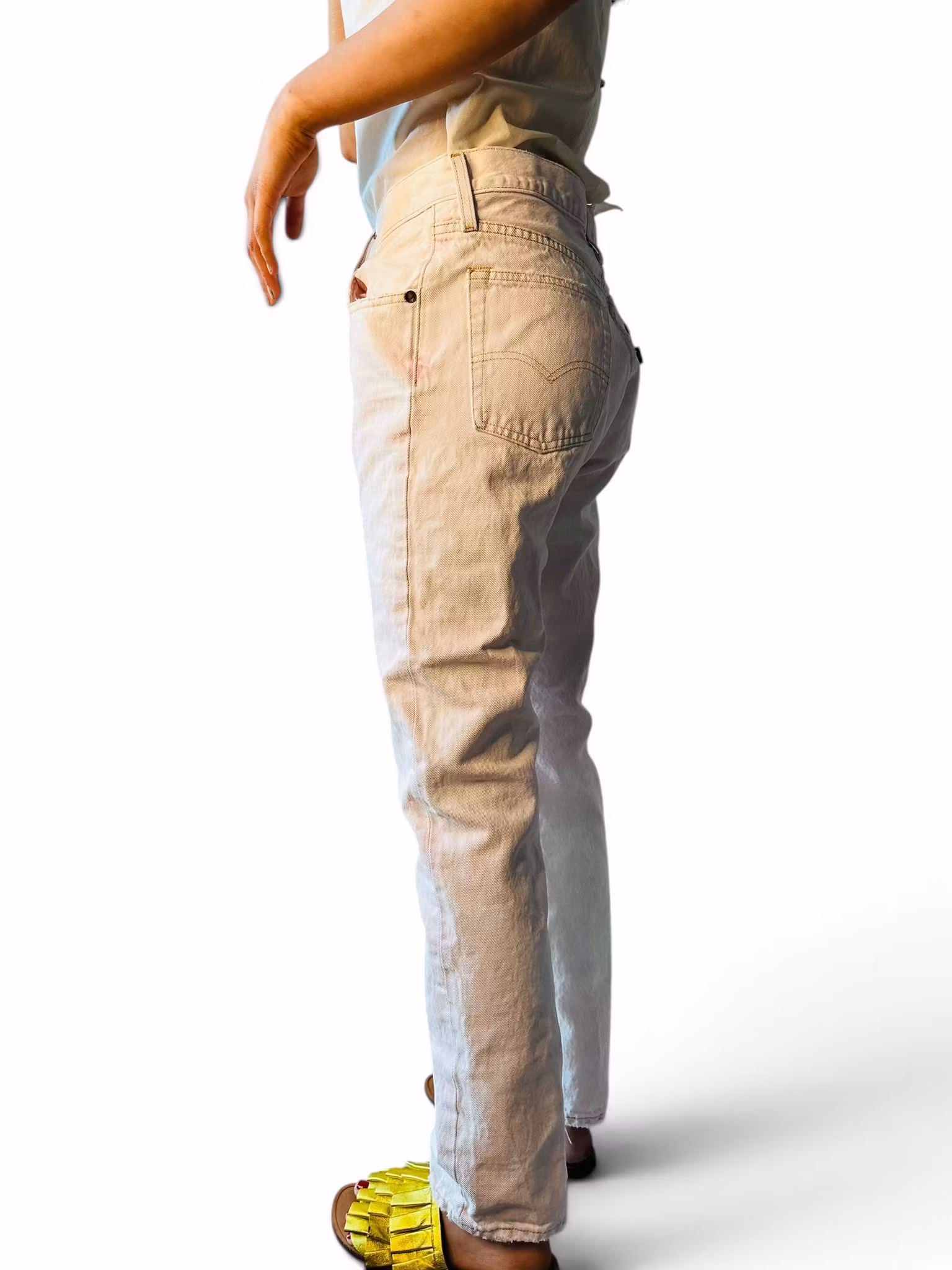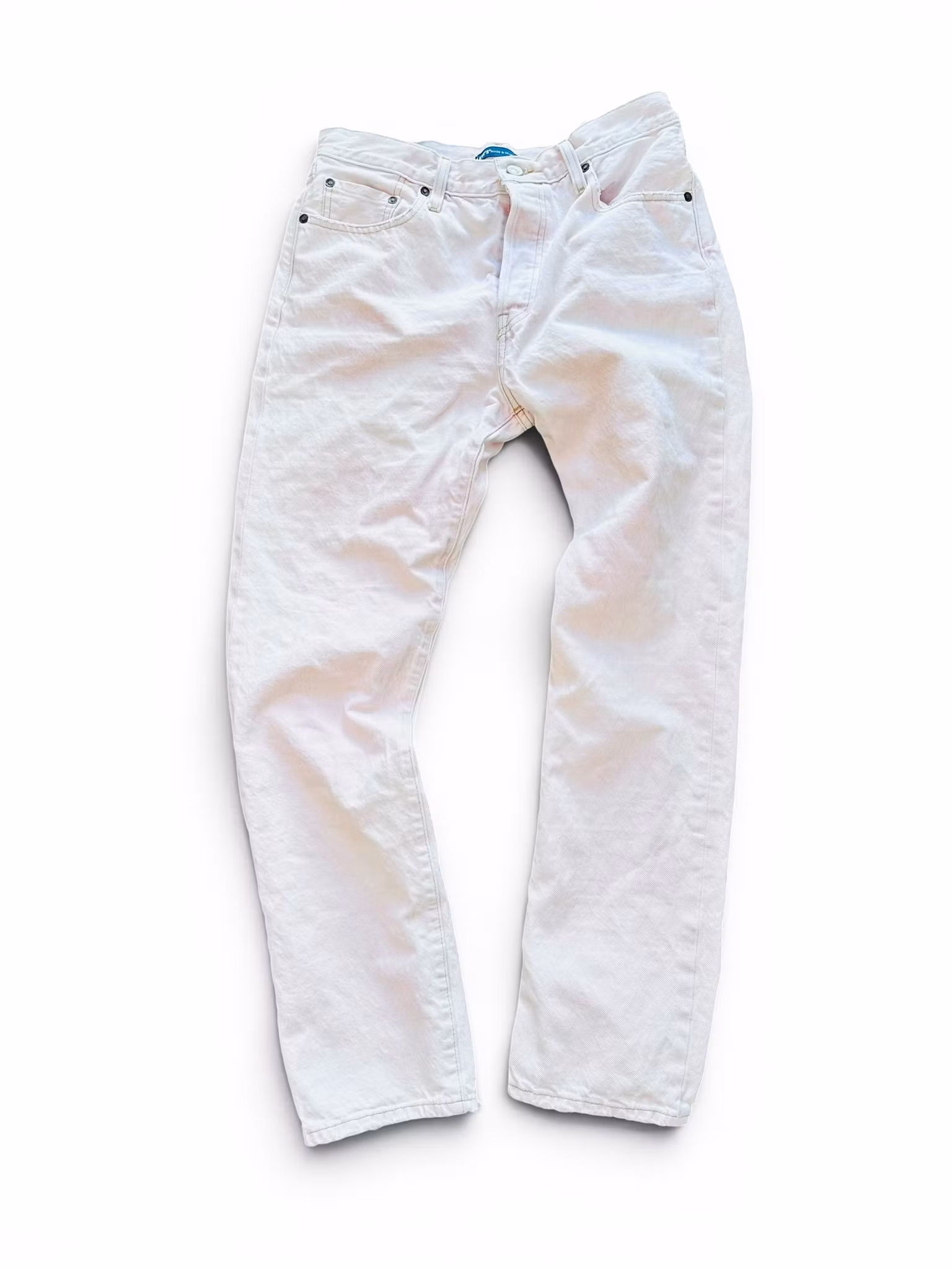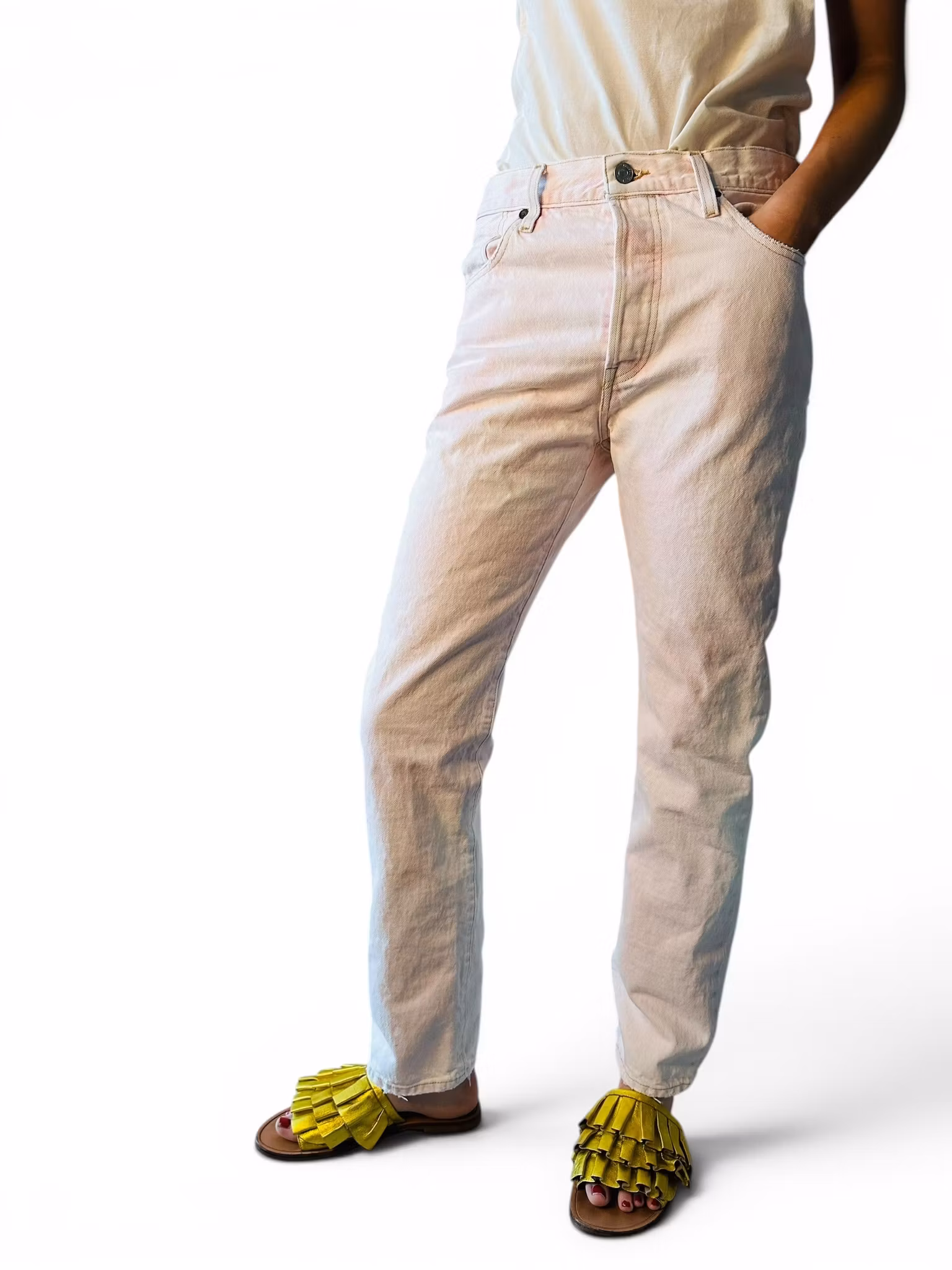 Beskrivning: Ett par klassiska Levi's 501 Original i vit/rosa denim. Den ikoniska raka modellen möter en mjukt infärgad ton i rosa/ljus pastell som ger jeansen ett unikt, nästan handfärgat uttryck. Tillverkade i kraftig bomullsdenim med den klassiska 501-passformen: rak i benet, något högre midja och knappgylf. Slitningarna och färgskiftningarna ger karaktär. Troligen 2000-2010-tal.