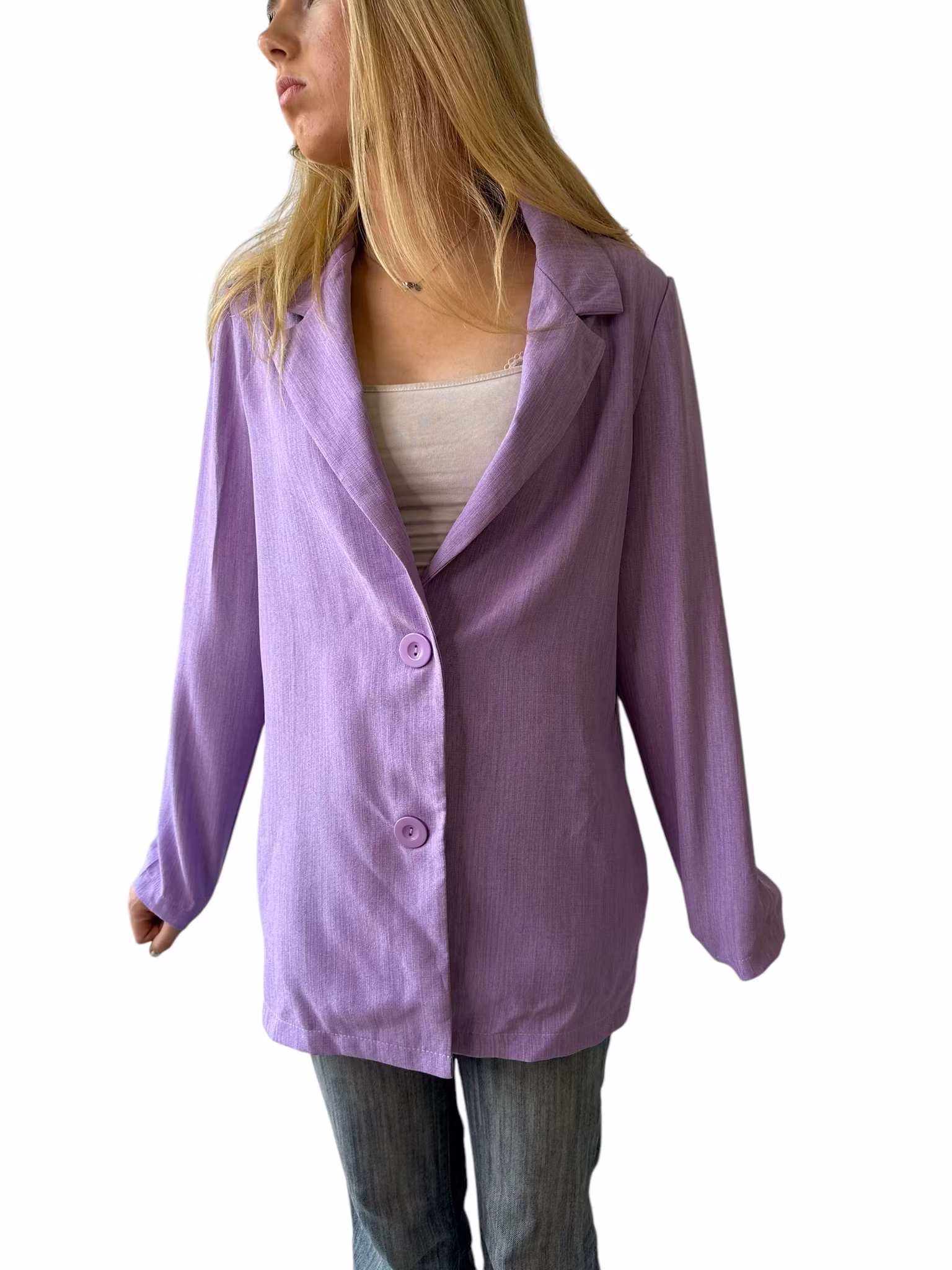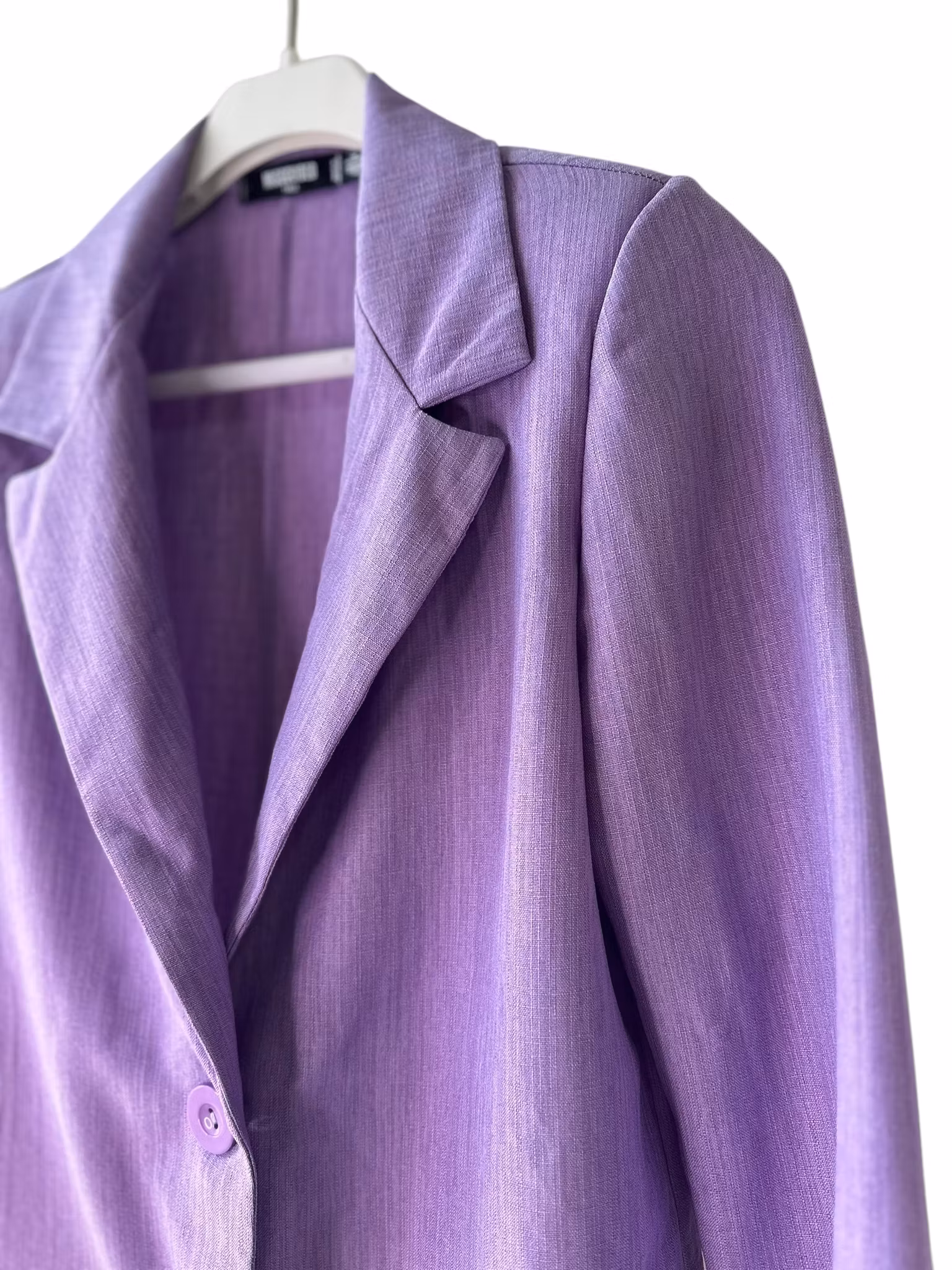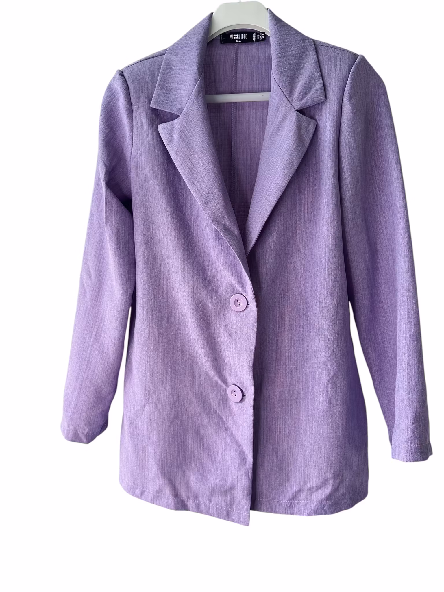 Beskrivning: Lavendellilla kavaj i material med lite struktur. Ofodrad och utan fickor stängs den med två stora knappar mitt fram. Axelvaddar bidrar till en snygg silhuett. Från Missguided.
