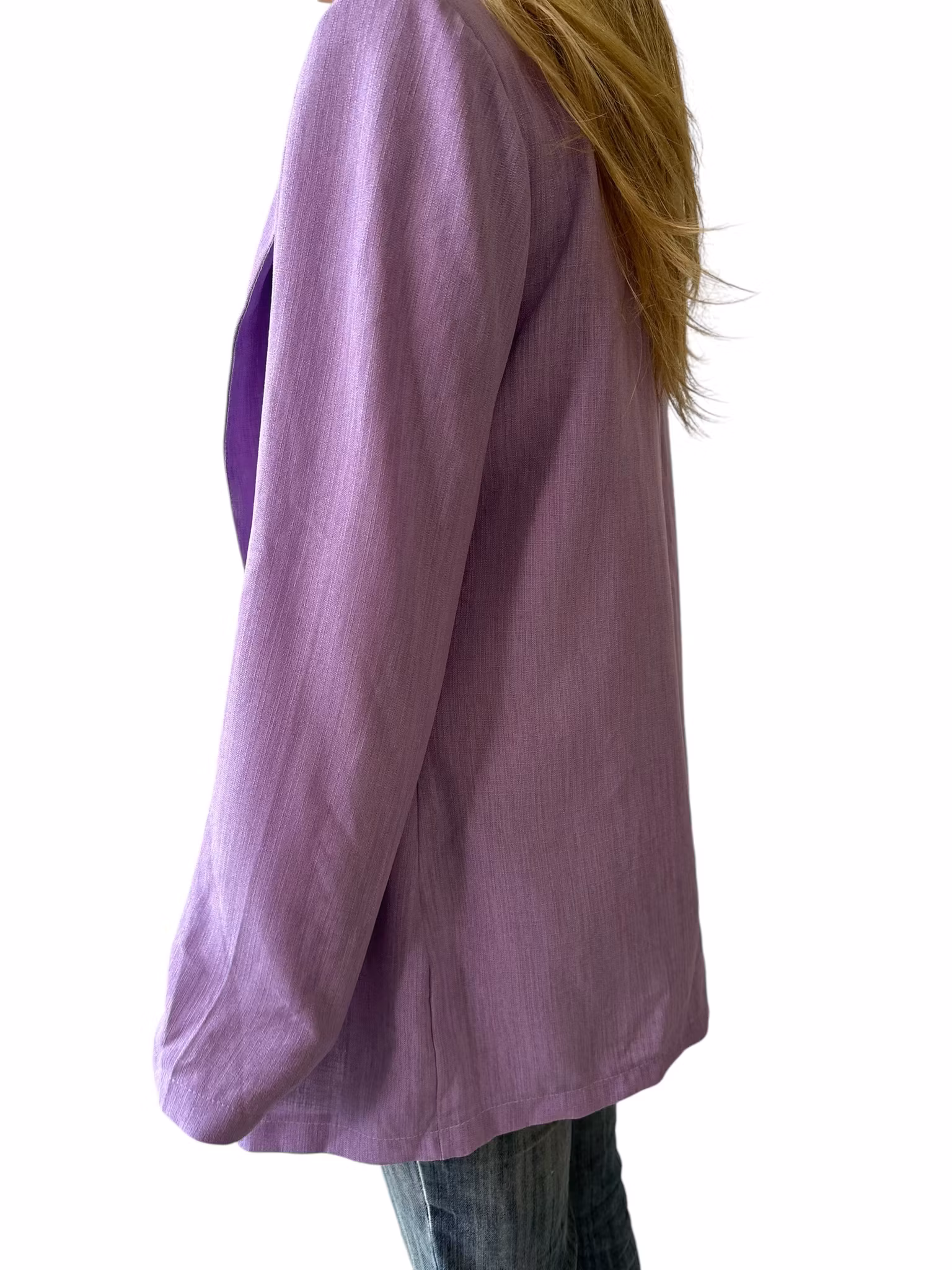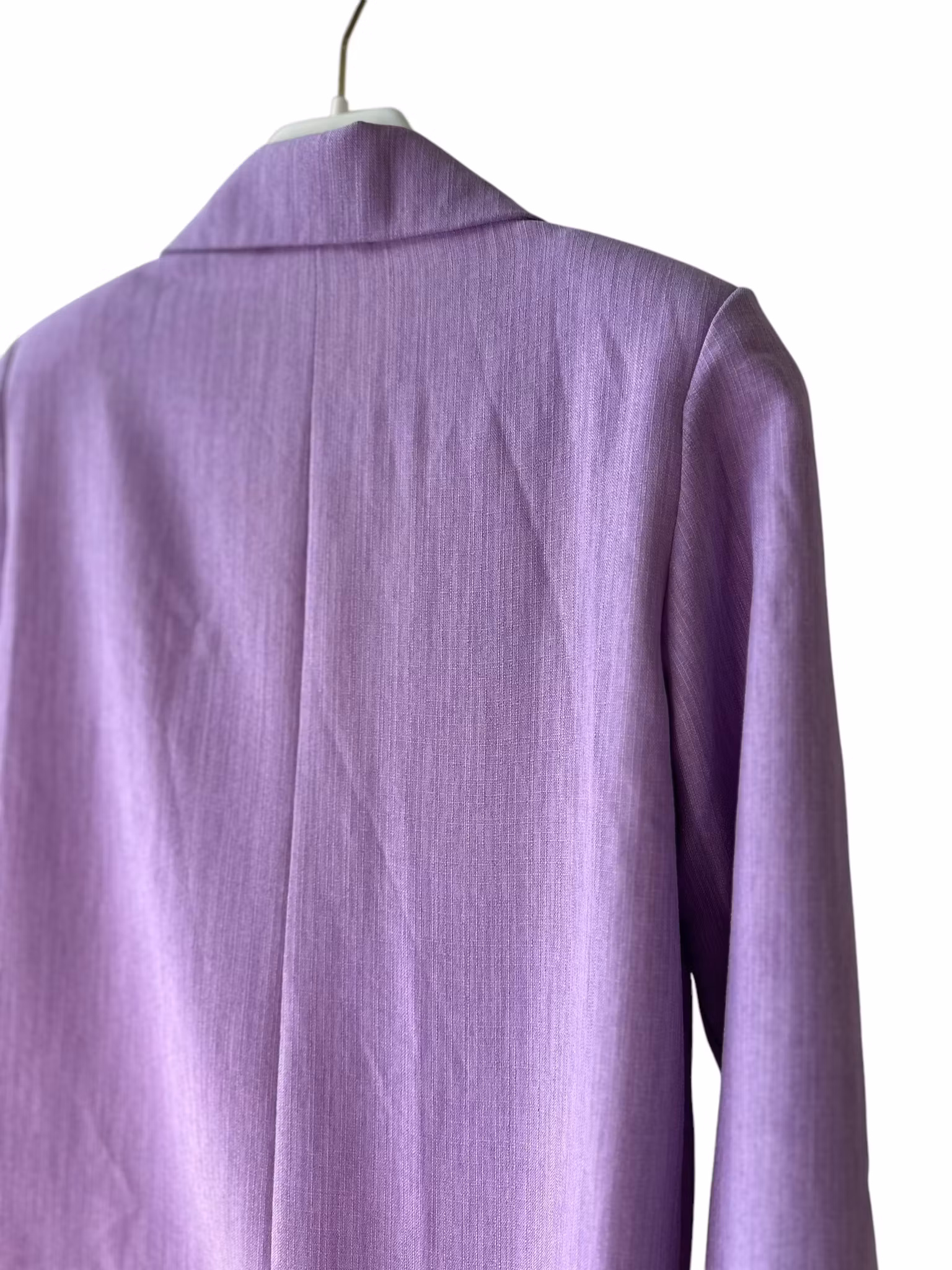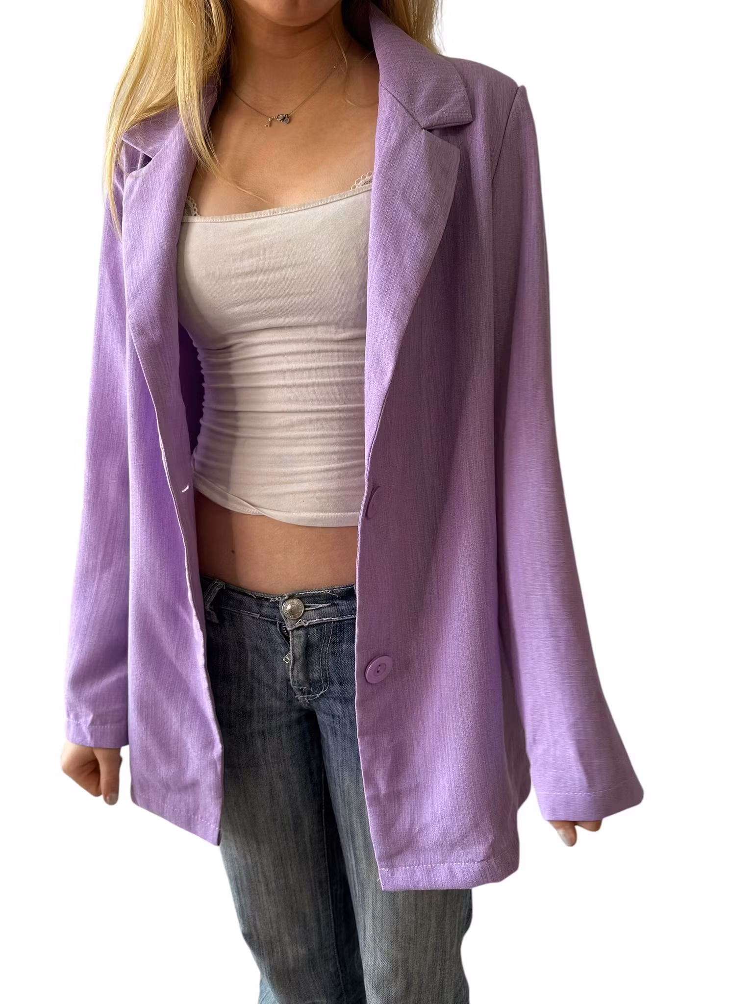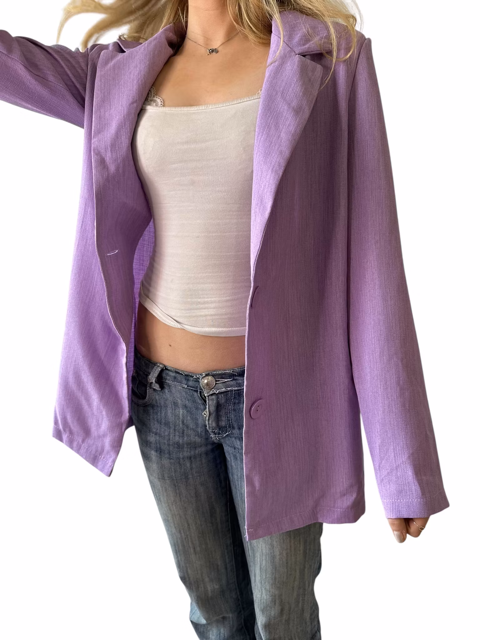 Beskrivning: Lavendellilla kavaj i material med lite struktur. Ofodrad och utan fickor stängs den med två stora knappar mitt fram. Axelvaddar bidrar till en snygg silhuett. Från Missguided.