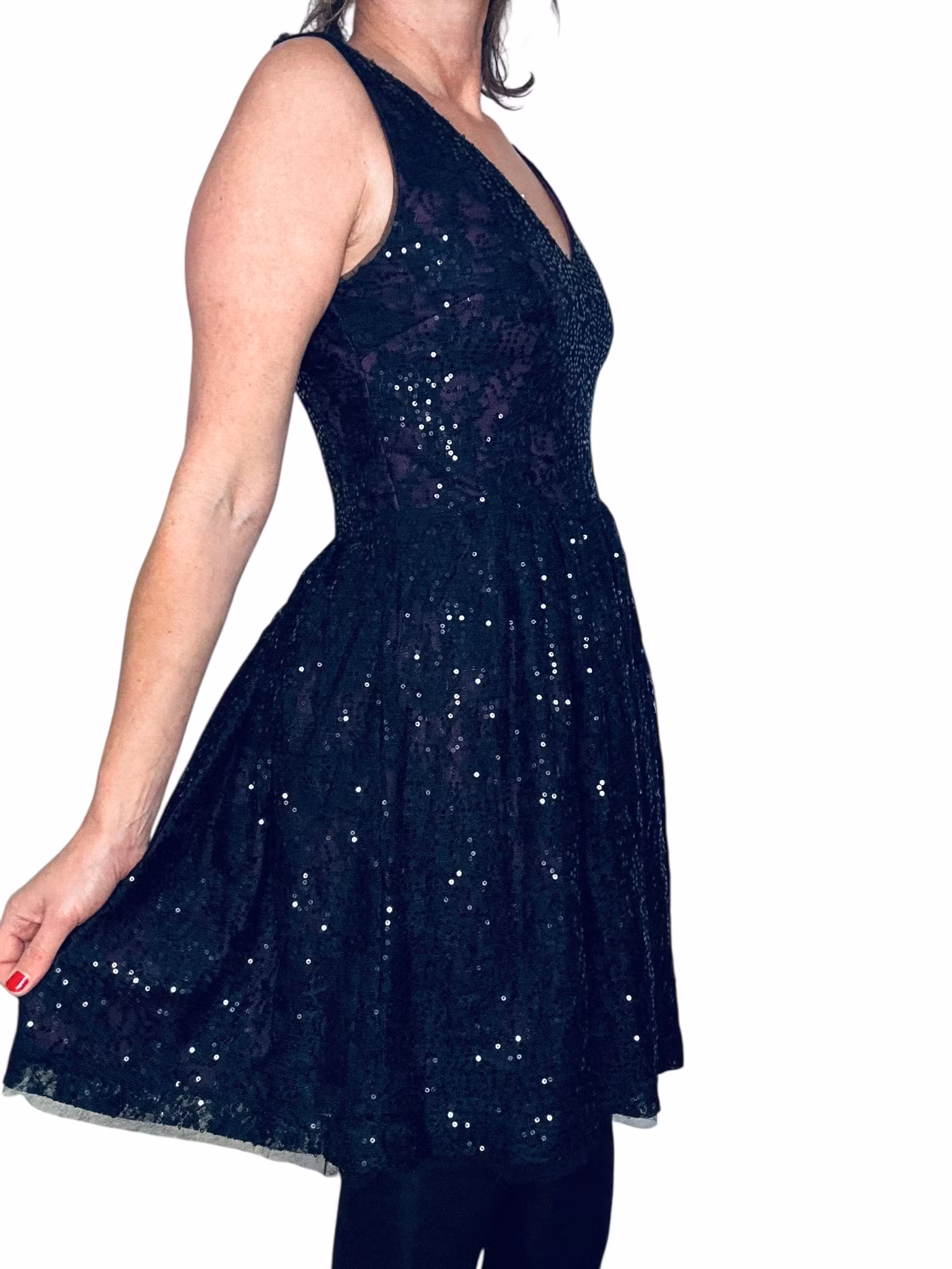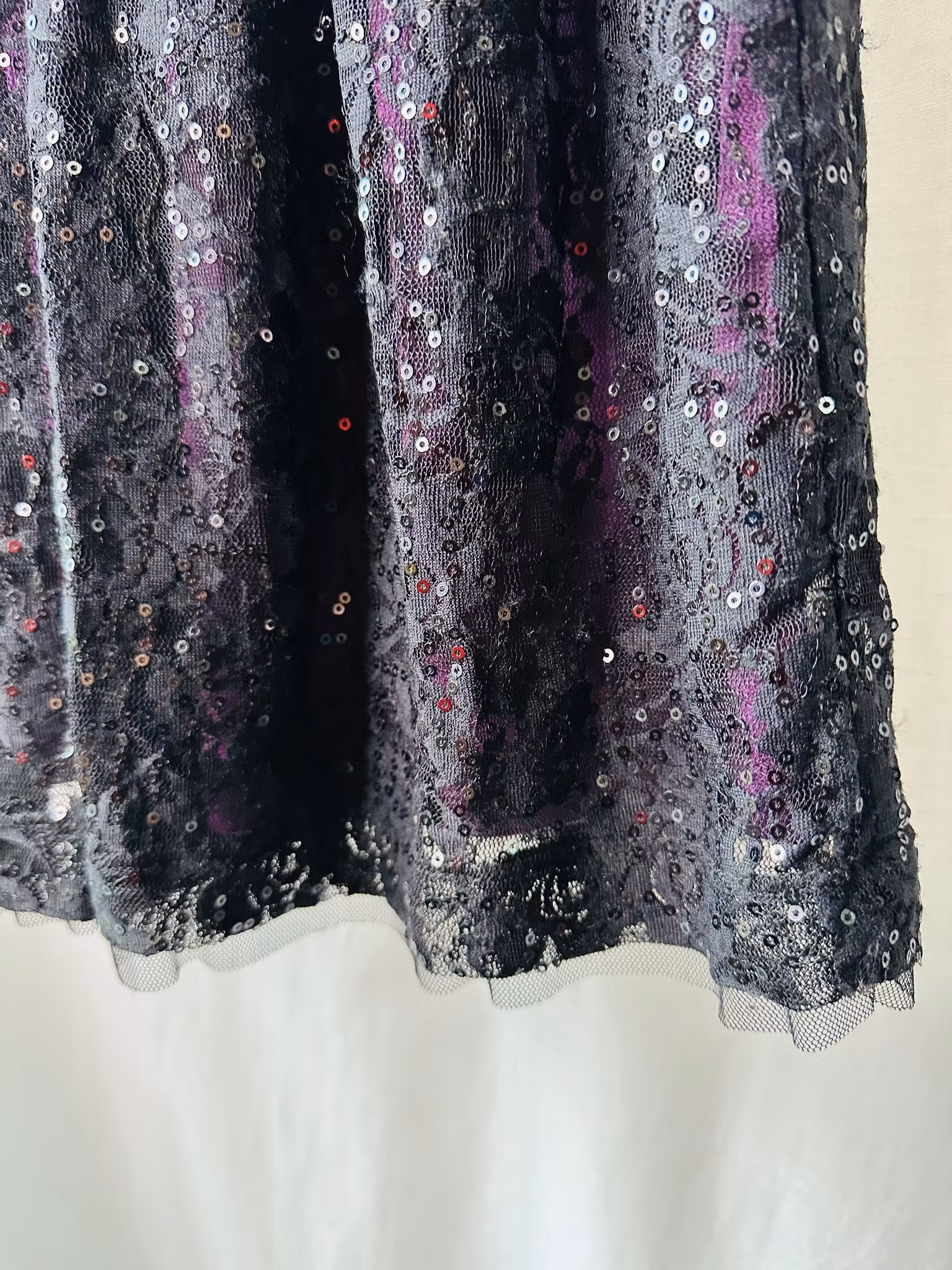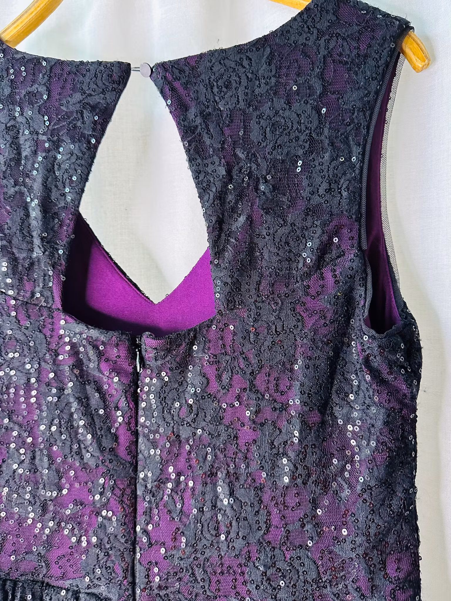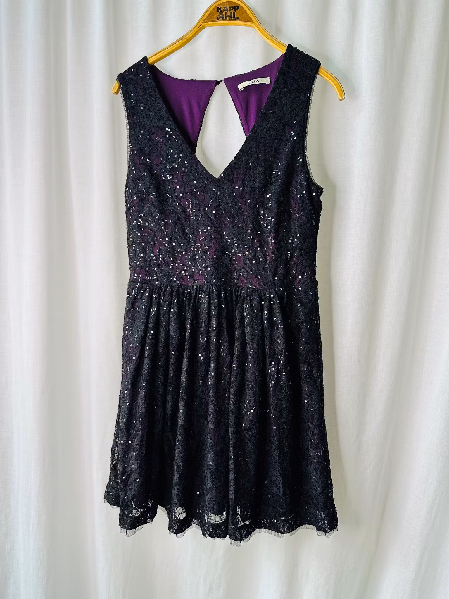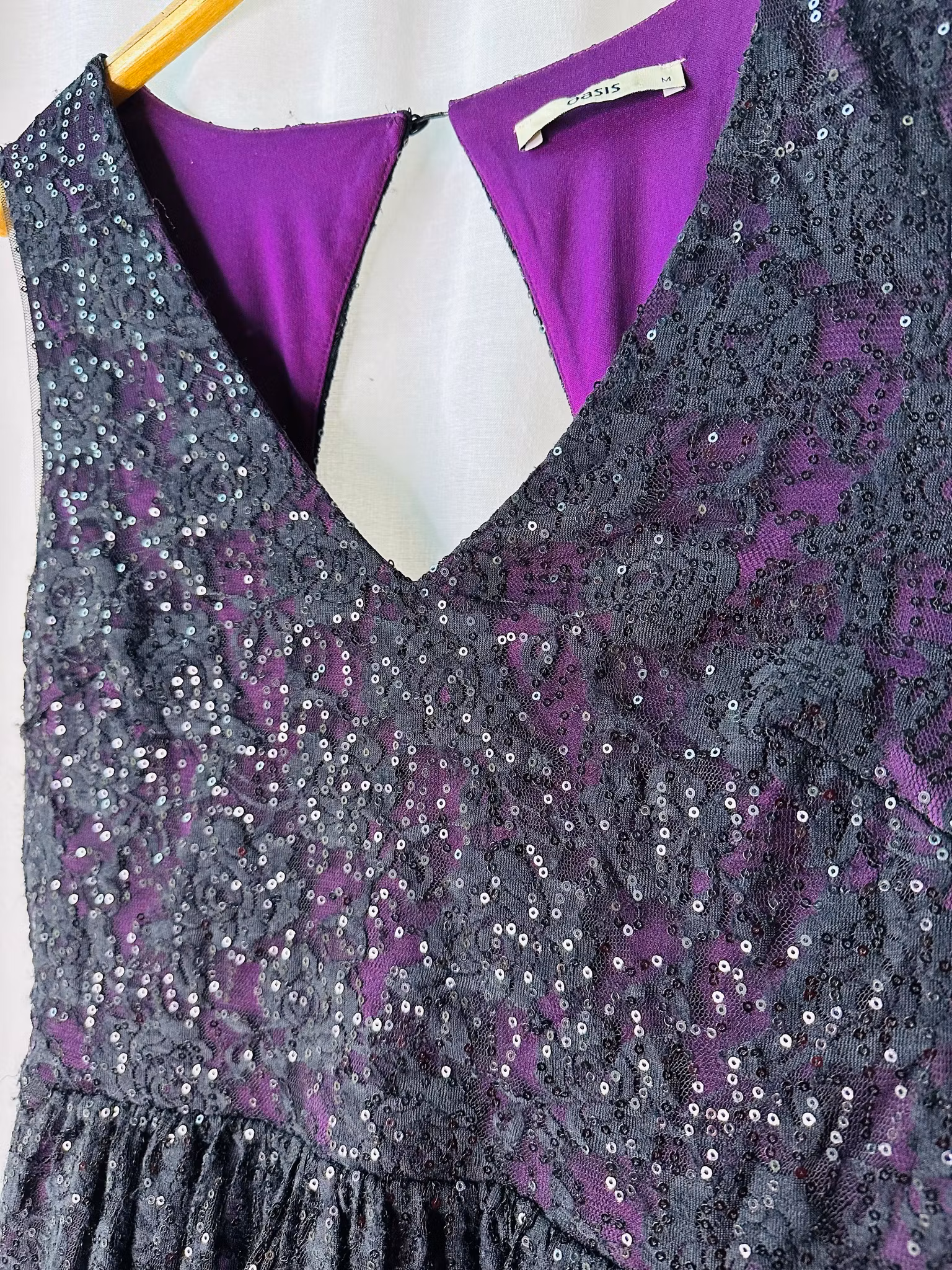 Beskrivning: Den lilla svarta med en lila twist! Den här ärmlösa klänningen från brittiska Oasis har svart transparent yttertyg med paljetter - och lila foder som syns igenom. Stängs med en knapp i nacken med en stor öppning i ryggen. Markerad midja och vid kjoldel.