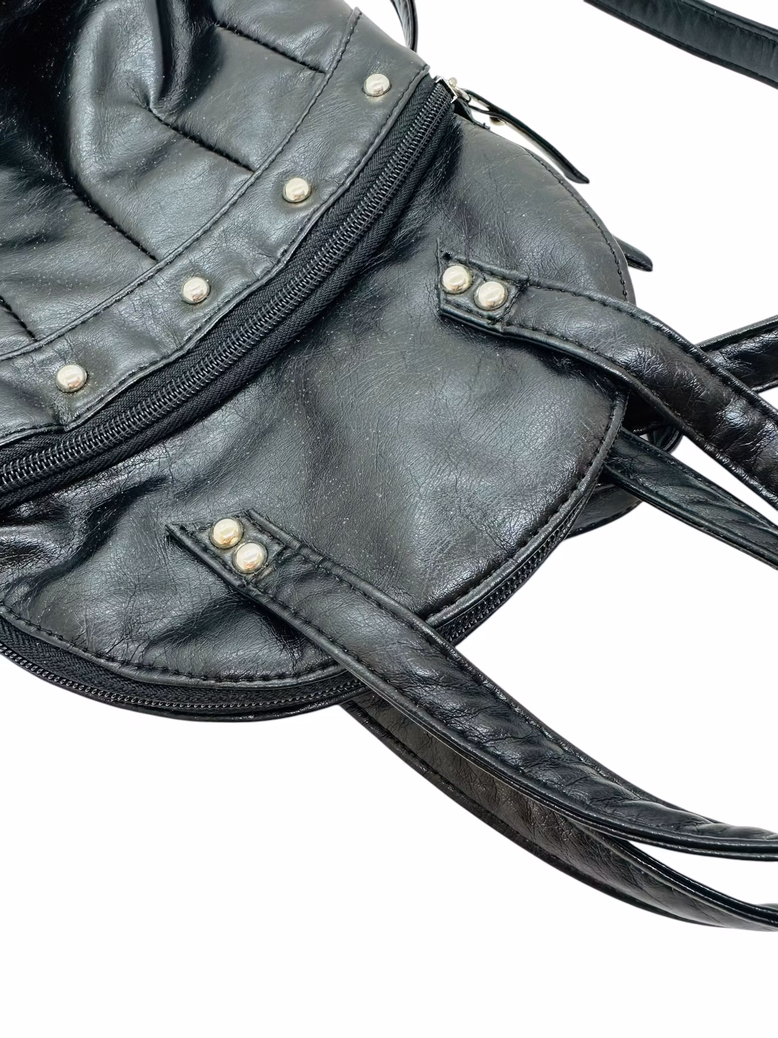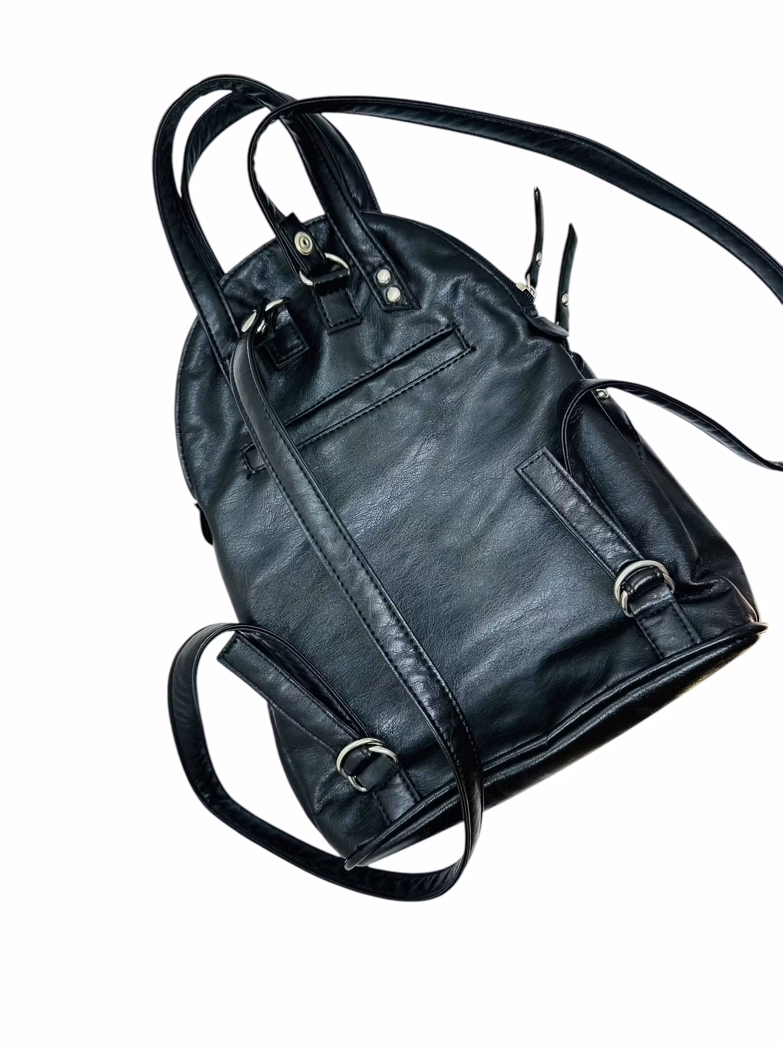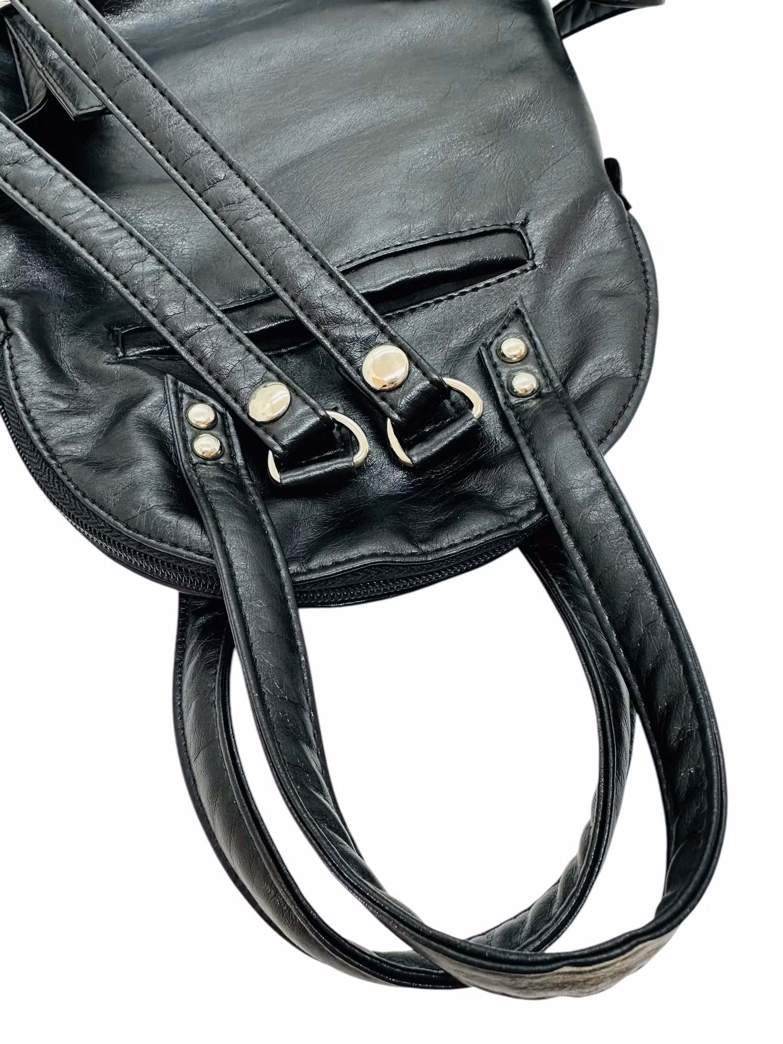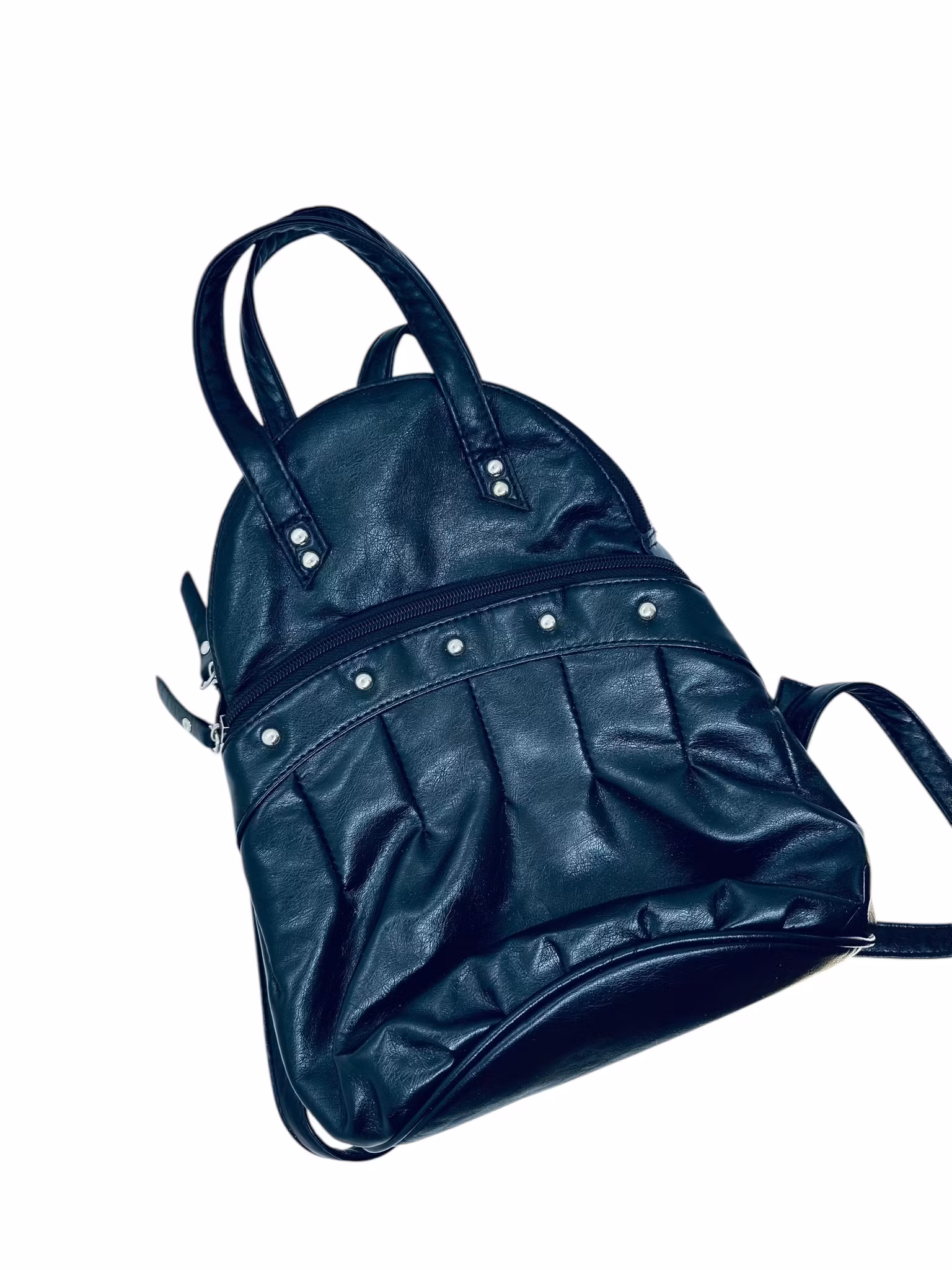 Beskrivning: Liten ryggsäck i svart fejkskinn från Fanco Rino och Carlobolaget AB. Halvcirkelformad botten, små nitar på det stora ytterfacket och ett fiffigt fack på baksidan för värdesaker. Fodrad inuti med två fack. Två handtag för att bära den i handen.