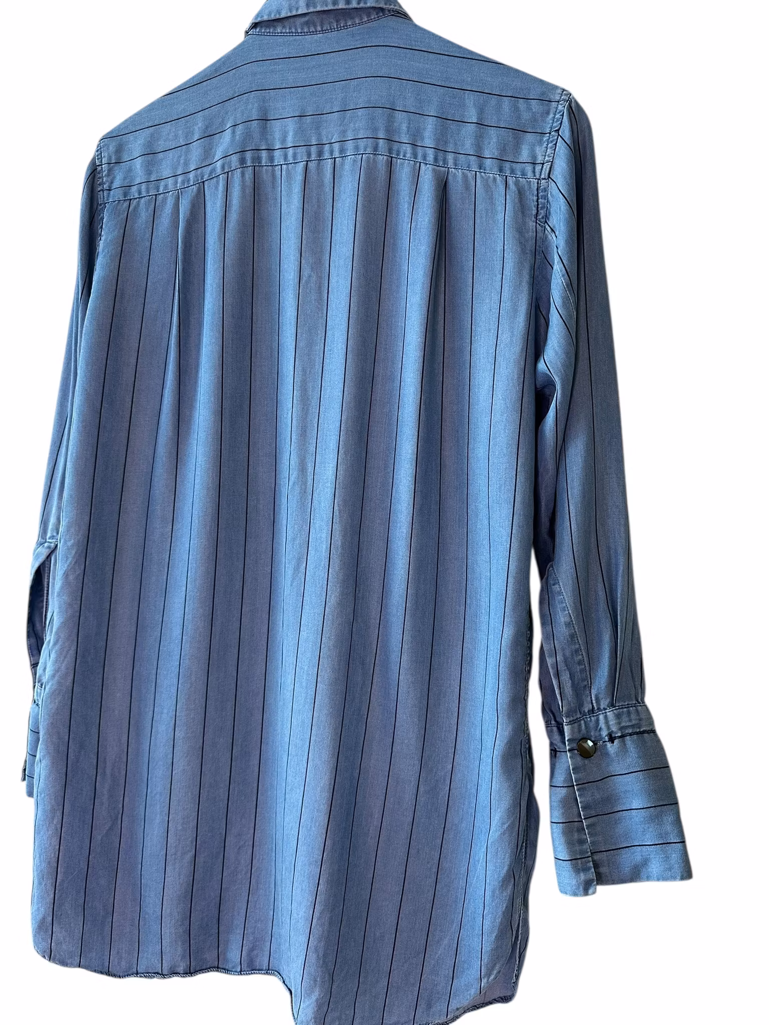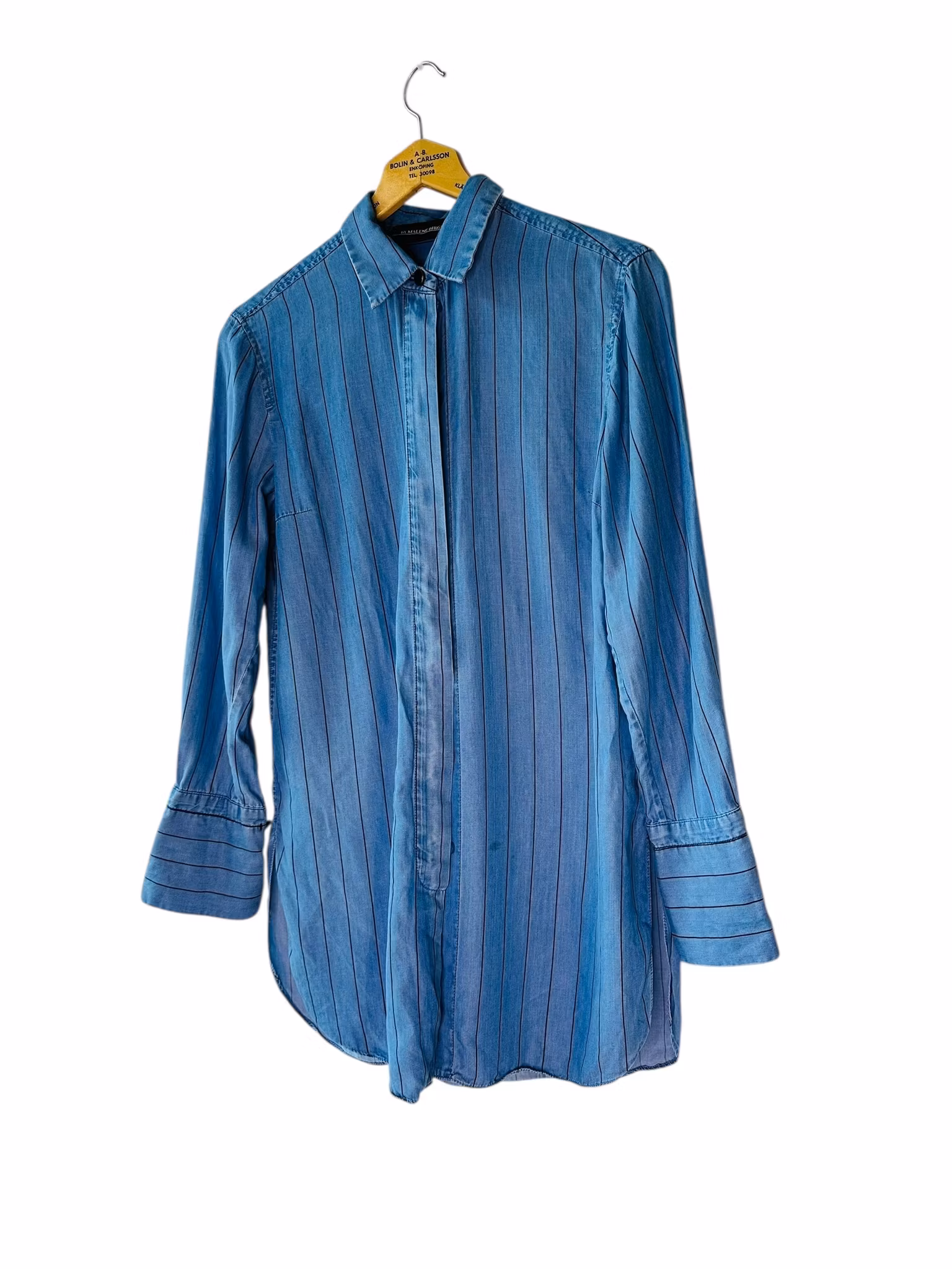 Beskrivning: Mjuk denimskjorta i lyocell från danska kvalitetsmärket by Malene Birger. Ljus botten och ränder i mörkare blå. Lång och smal passform med slitsar i sidorna. Dold knäppning och breda manschetter med avtagbara manschettknappar. Finns ett litet vävfel el likn, se sista bilden.