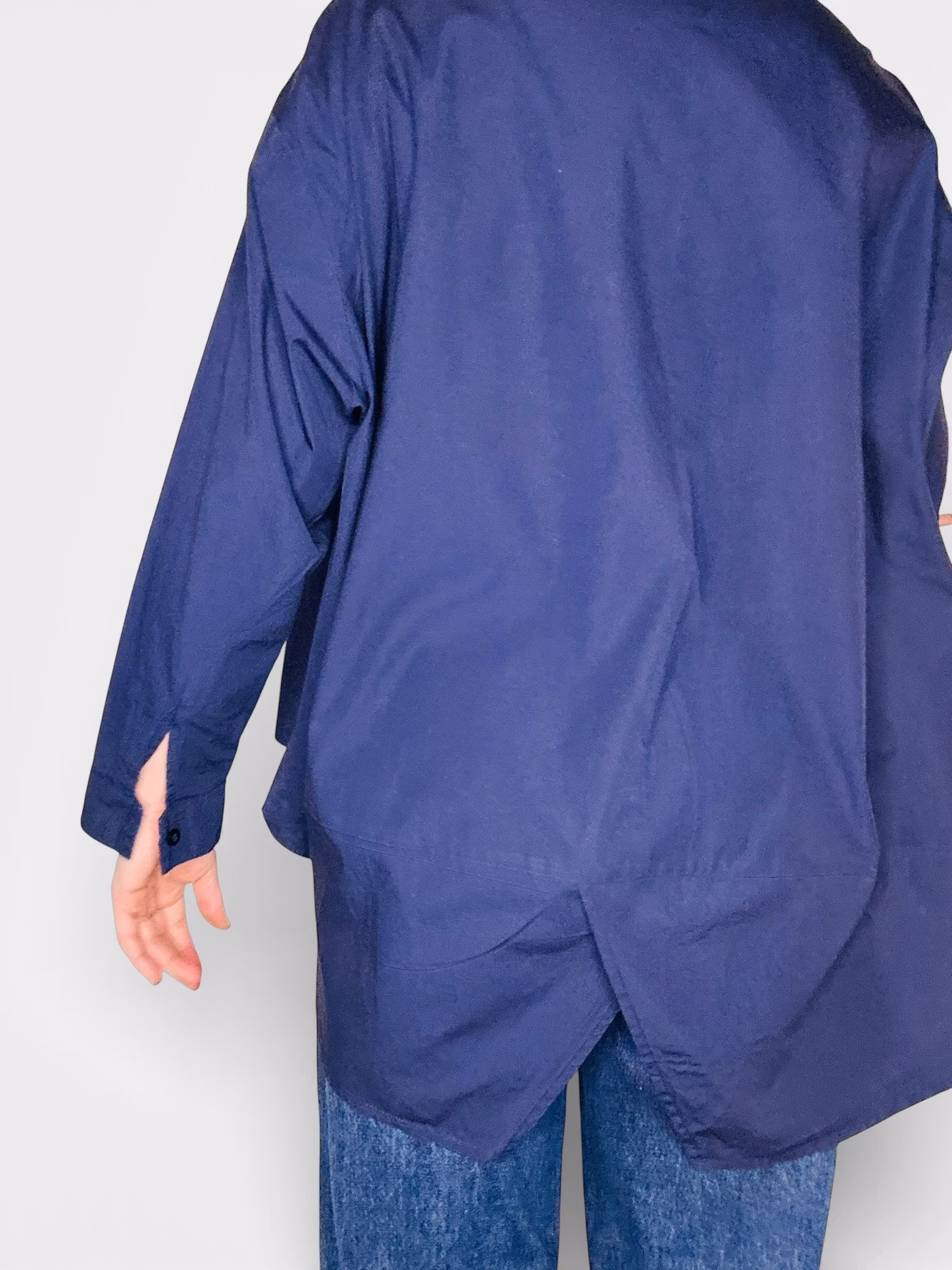 Beskrivning: Mörkblå skjorta i oversized modell med generöst, följsamt fall. Designad med klassisk krage, dold knappslå och längre, rundad och väldigt vid rygg med slits längst ner. Ärmarna är raka med manschett. Lappar saknas men den uppskattas vara i bomull och passa M-XL.