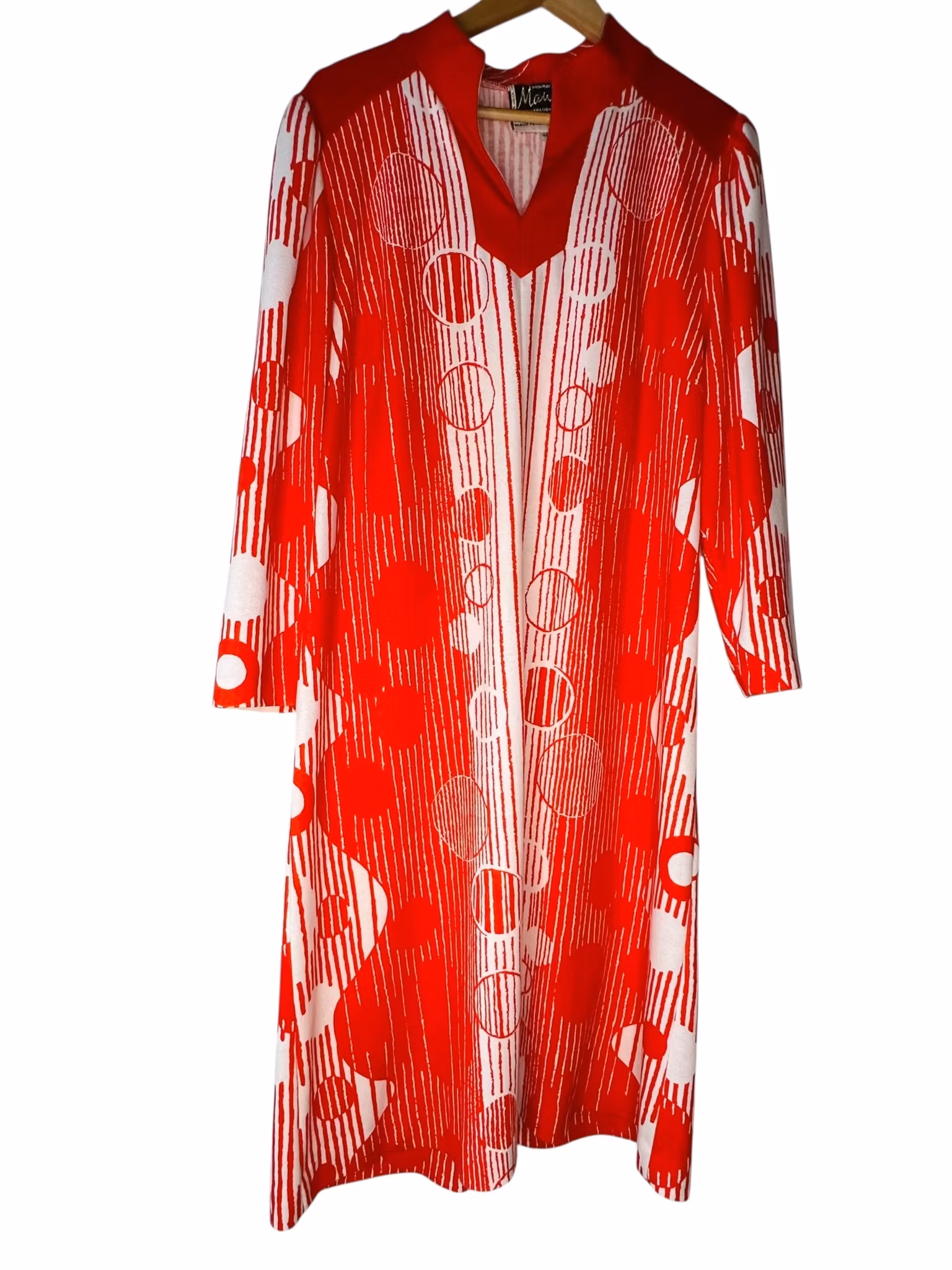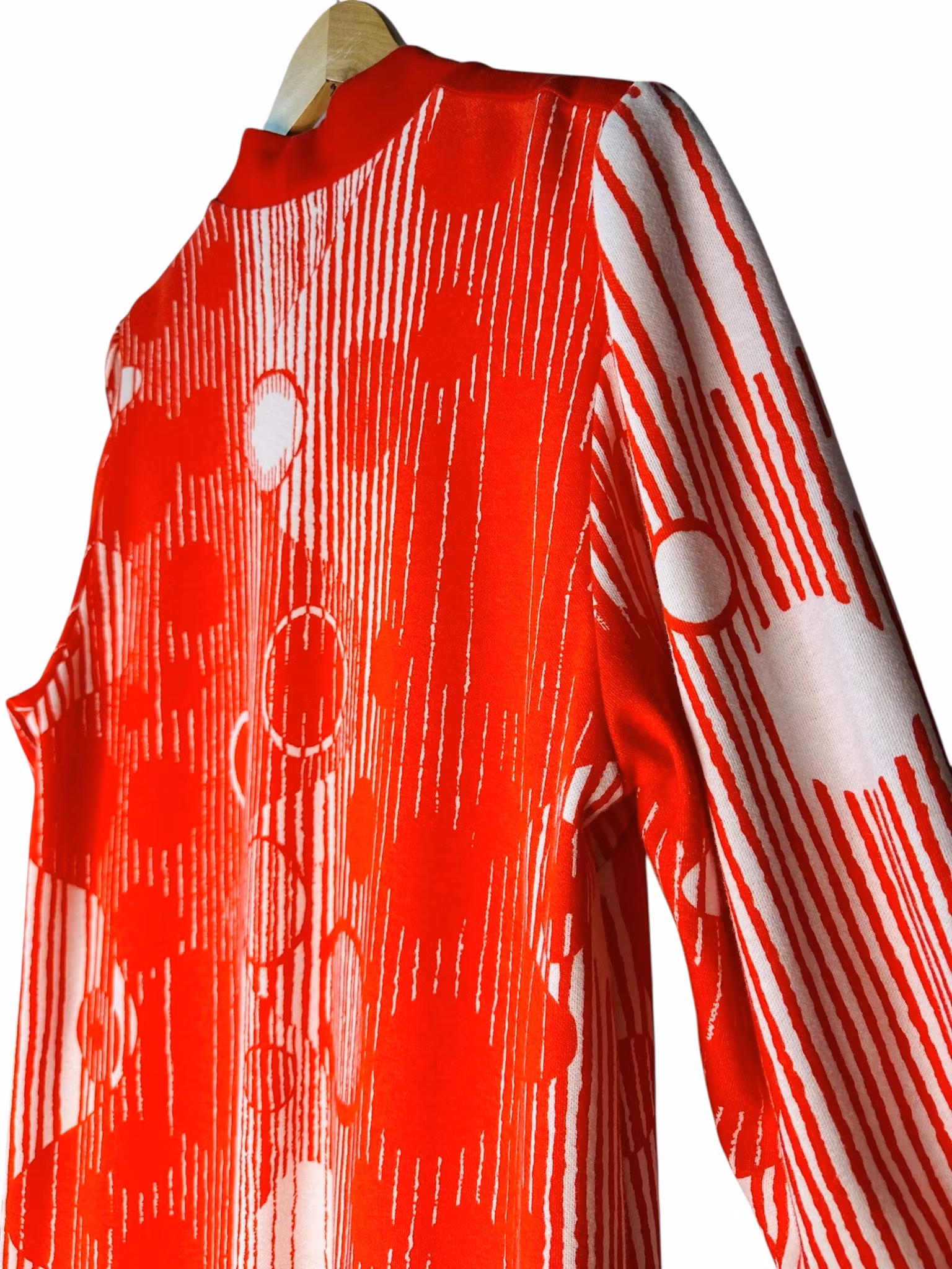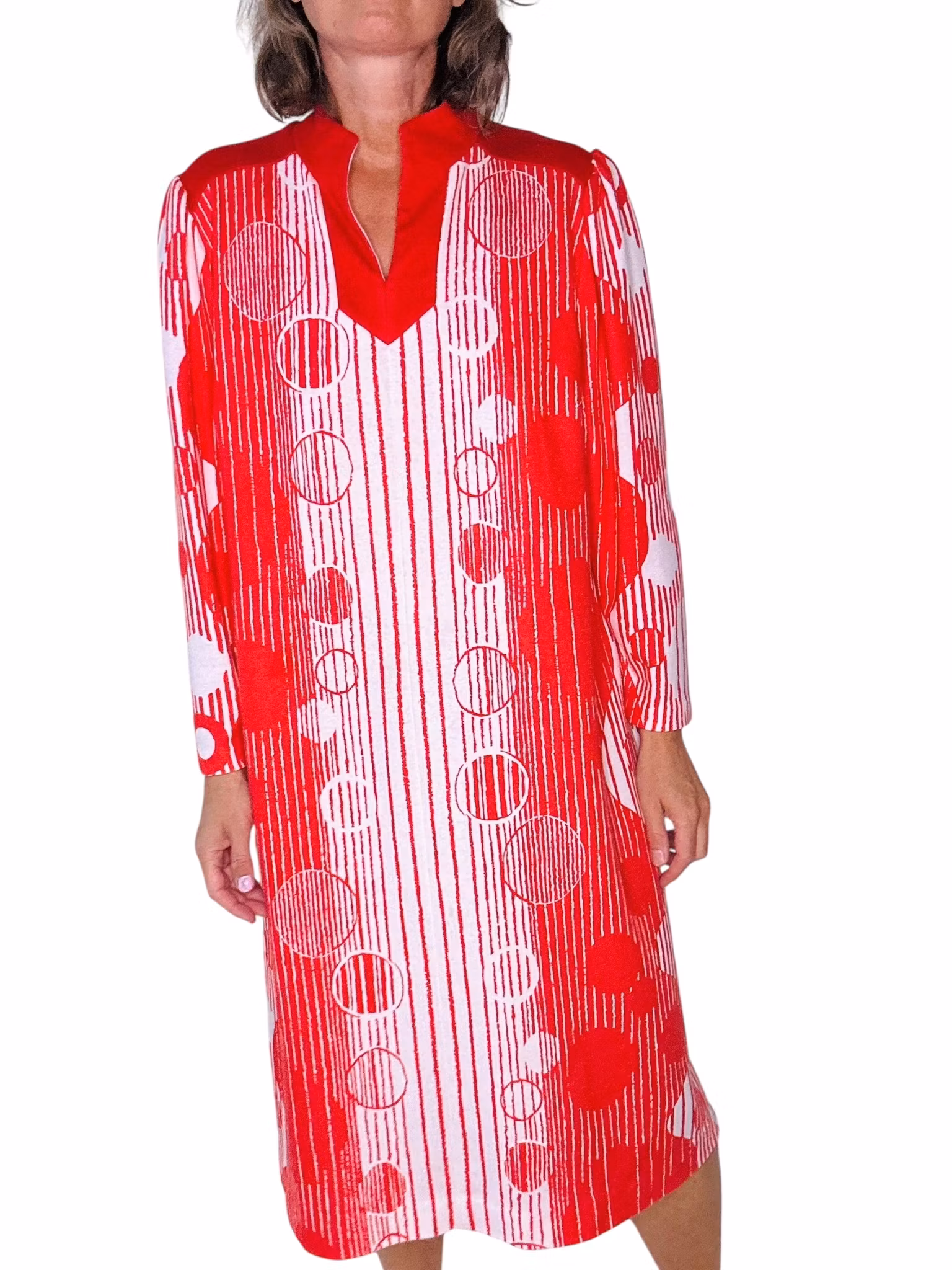 Beskrivning: Vintage klänning från en legendarisk svensk textilkonstnär - Maud Fredin Fredholm. Känd för sina mönster och såld över hela världen. Den här klänningen är i mjukaste bomullsmixen, lite tjockare jerseykvalitet med ett print i rött och vitt. Sprund framtill som är enfärgat, liksom axlarna. Rak modell med lång ärm.. Fin som den är eller t ex med ett bälte i midjan. Vi vill också gärna bära den här med en blå jeansjacka, eller varför inte med jeans under? Blå denim och rött är så snyggt ihop!