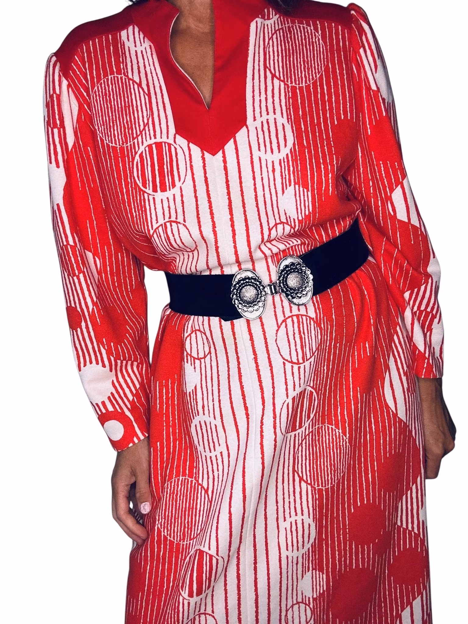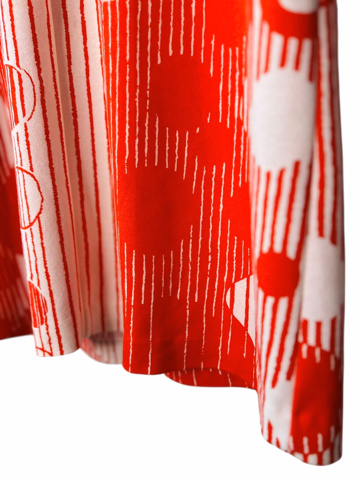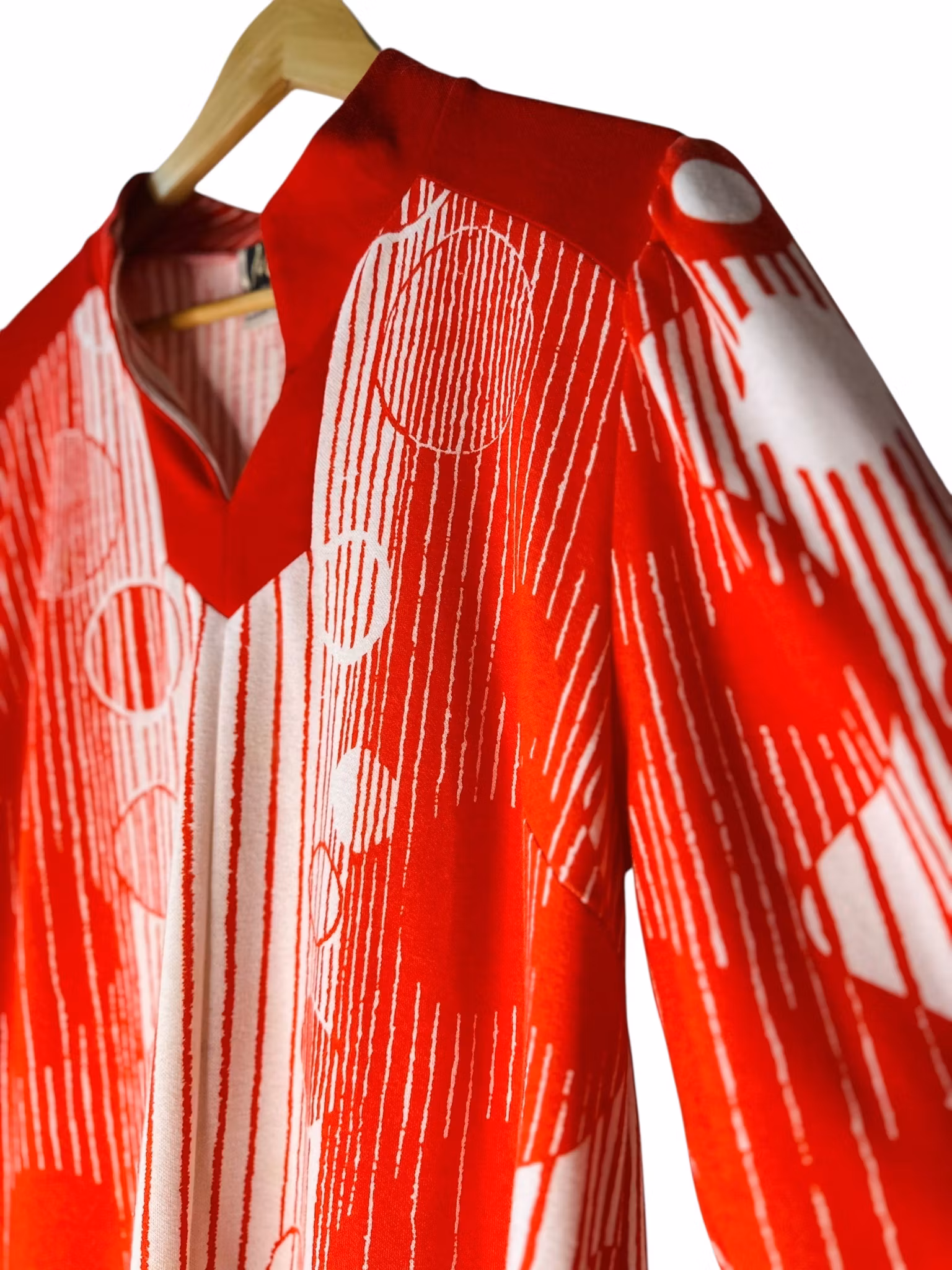 Beskrivning: Vintage klänning från en legendarisk svensk textilkonstnär - Maud Fredin Fredholm. Känd för sina mönster och såld över hela världen. Den här klänningen är i mjukaste bomullsmixen, lite tjockare jerseykvalitet med ett print i rött och vitt. Sprund framtill som är enfärgat, liksom axlarna. Rak modell med lång ärm.. Fin som den är eller t ex med ett bälte i midjan. Vi vill också gärna bära den här med en blå jeansjacka, eller varför inte med jeans under? Blå denim och rött är så snyggt ihop!