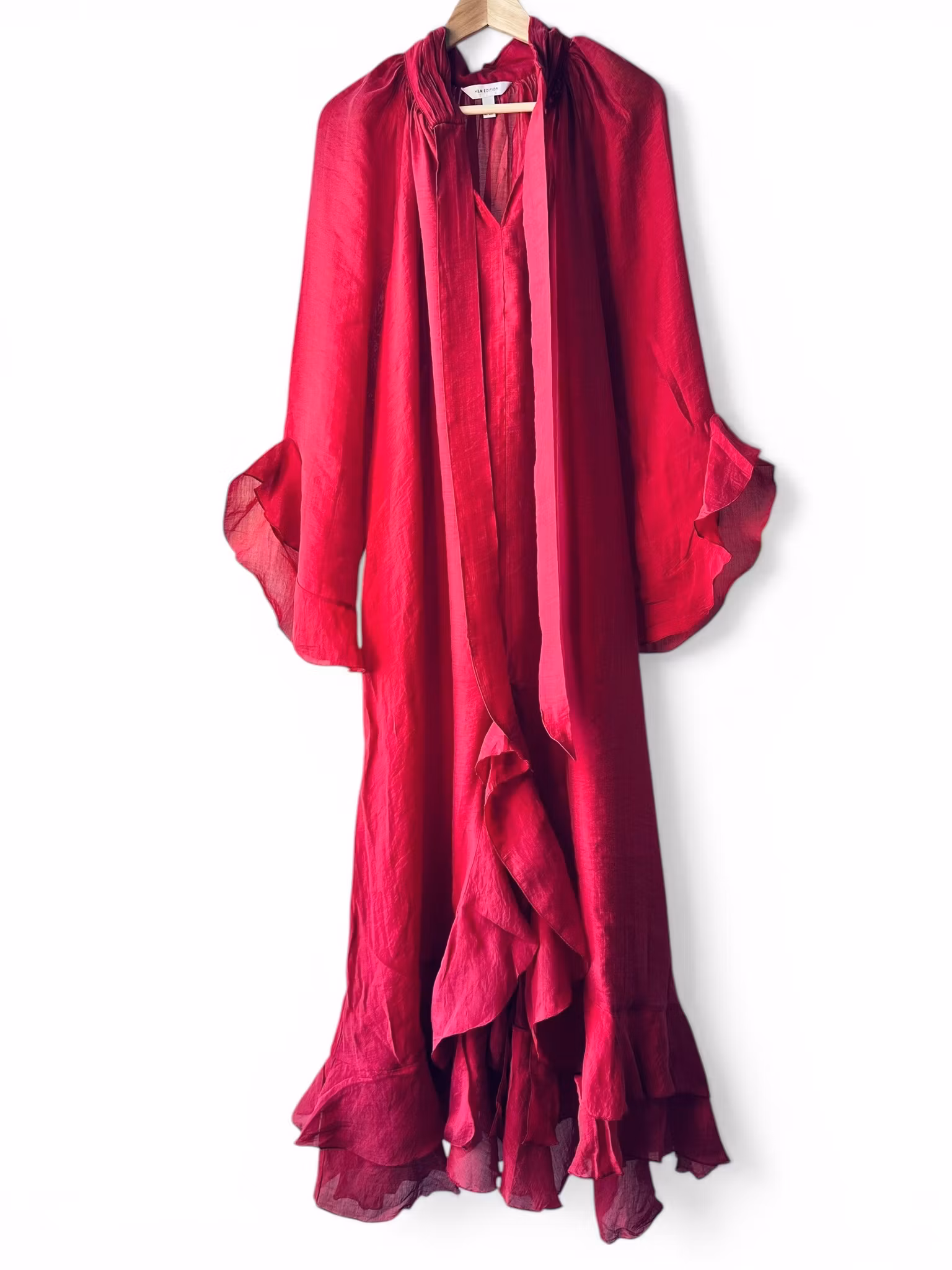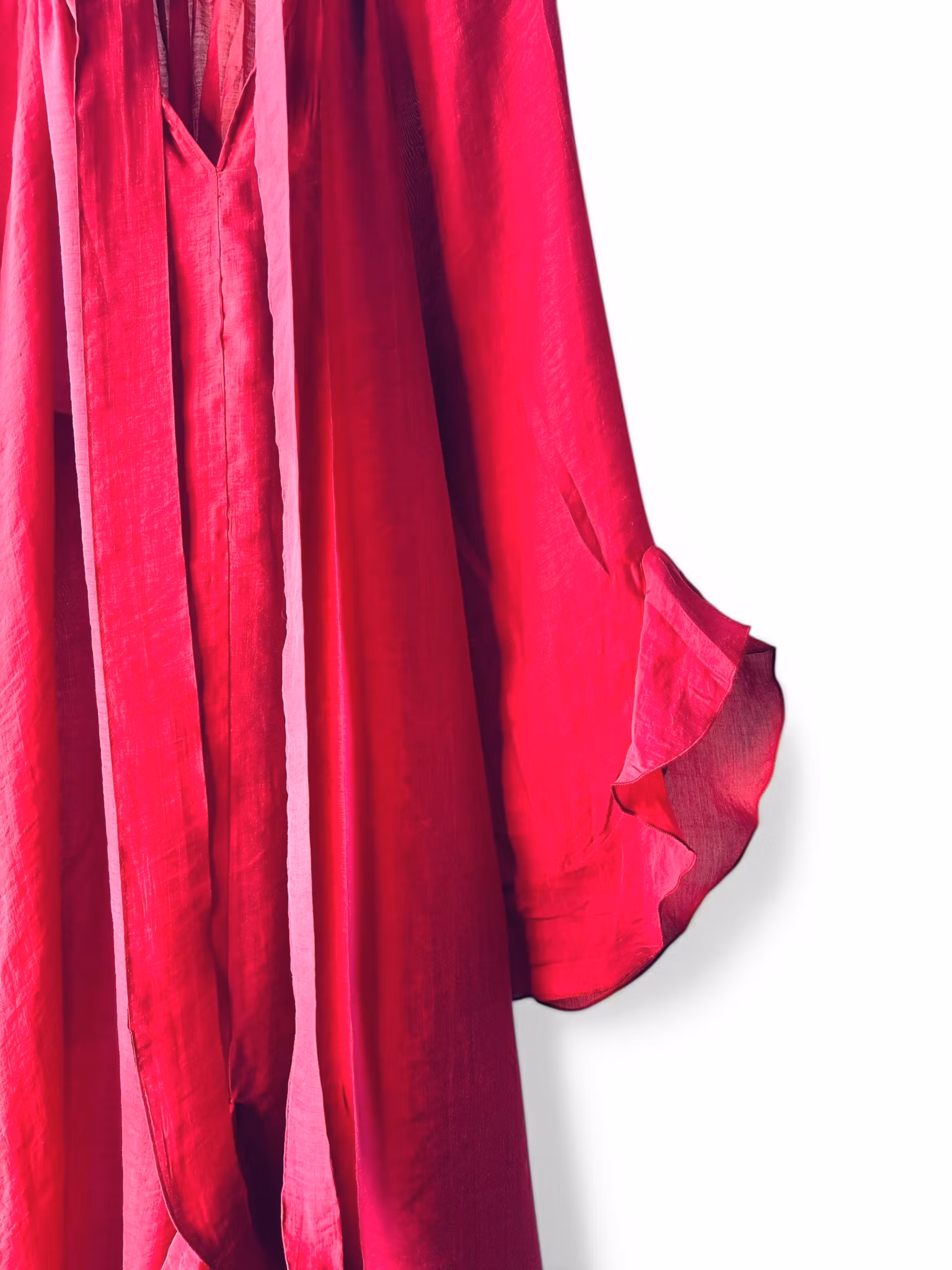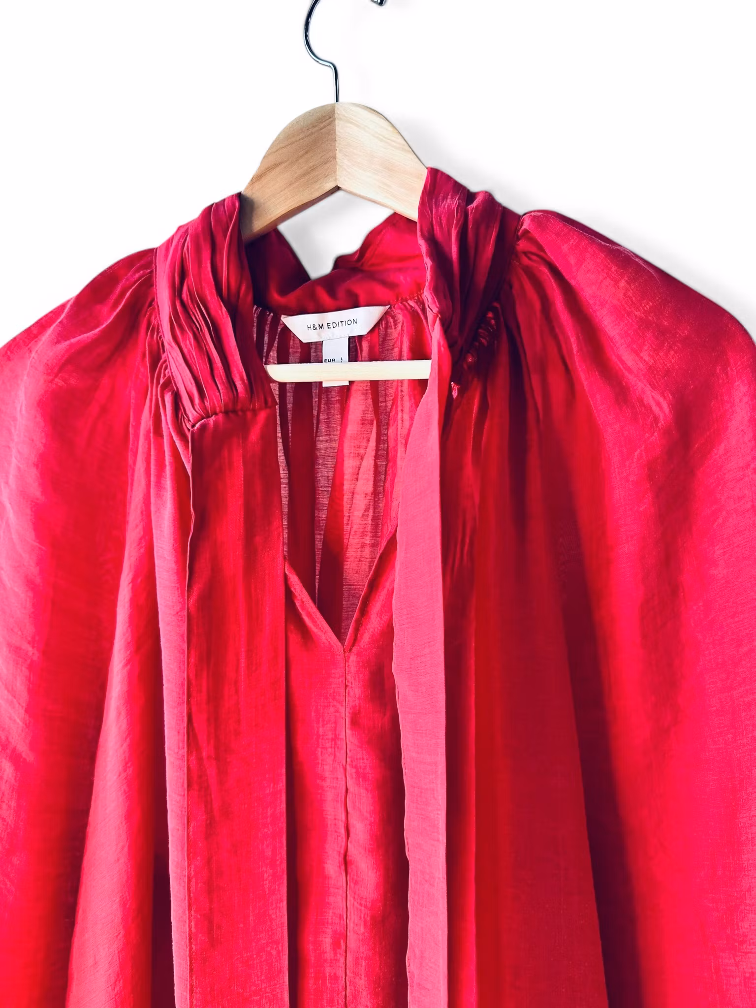 Beskrivning: En drömlik statementklänning i en strålande hallonröd nyans från H&M Edition. Med sin luftiga silhuett och eleganta detaljer är detta ett plagg som för tankarna till både bohemisk lyx och tidlös romantik. Denna svepande maxiklänning är skapad i en lätt och skirt skimrande kvalitet som ger ett vackert fall och en exklusiv känsla. Designen kännetecknas av en lös, böljande passform med subtil transparens, voluminösa ärmar och dekorativa volanger längs fållen. Den feminina knytningen i halsen ger möjlighet att variera uttrycket – bär den öppen för en avslappnad look eller knuten för en sofistikerad silhuett. Den intensiva röda nyansen gör klänningen till ett självklart val för festliga tillfällen, sommarens middagar och eleganta semesterkvällar. Nypris ca 1500kr.