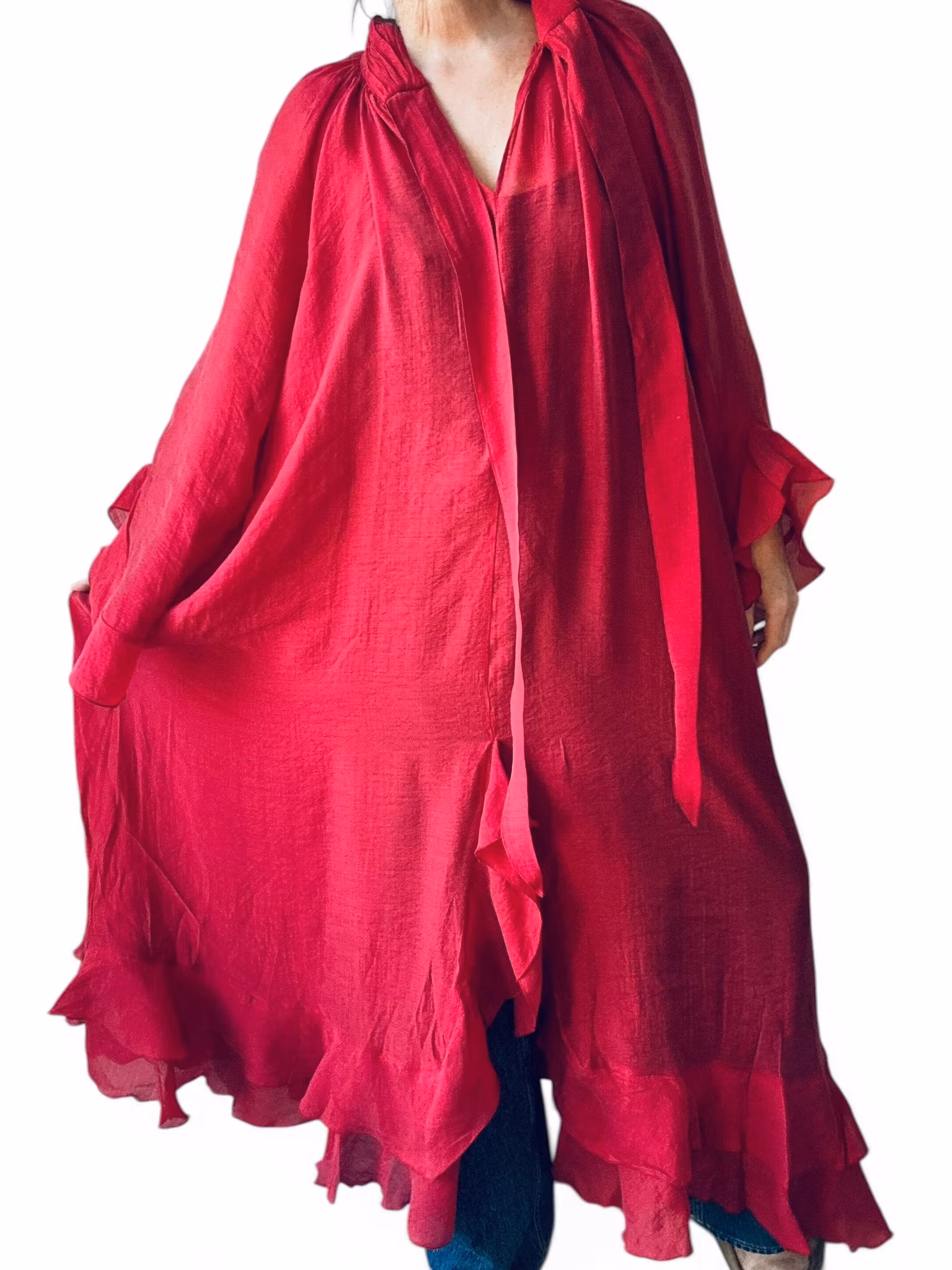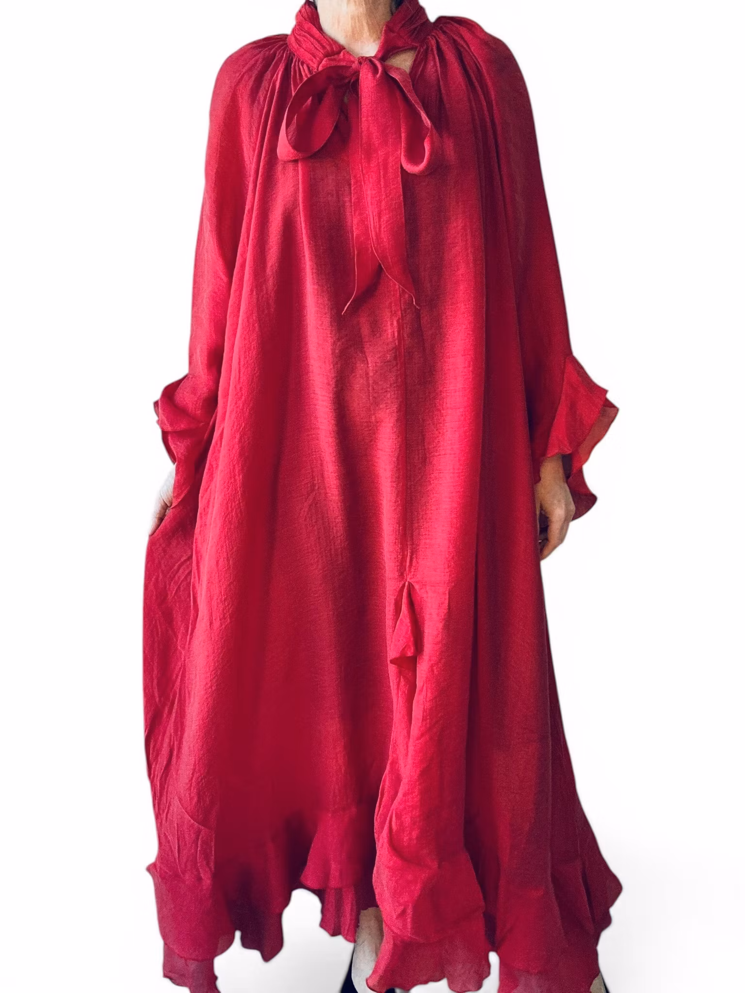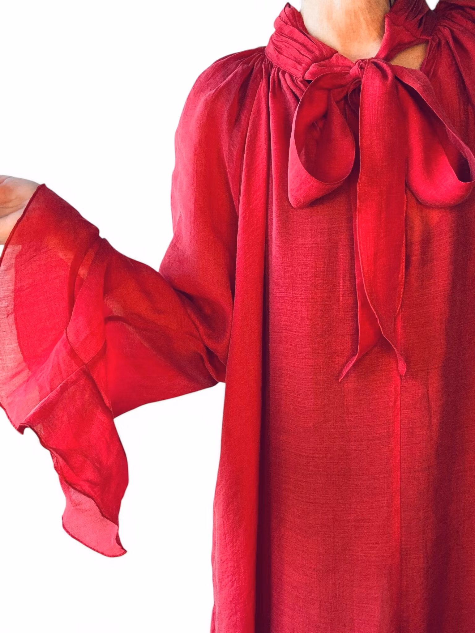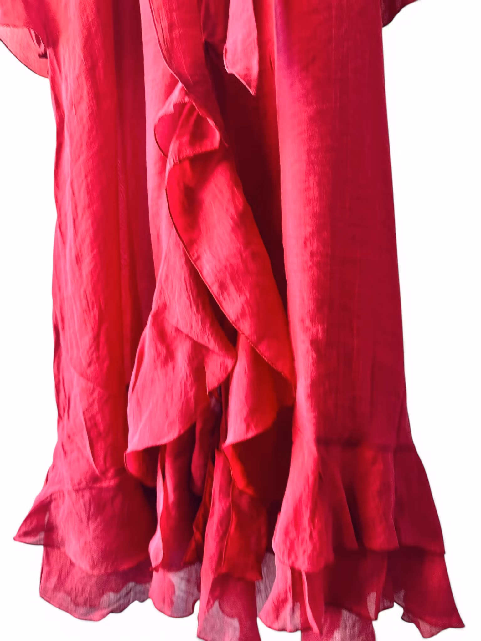 Beskrivning: En drömlik statementklänning i en strålande hallonröd nyans från H&M Edition. Med sin luftiga silhuett och eleganta detaljer är detta ett plagg som för tankarna till både bohemisk lyx och tidlös romantik. Denna svepande maxiklänning är skapad i en lätt och skirt skimrande kvalitet som ger ett vackert fall och en exklusiv känsla. Designen kännetecknas av en lös, böljande passform med subtil transparens, voluminösa ärmar och dekorativa volanger längs fållen. Den feminina knytningen i halsen ger möjlighet att variera uttrycket – bär den öppen för en avslappnad look eller knuten för en sofistikerad silhuett. Den intensiva röda nyansen gör klänningen till ett självklart val för festliga tillfällen, sommarens middagar och eleganta semesterkvällar. Nypris ca 1500kr.