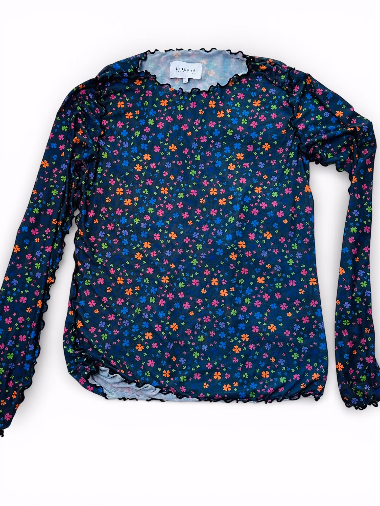 Beskrivning: Meshtröjan - så användbar under allt! Varje outfit blir roligare med en mesh och på vintern är den en lifesaver som mellanlager. Kul prints är en bonus och denna blå med färgglada blommor kommer från danska Liberté Essentiel och har rund hals och råa, vågiga kanter och är stretchig så flexibel i storlek.