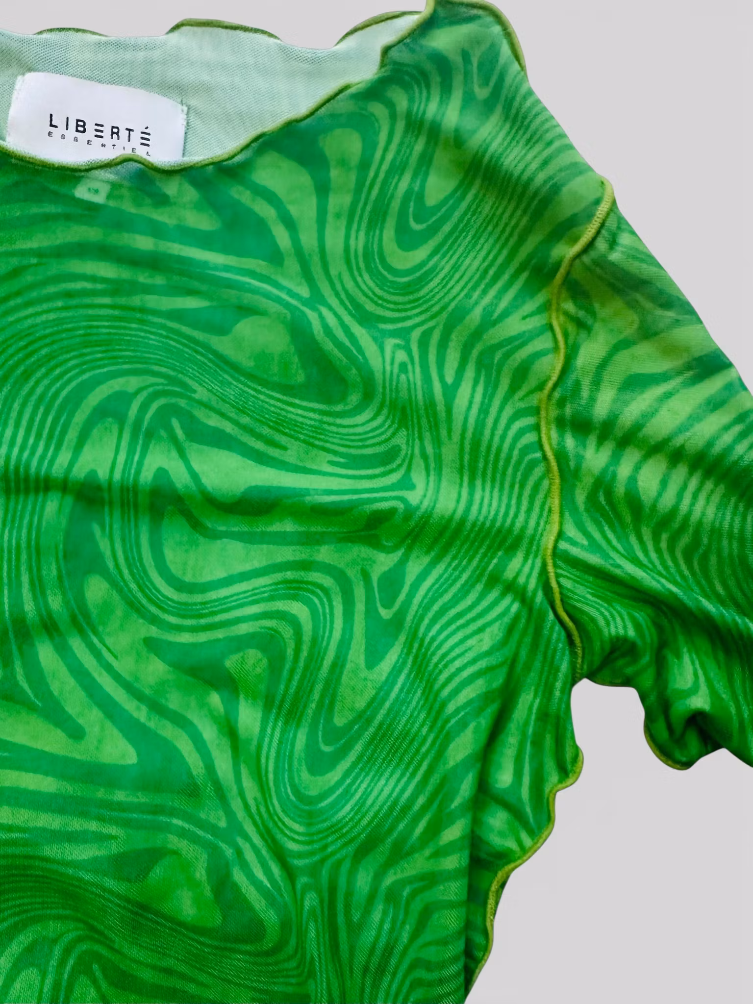 Beskrivning: Meshtröjan - så användbar under allt! Varje outfit blir roligare med en mesh och på vintern är den en lifesaver som mellanlager. Kul prints är en bonus och denna gröna med zebraränder ton-i-ton kommer från danska Liberté Essentiel och har rund hals och råa, vågiga kanter och är stretchig så flexibel i storlek.
