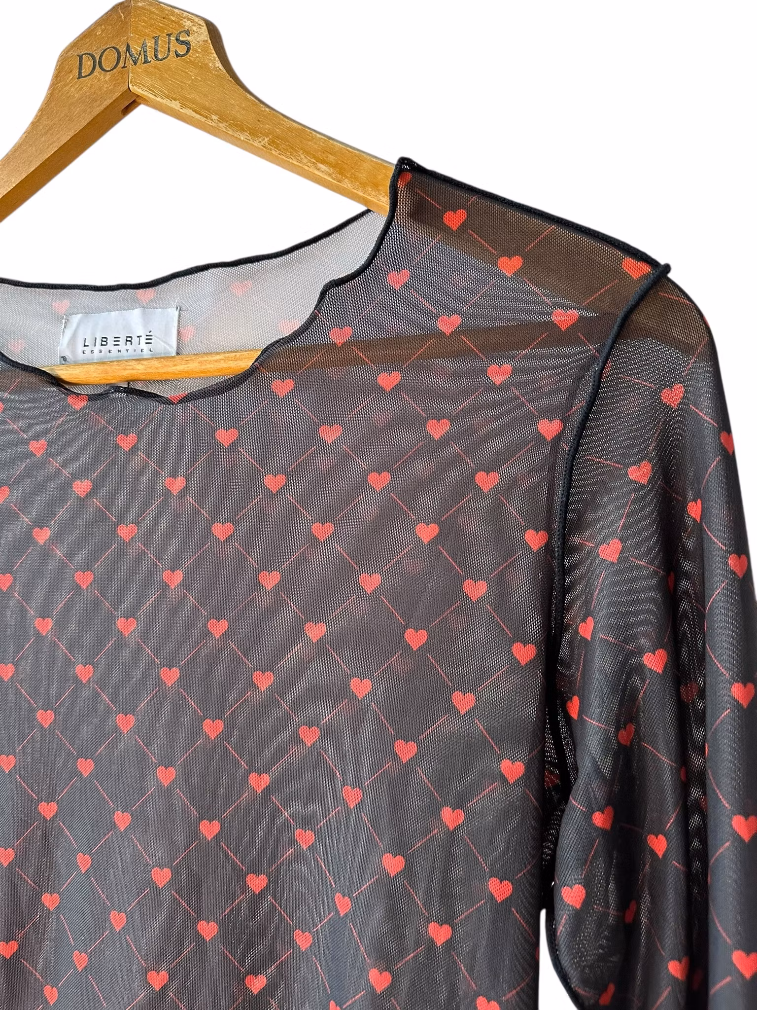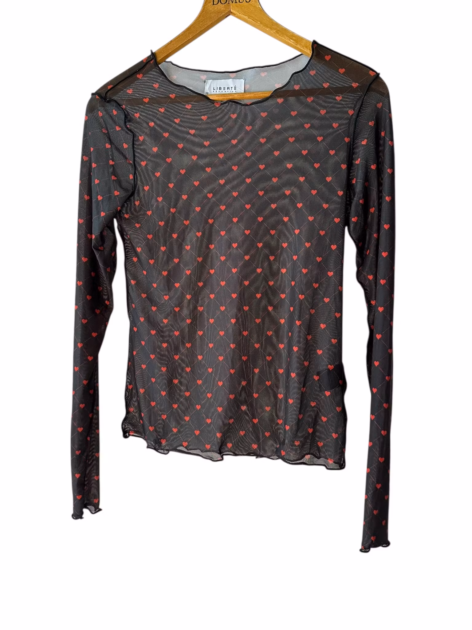 Beskrivning: En meshtröja från Liberté Essentiel med gulligt hjärtprint! Fin att ha på egen hand eller under precis allt! En kavaj, en skjorta, en tisha i klassisk 90-tals grungestil osv osv!