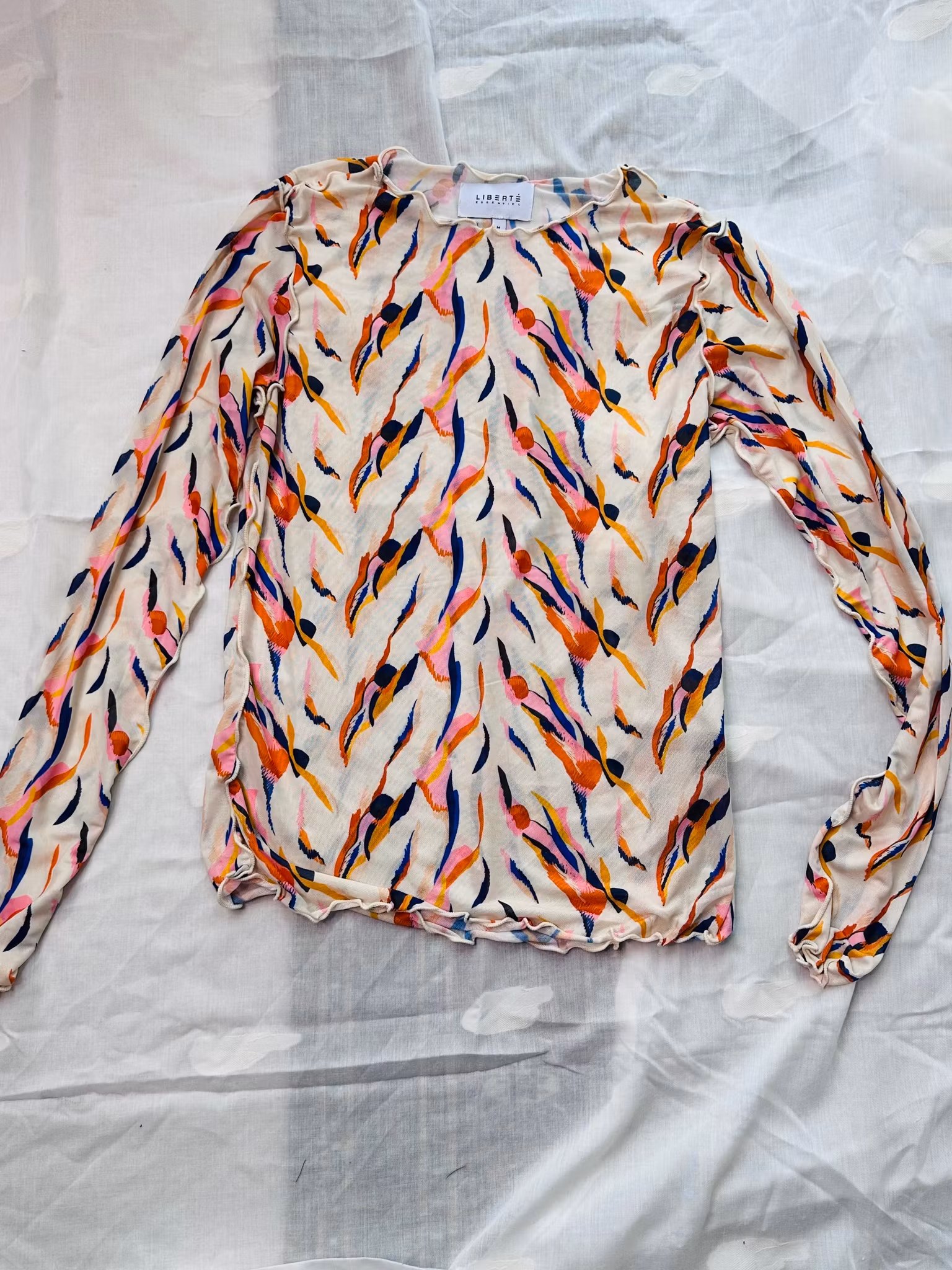 Beskrivning: Meshtröjan - så användbar under allt! Varje outfit blir roligare med en mesh och på vintern är den en lifesaver som mellanlager. Kul prints är en bonus och denna i offwhite med färgglatt mönster i blått, orange, gult och rosa kommer från danska Liberté Essentiel och har rund hals och råa, vågiga kanter och är stretchig så flexibel i storlek.