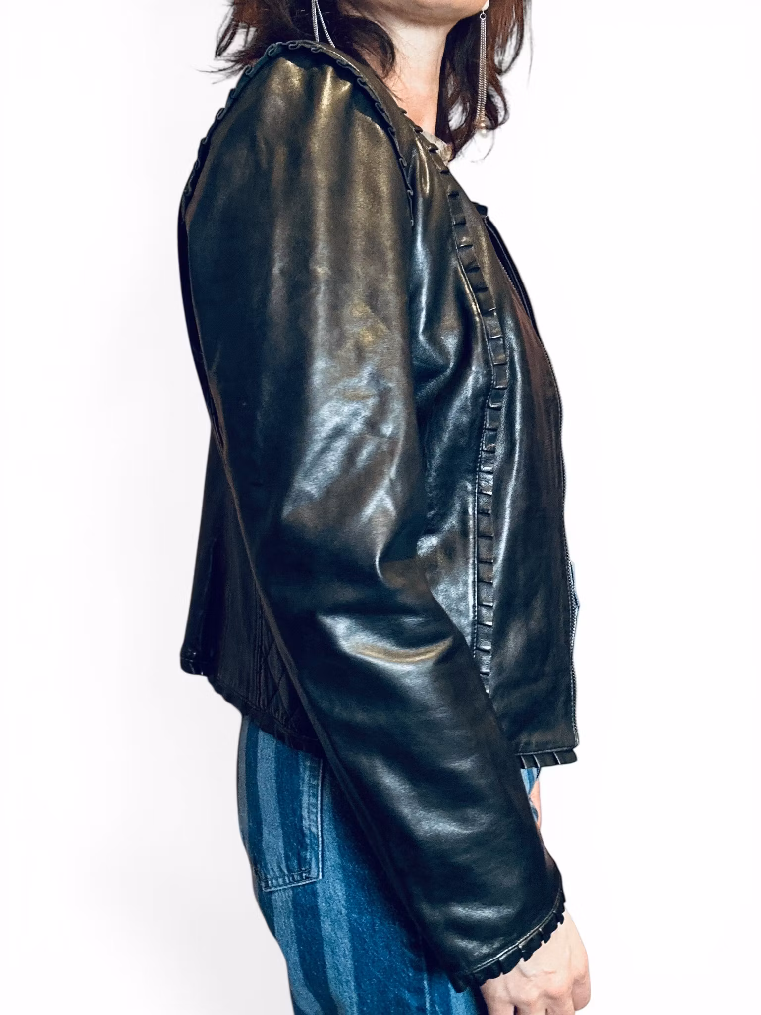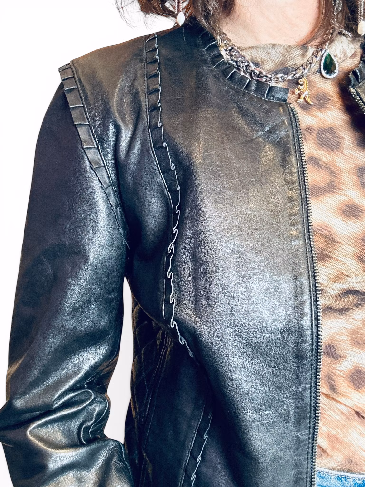 Beskrivning: Otroligt mjuk svart skinnjacka från Kello Scandinavia, som på 90-talet var kända för sitt kvalitetsläder. Här möter gulligt tufft med de söta volangerna och de quiltade partierna lånade från en MC-jacka.
