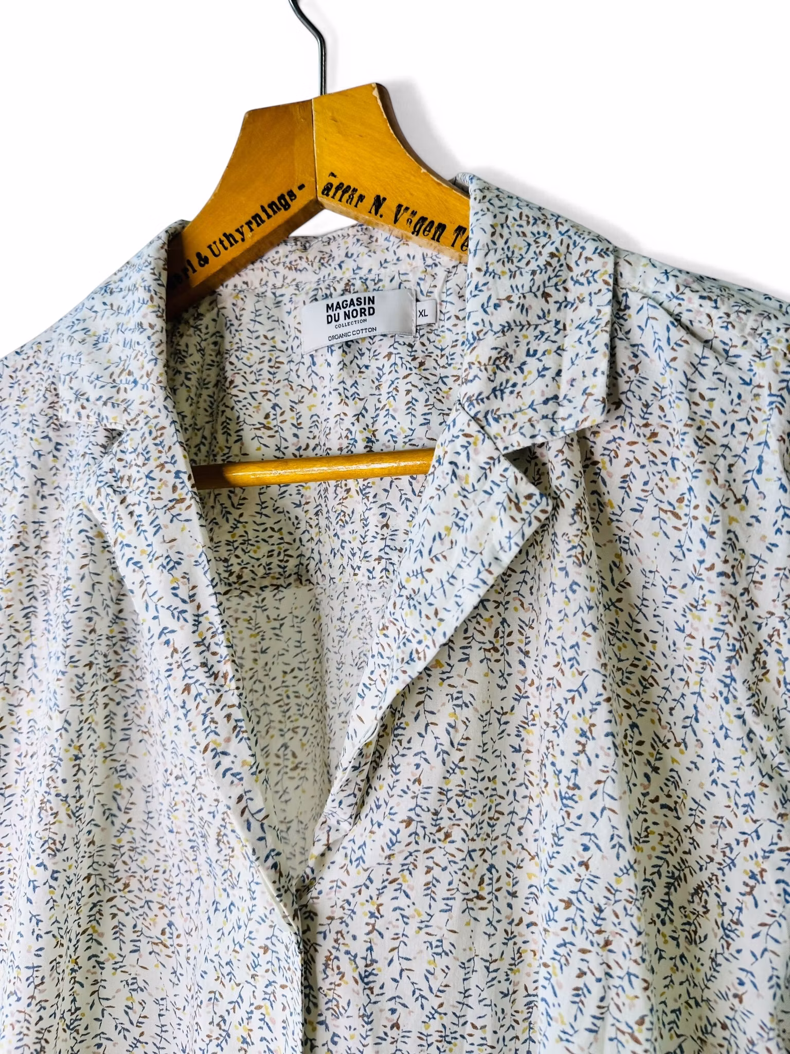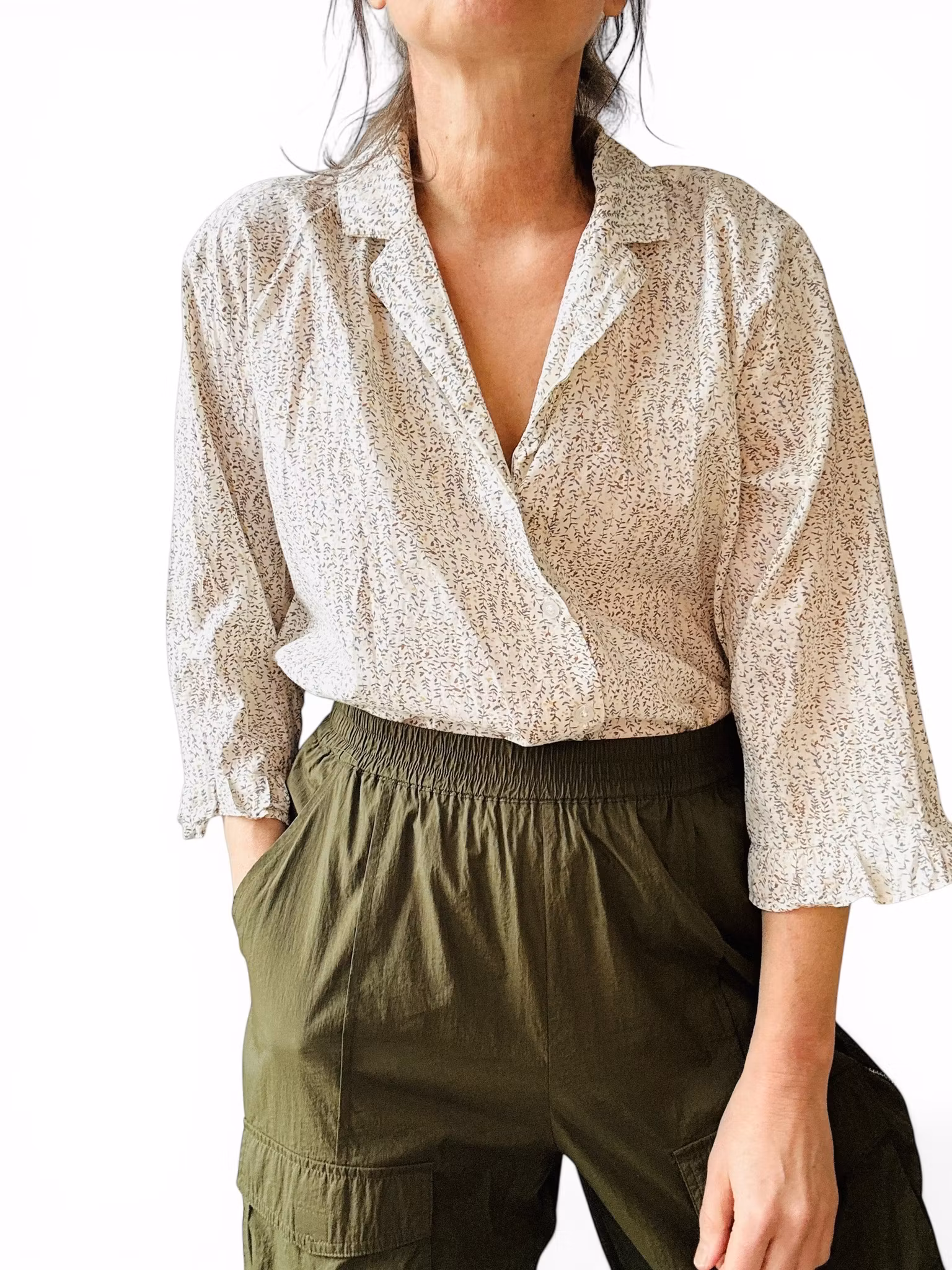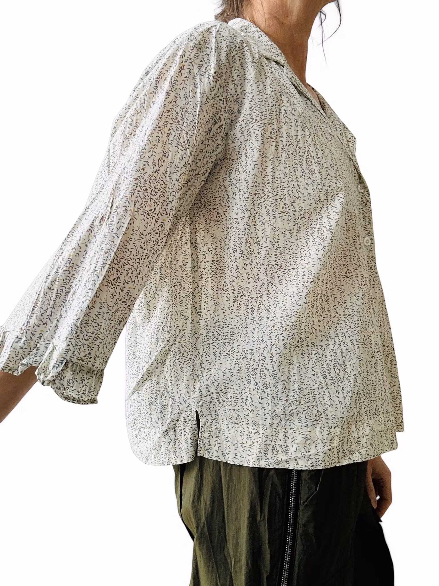 Beskrivning: Mönstrad blus från danska Magasin Nord i ekologisk bomull. Kavajöppning upptill och en trekvartsärm med liten volang.