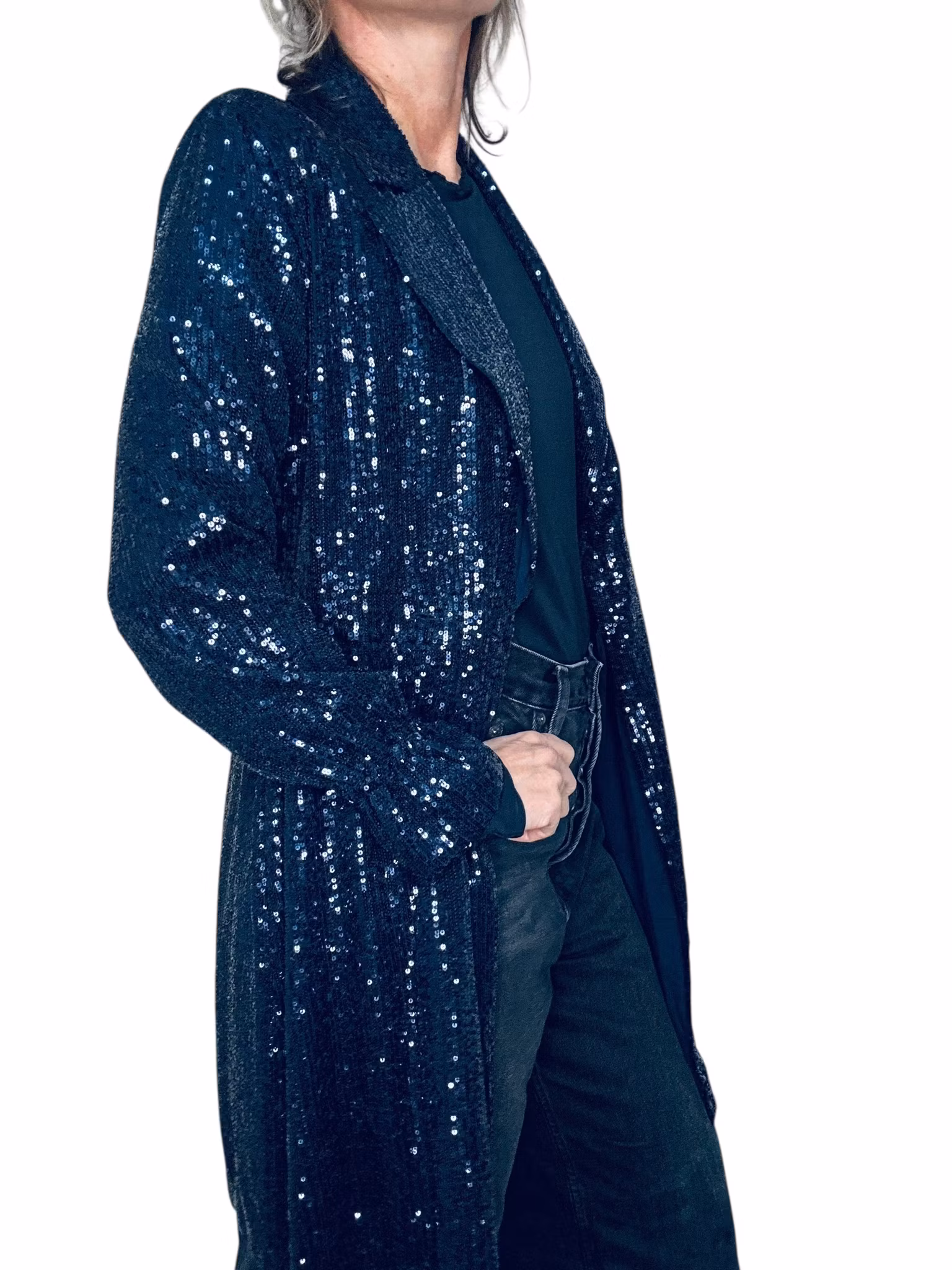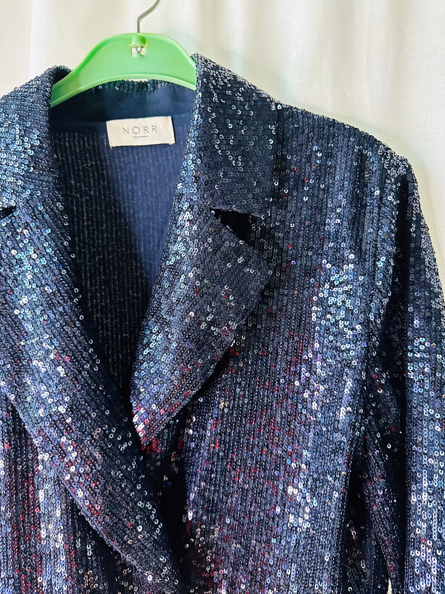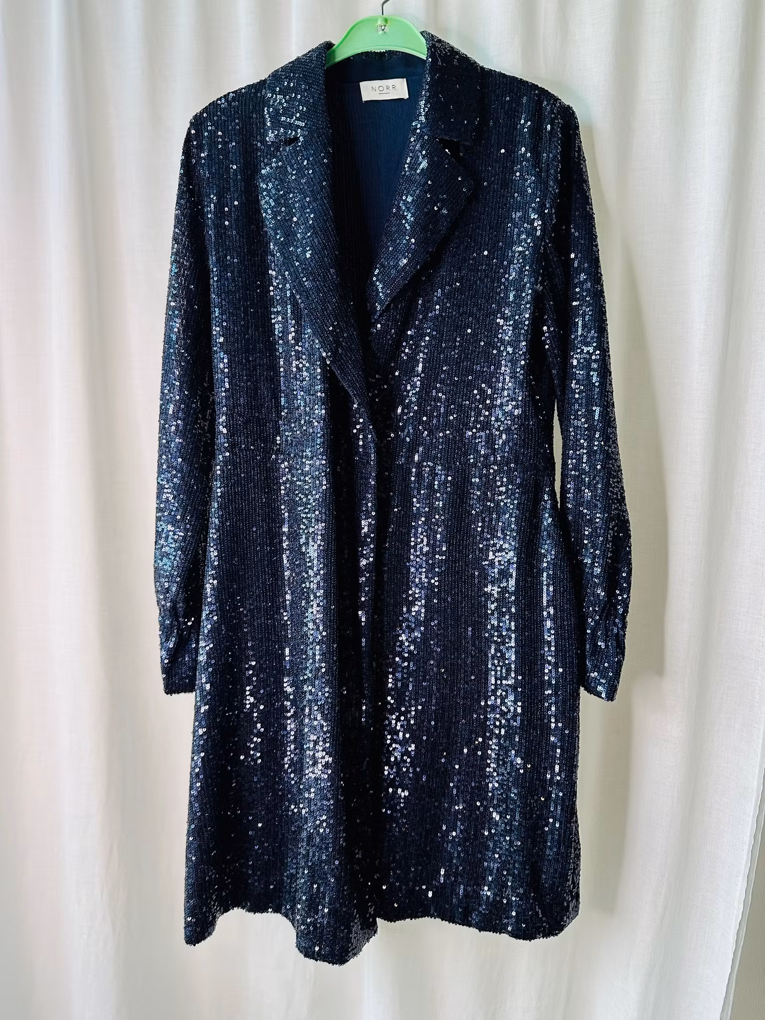 Beskrivning: Mörkblå klänning med sydda paljetter i en omlottmodell med kavajslag. Lika fin som klänning som den är att ha öppen som en längre paljettjacka. Från Norr. Helfodrad med mjukt tyg i viskos.