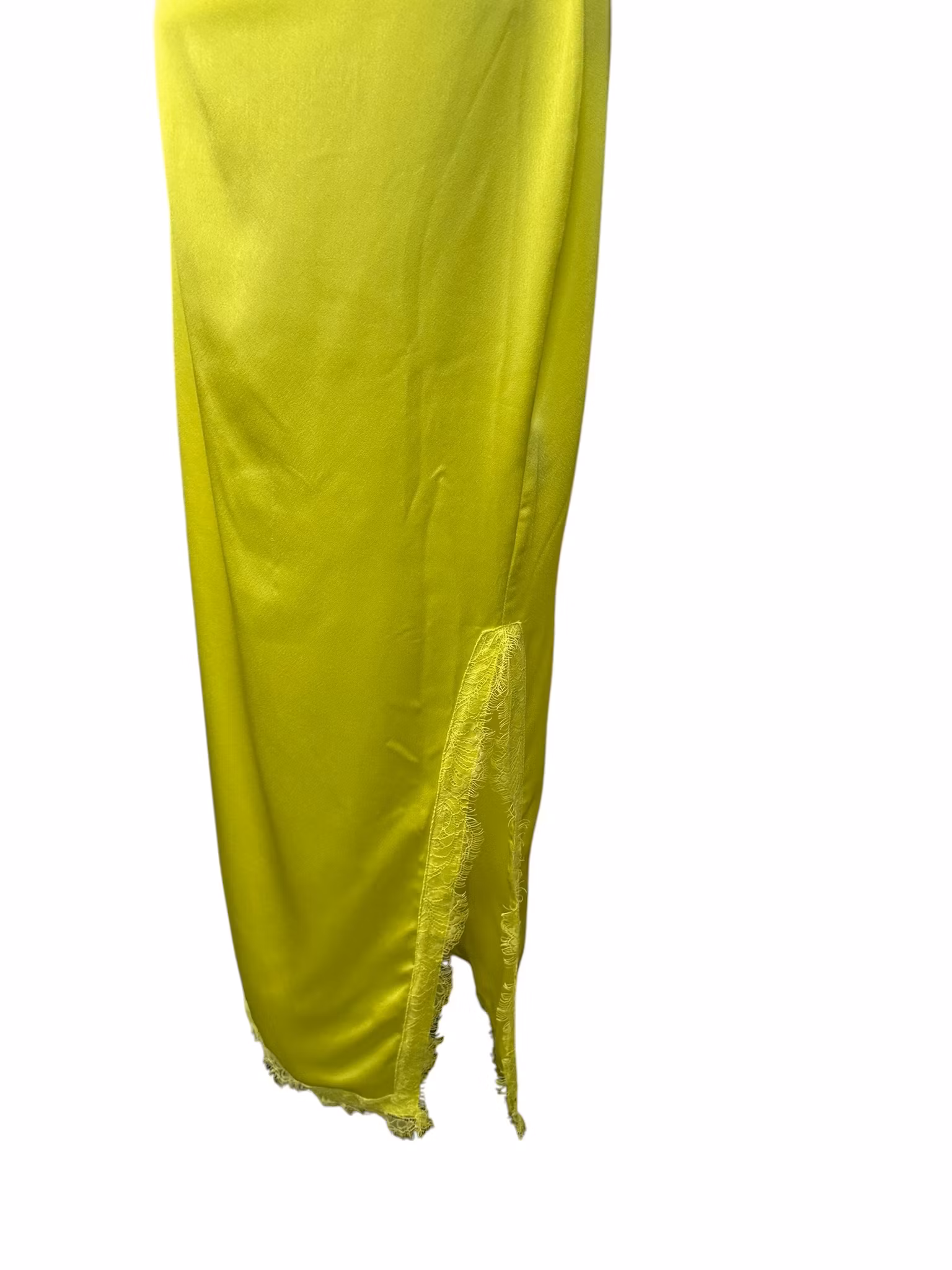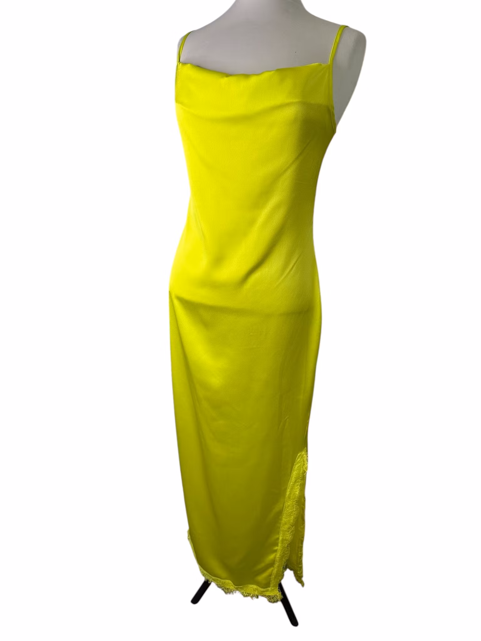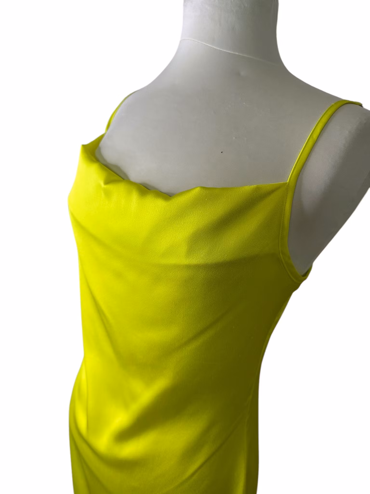Beskrivning: Nattlinneklänning i neon med draperad front, ställbara axelband och dragkedja i ryggen. Höga slitsar i sidorna med spets. Från Missguided.
