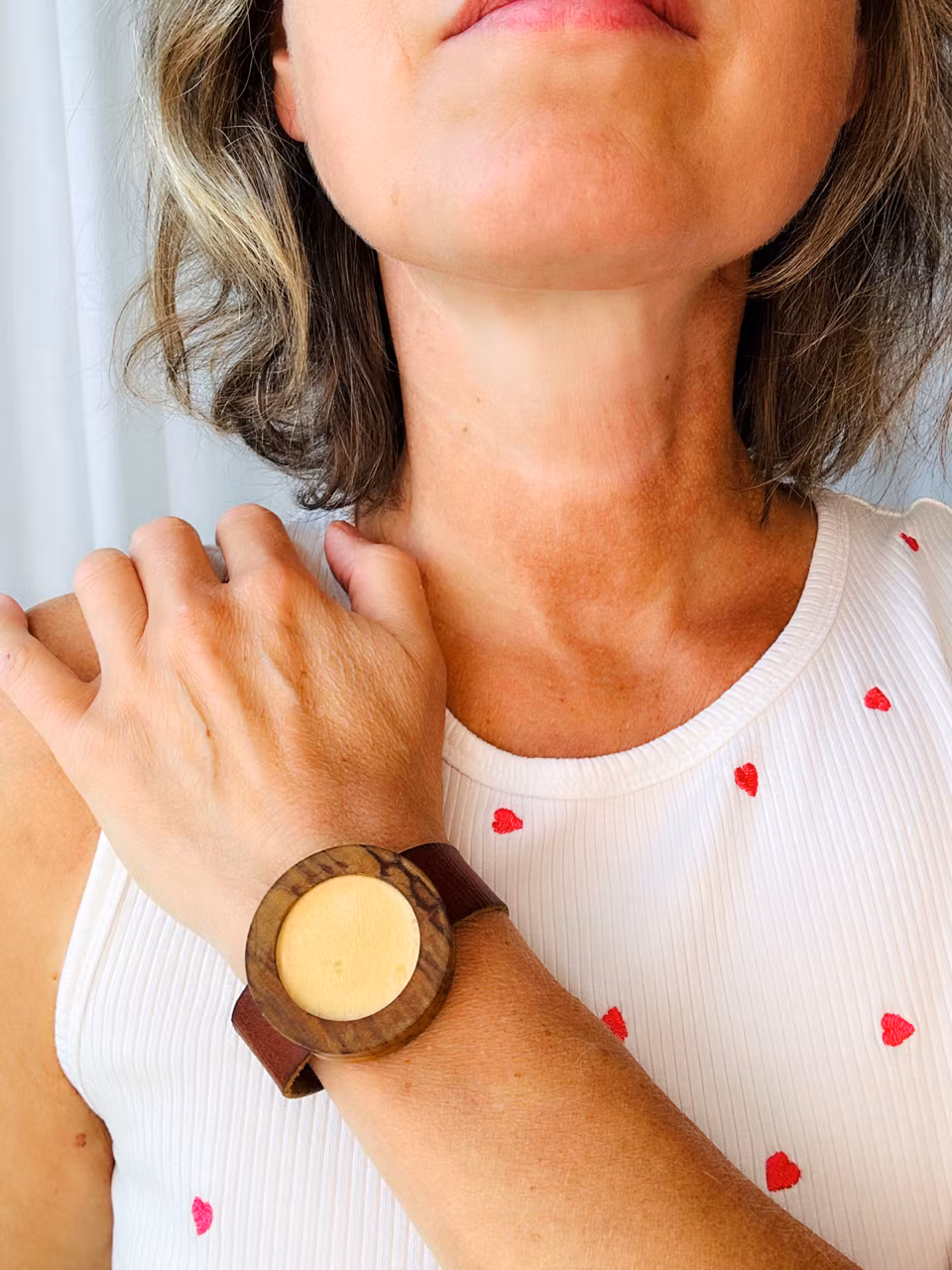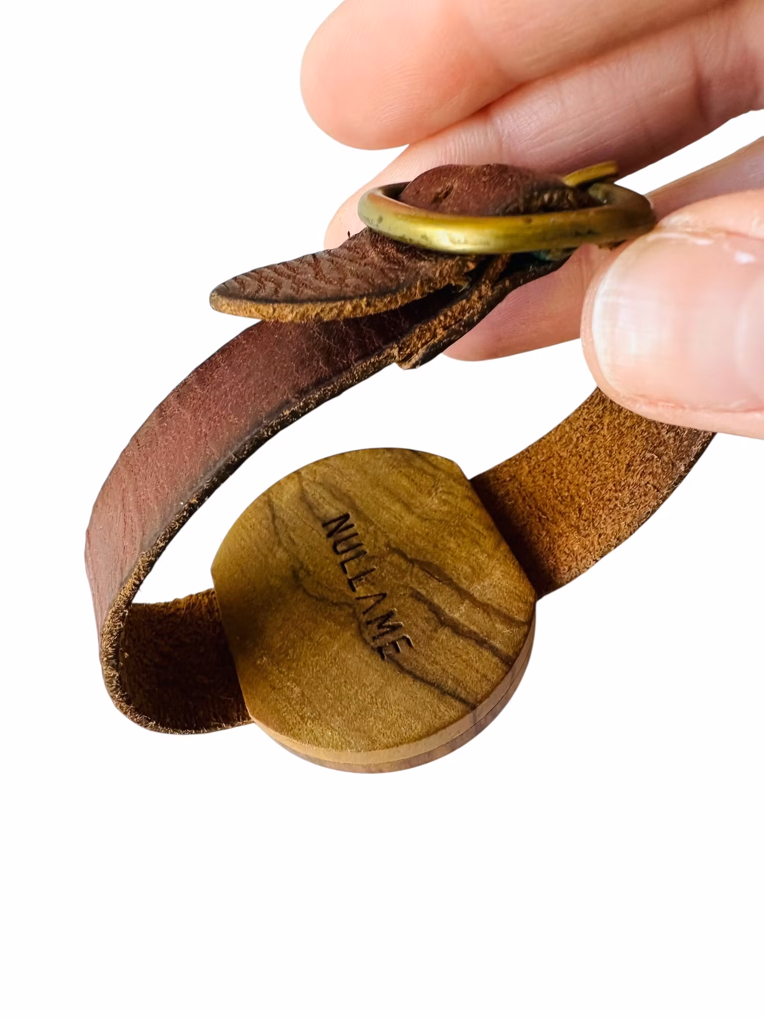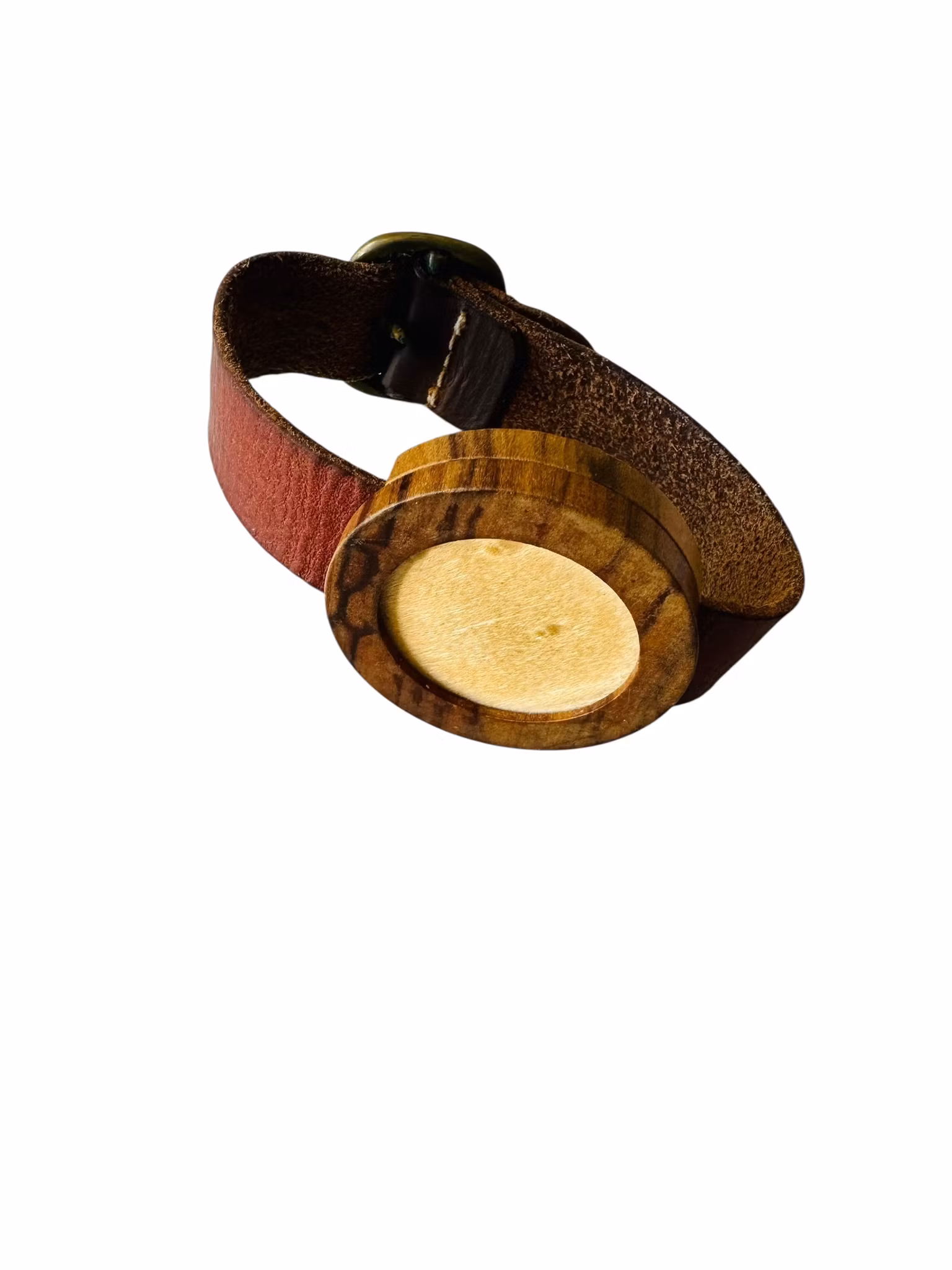 Beskrivning: Handgjort italienskt armband från Nullame. I läder och trä. Nypris ca 600kr.