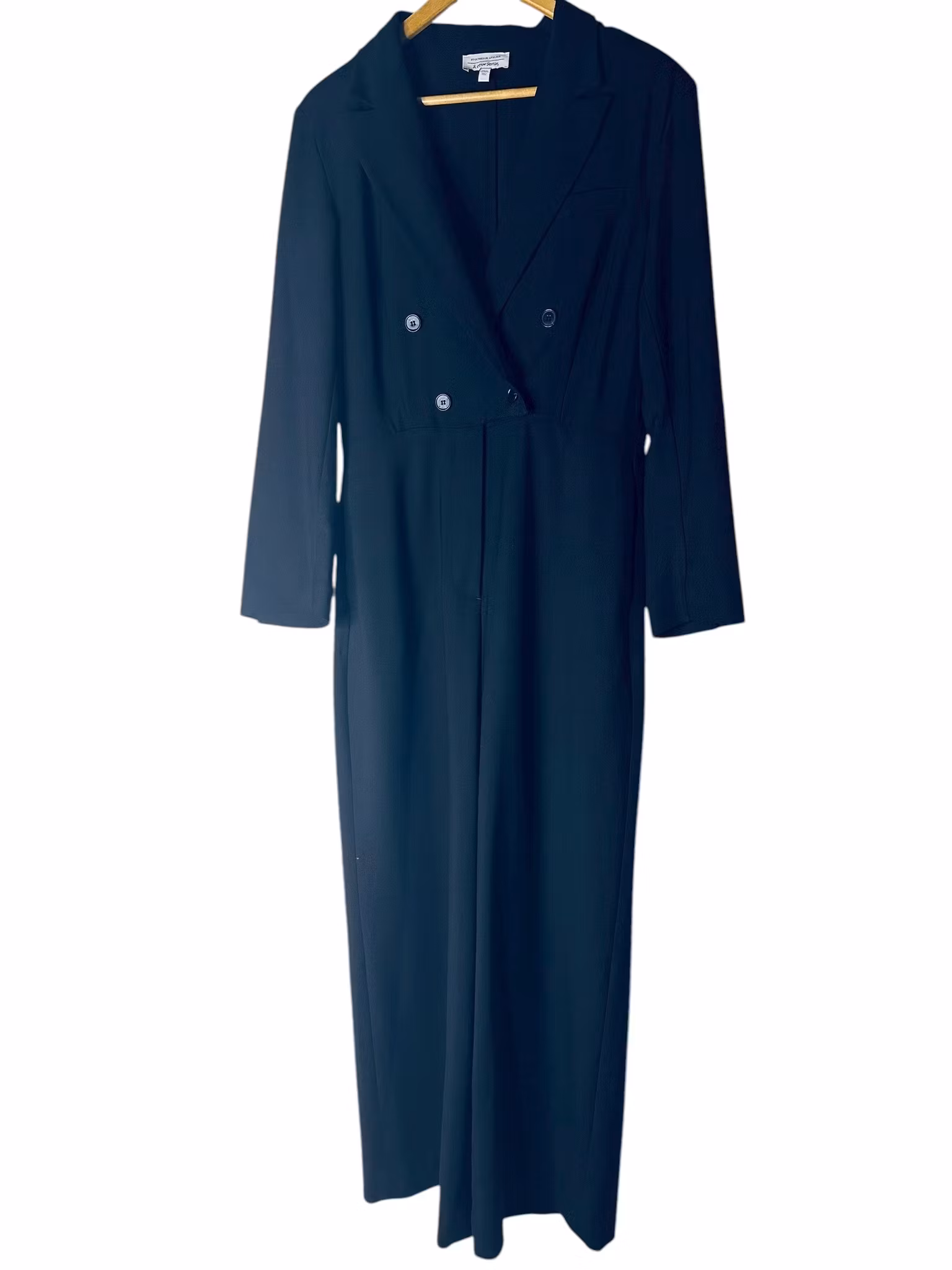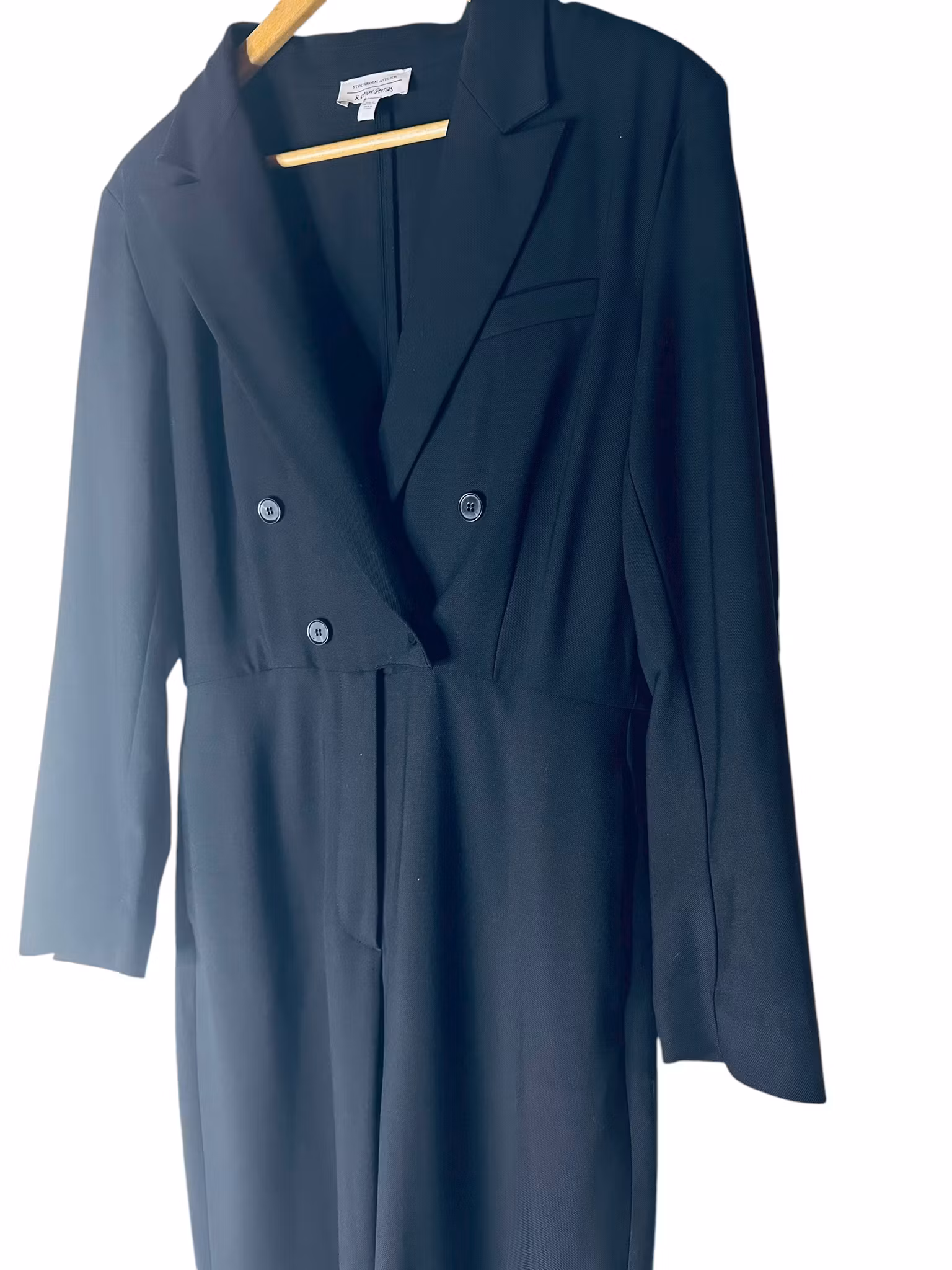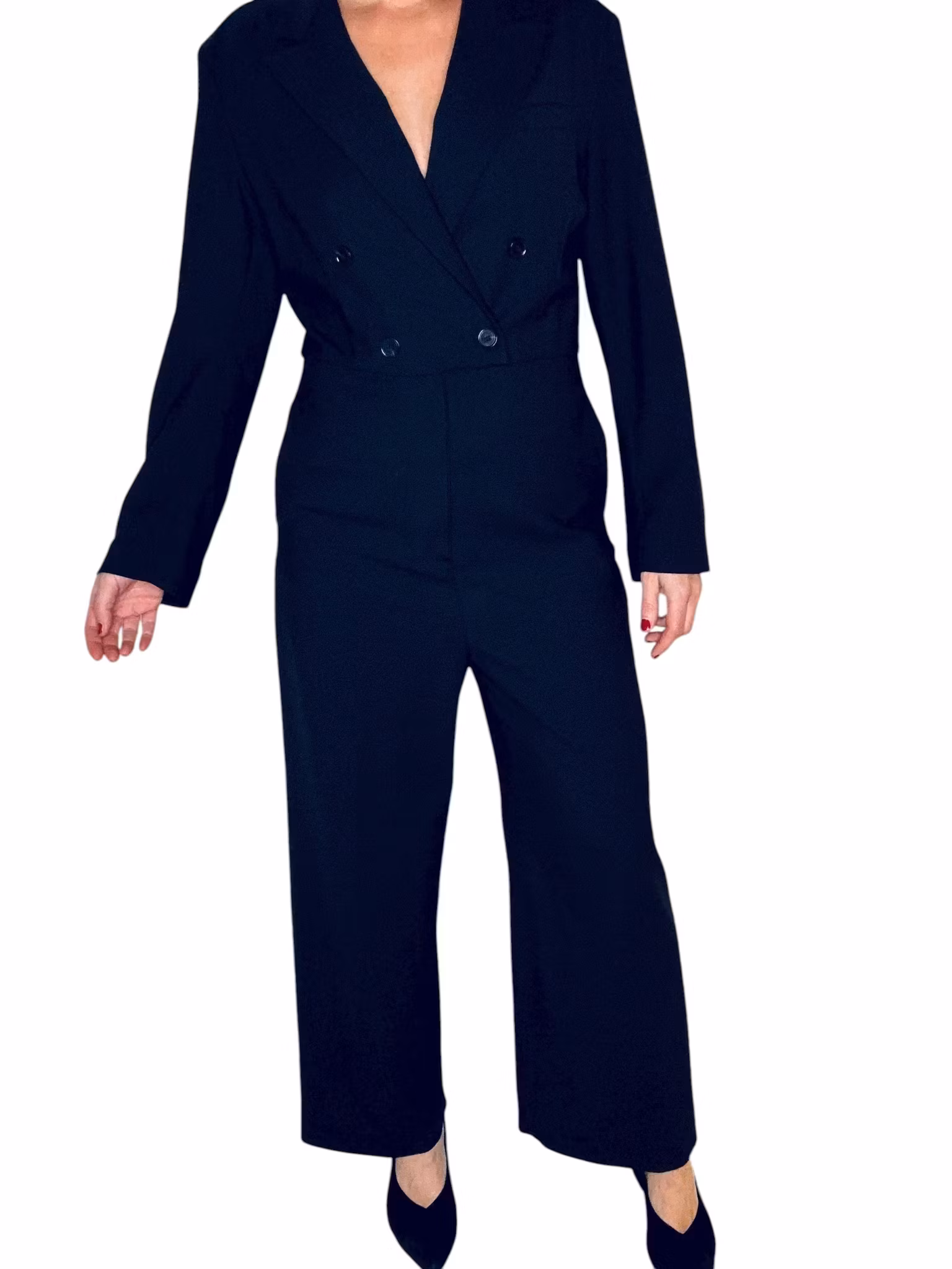 Beskrivning: Svart jumpsuit från & Other Stories i ullmix. Som en kostym - fast ihop! Kavajslag och dubbelknäppt, något markerad midja som är fin att markera ytterligare med udda bälte, gylf med dragkedja och raka ben. Lång ärm, en bröstficka, stolpfickor bak och fickor i sidorna.