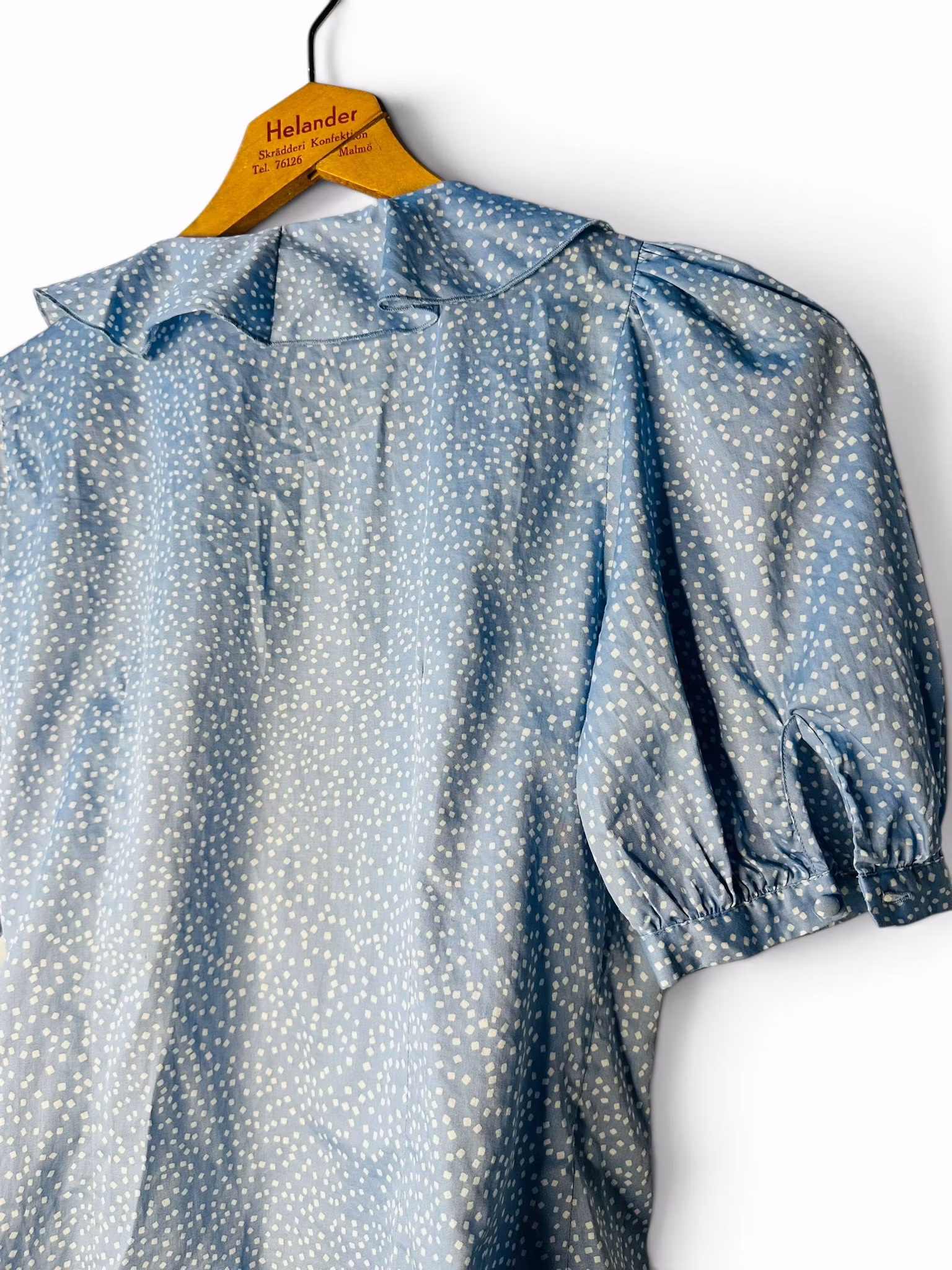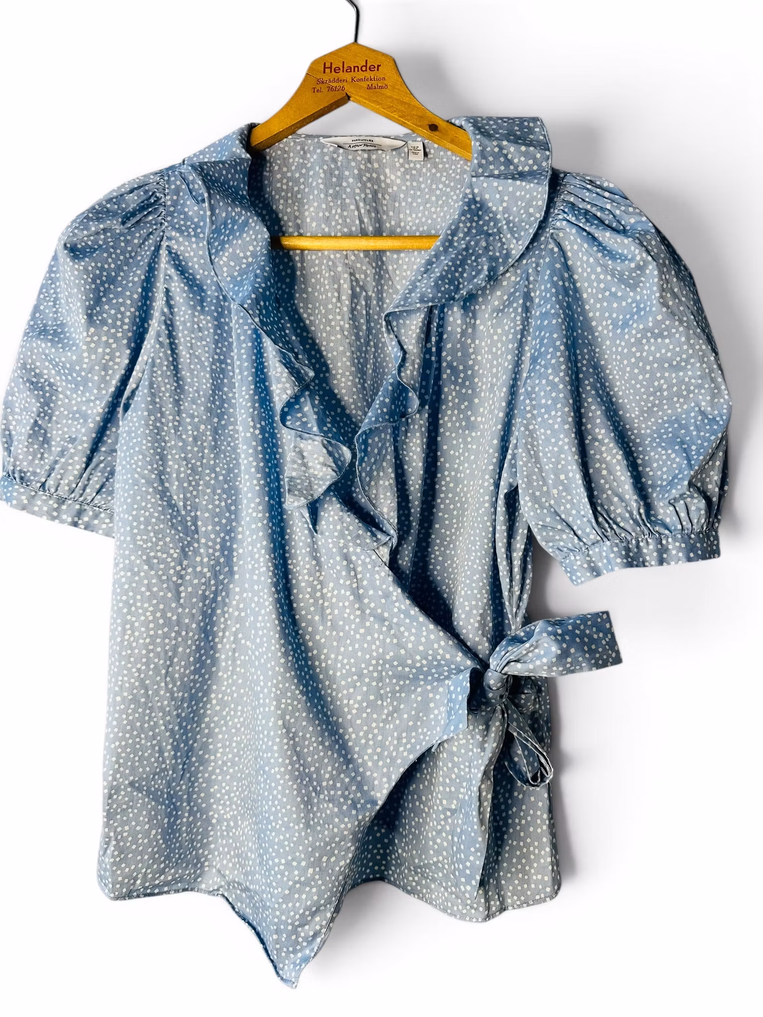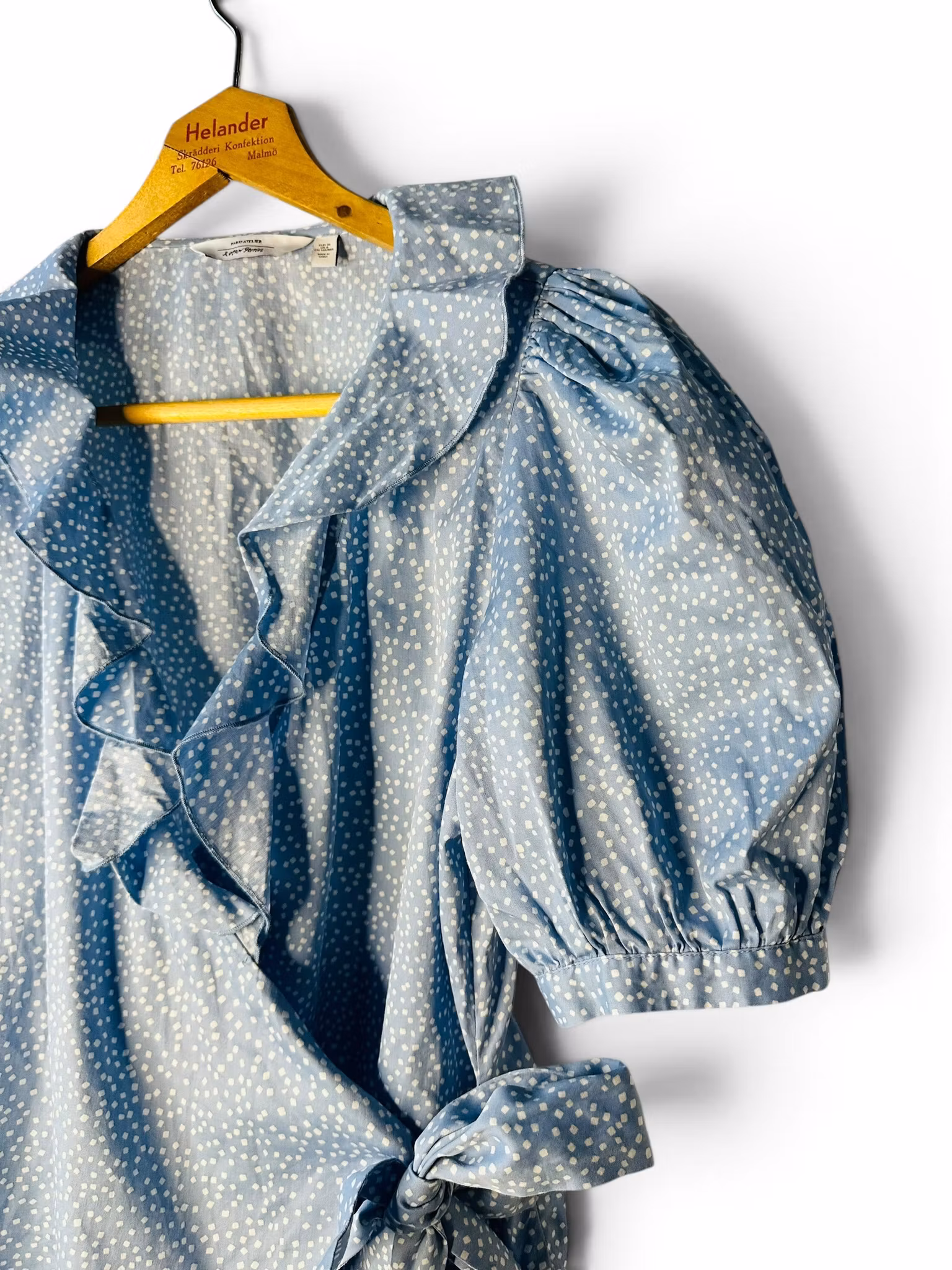 Sökord: & other stories blus, blå omlottblus, prickig blus dam, puffärm blus, romantisk blus, bomullsblus dam, ljusblå topp, sommarblus dam, volangblus, second hand & other stories