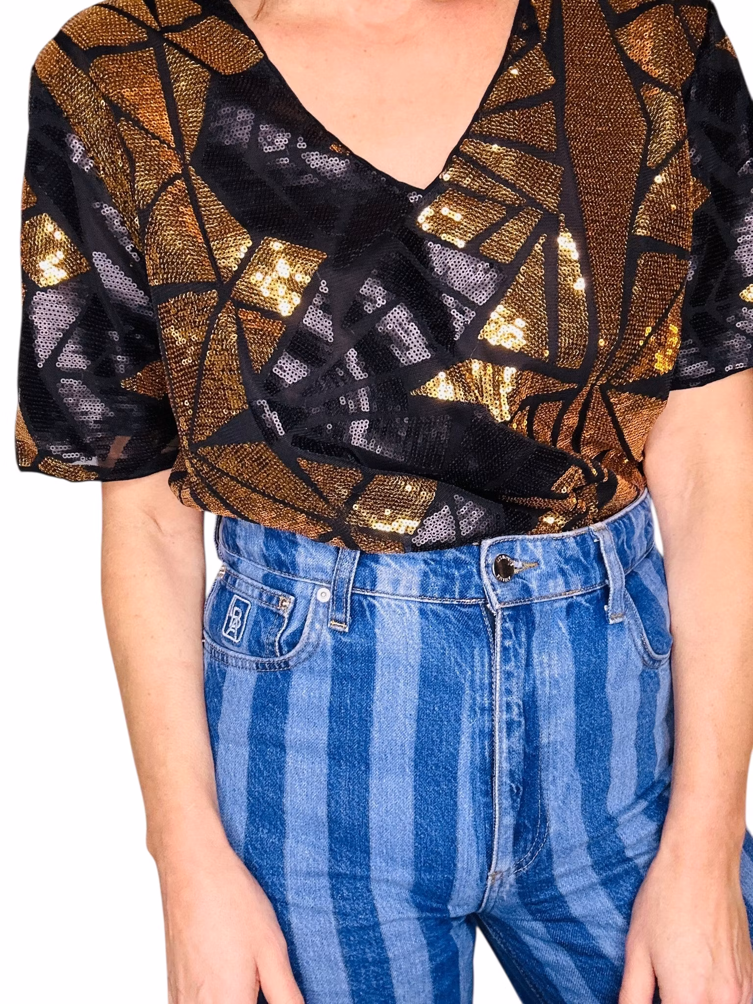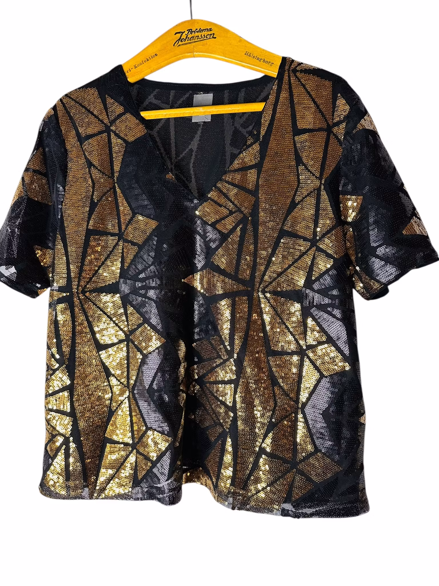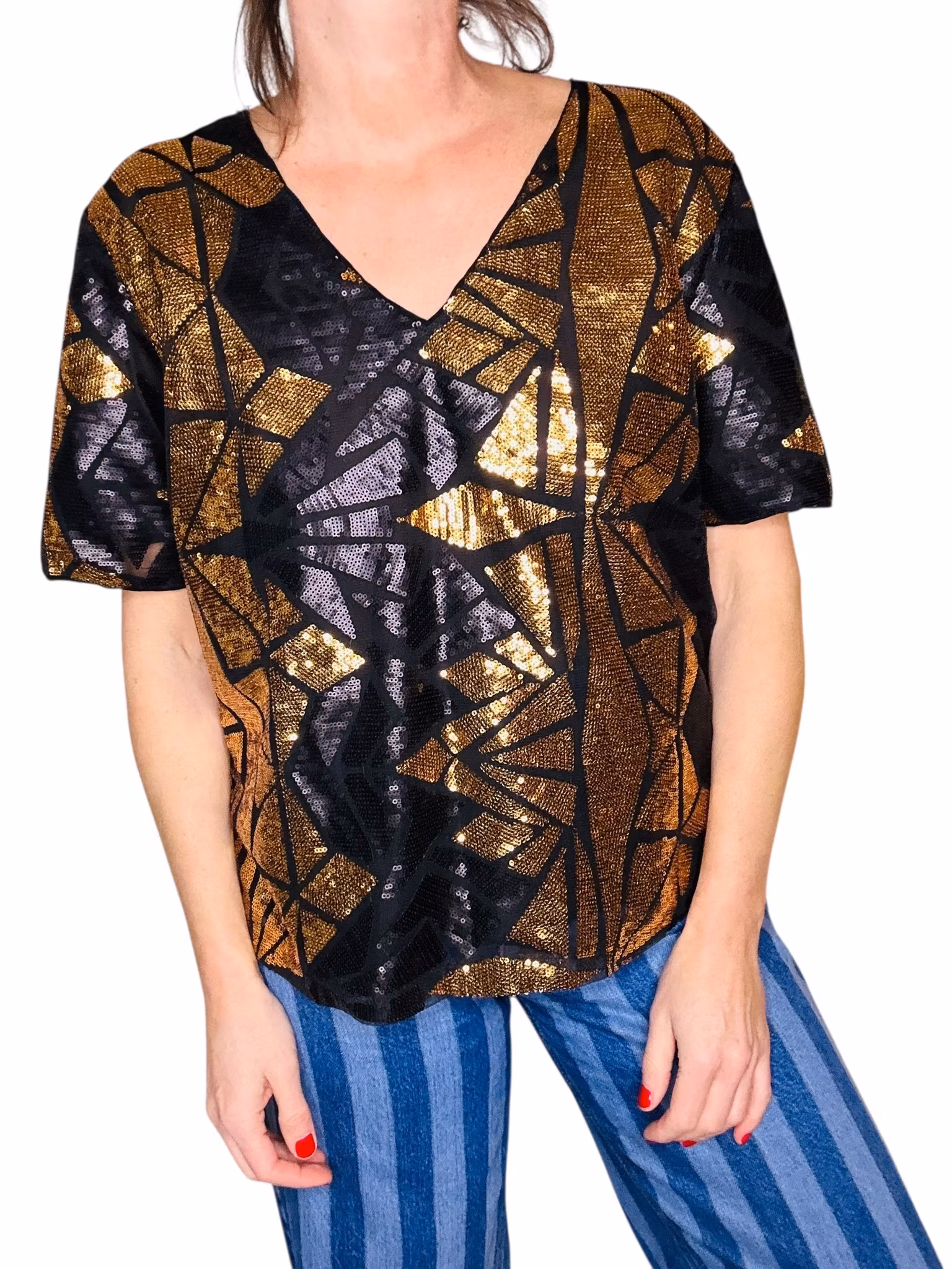 Beskrivning: Topp med paljetter i guld och silver som bildar ett geometriskt mönster. Boxig modell med kort ärm och v-ringad hals. Helfodrad. Från Ichi.