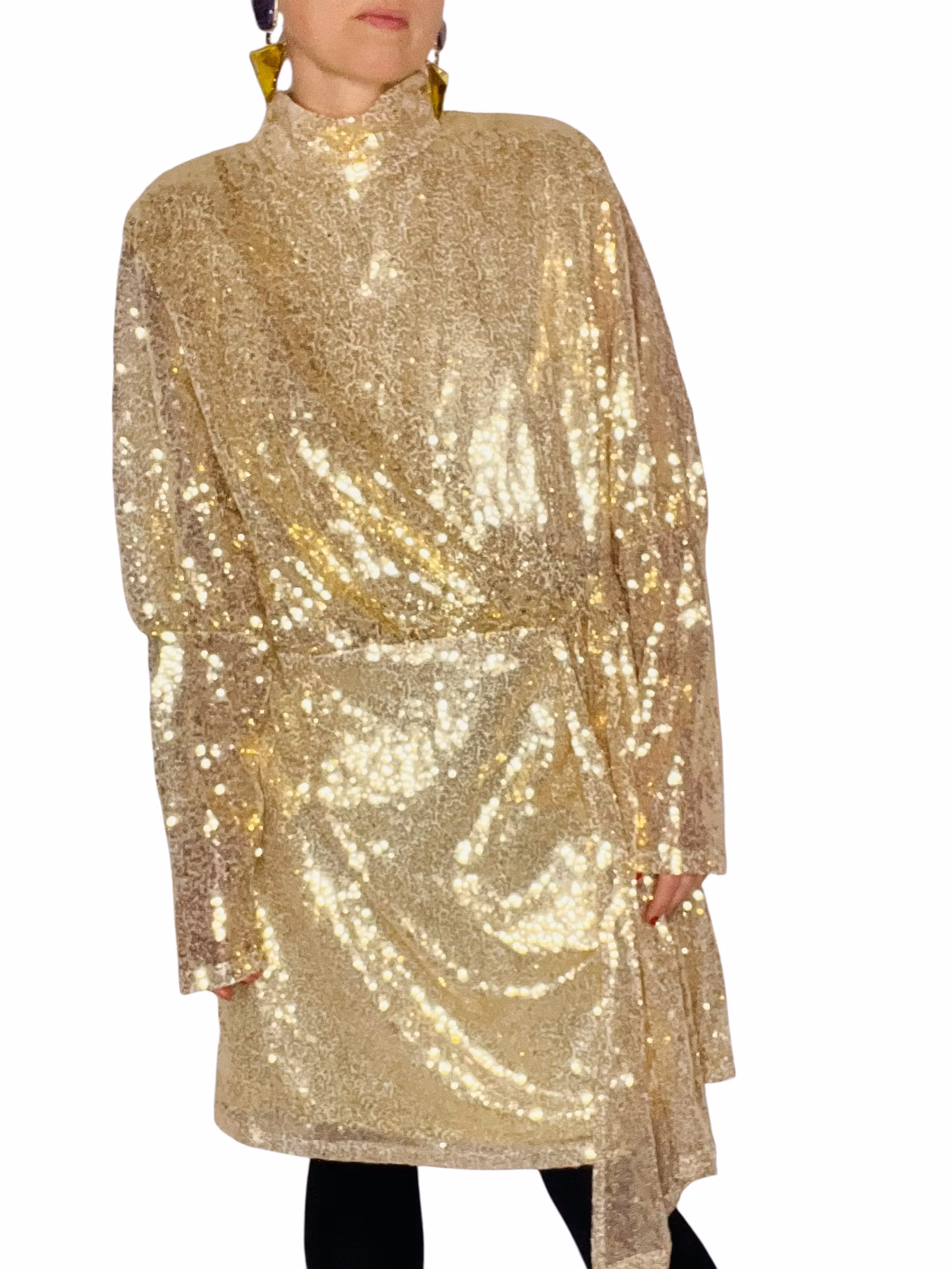 Beskrivning: Guldig paljettklänning NWT. Halvhög krage och dragkedja i ryggen. Fuskomlott framtill med en del som hänger lite längre ner. Tajta ärmar vid manschetterna och vidare vid axlarna. Från Bohoo.