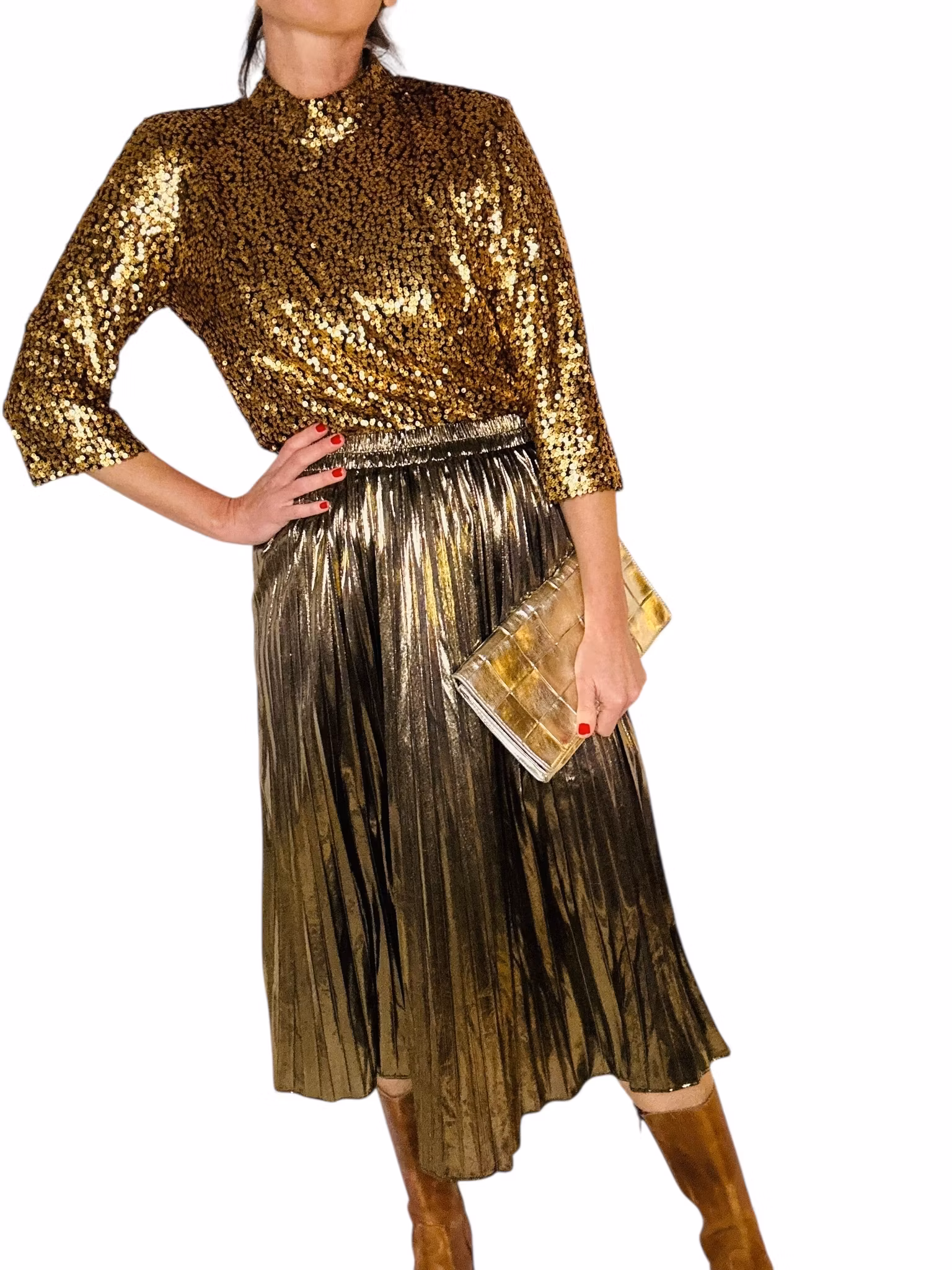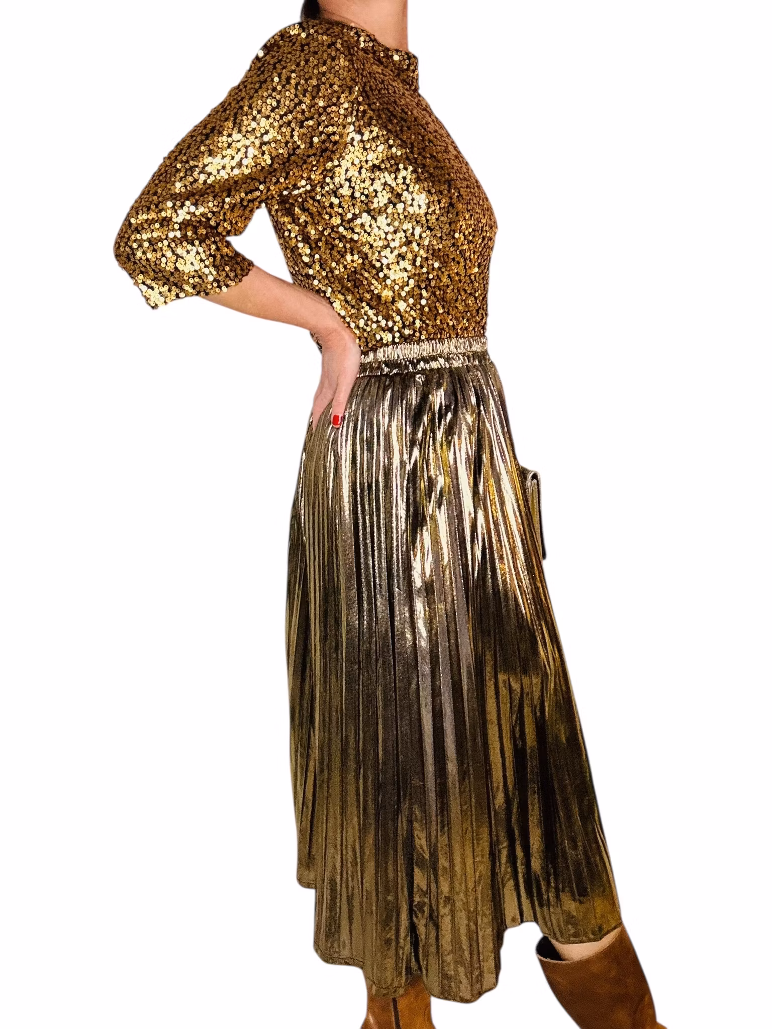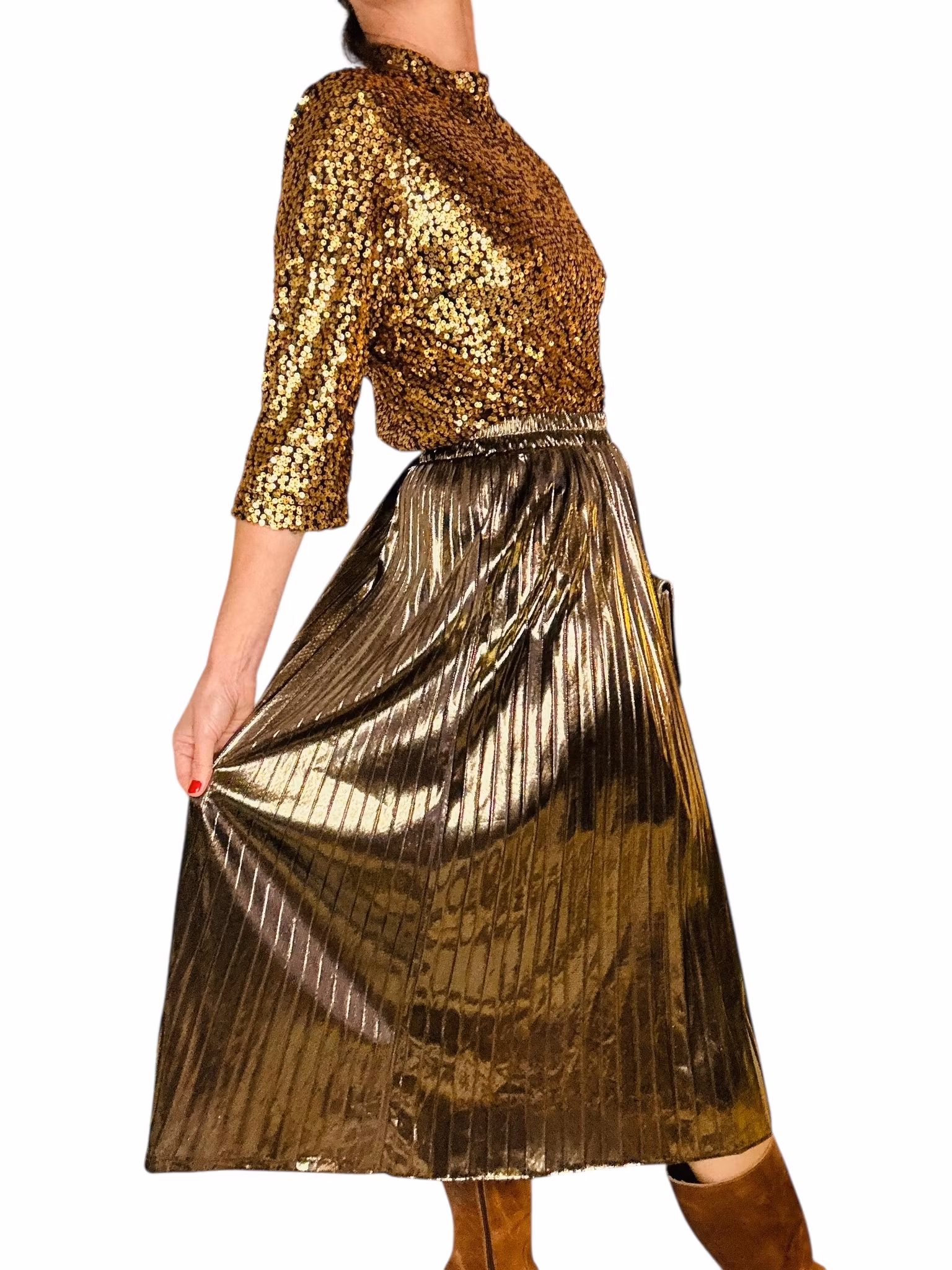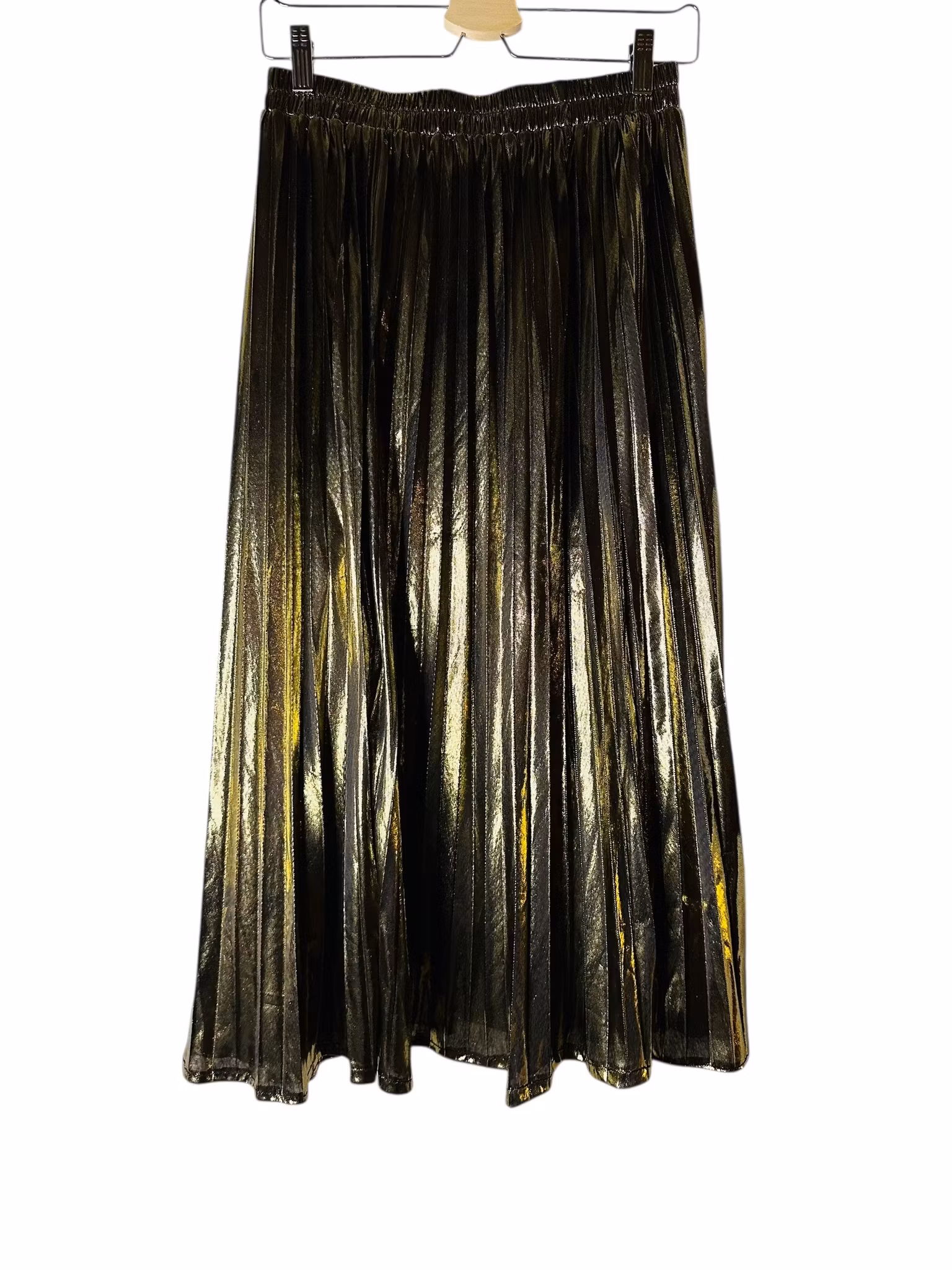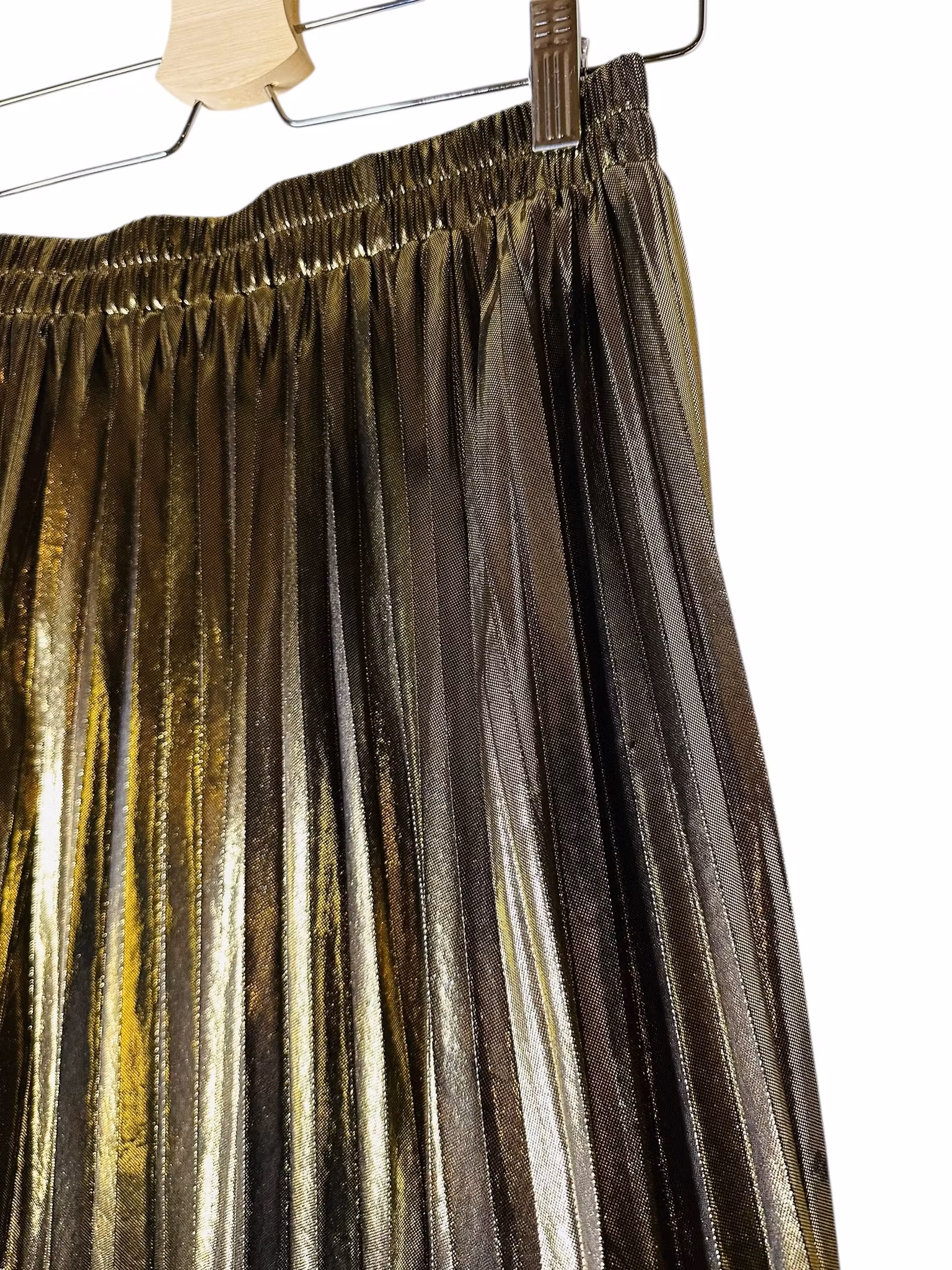 Beskrivning: Plisserad kjol i guldmetallic. Bred resårmidja och fodrad till cirka knähöjd med ett stretchigt material. Saknar lappar.