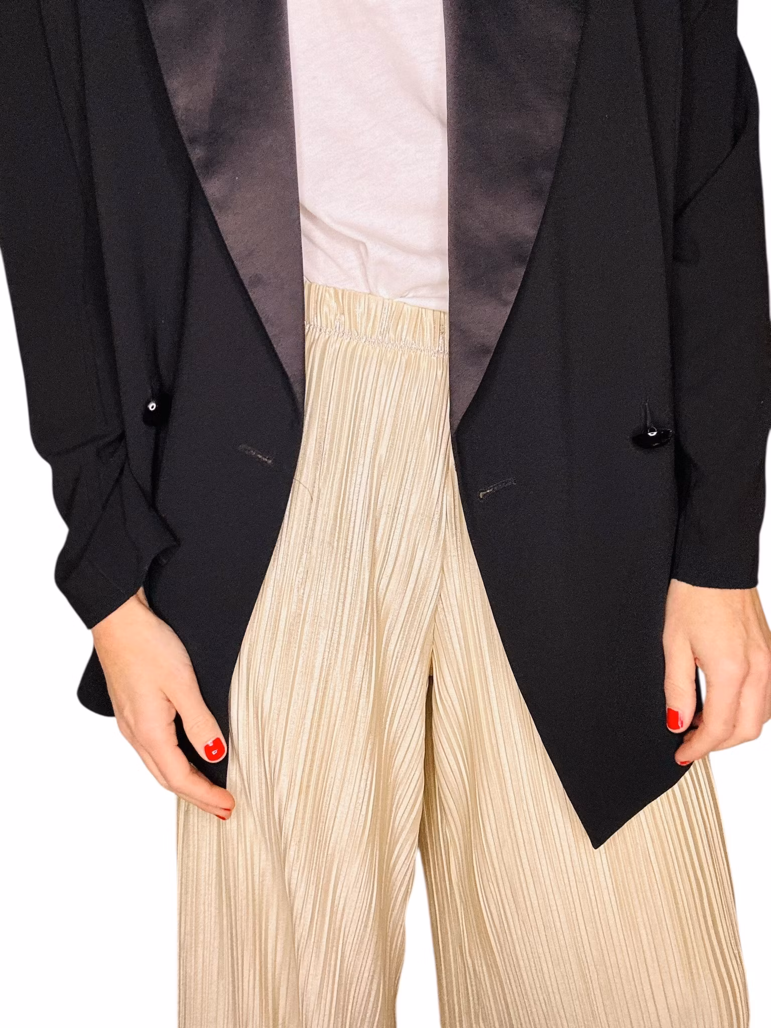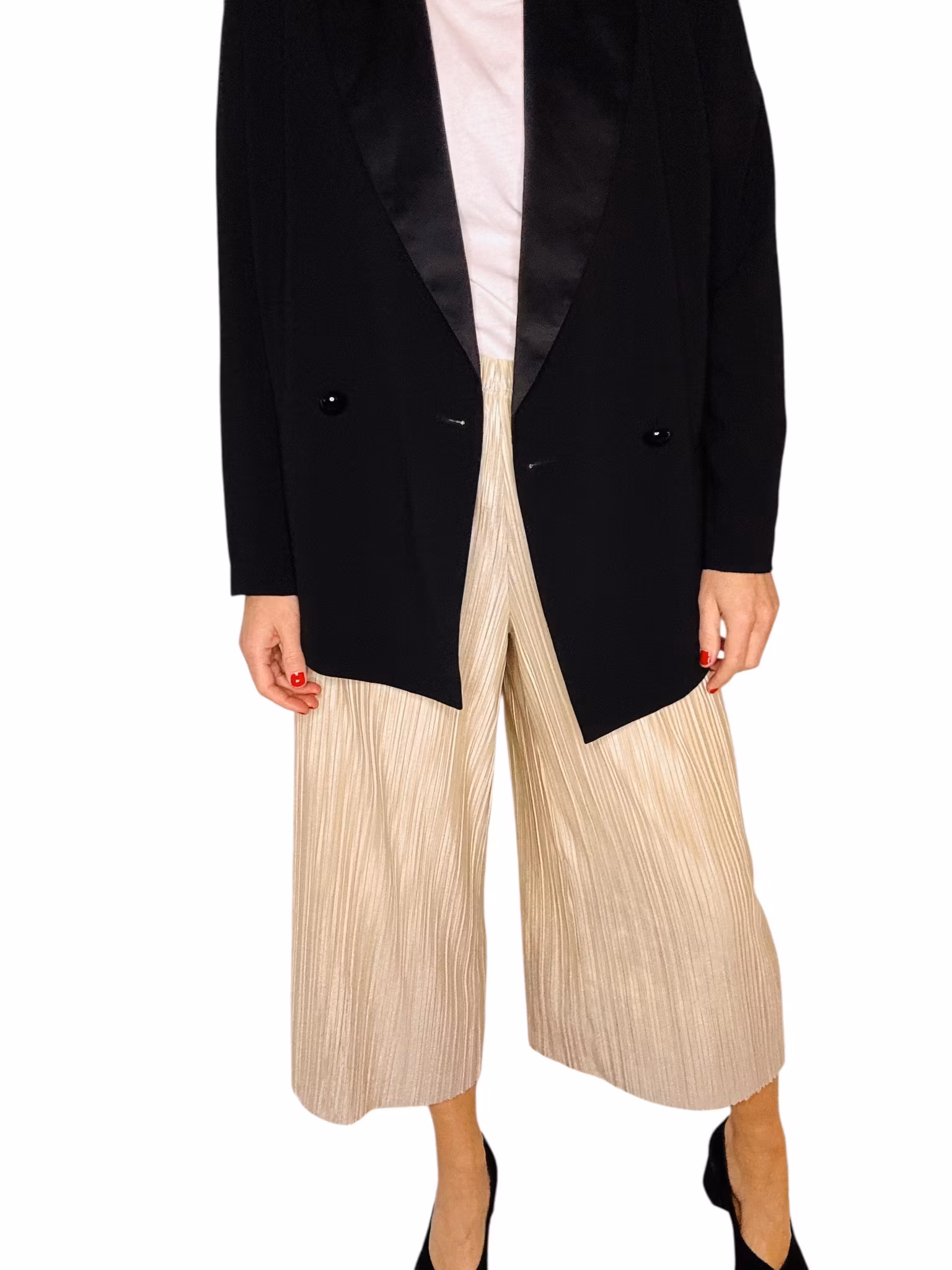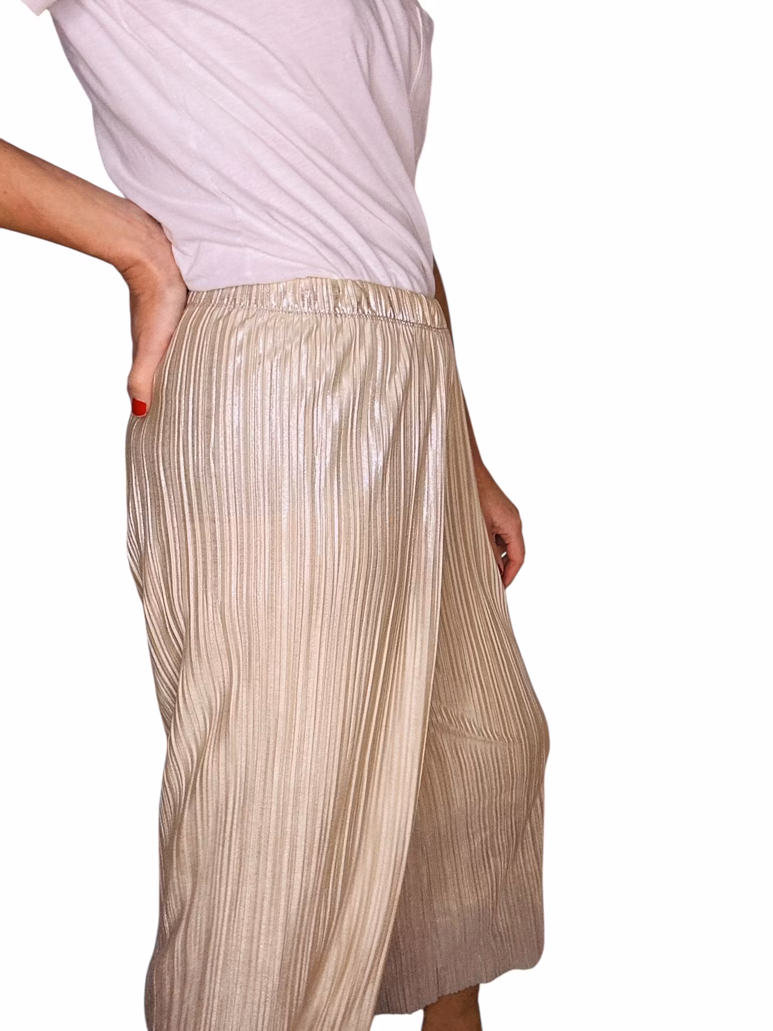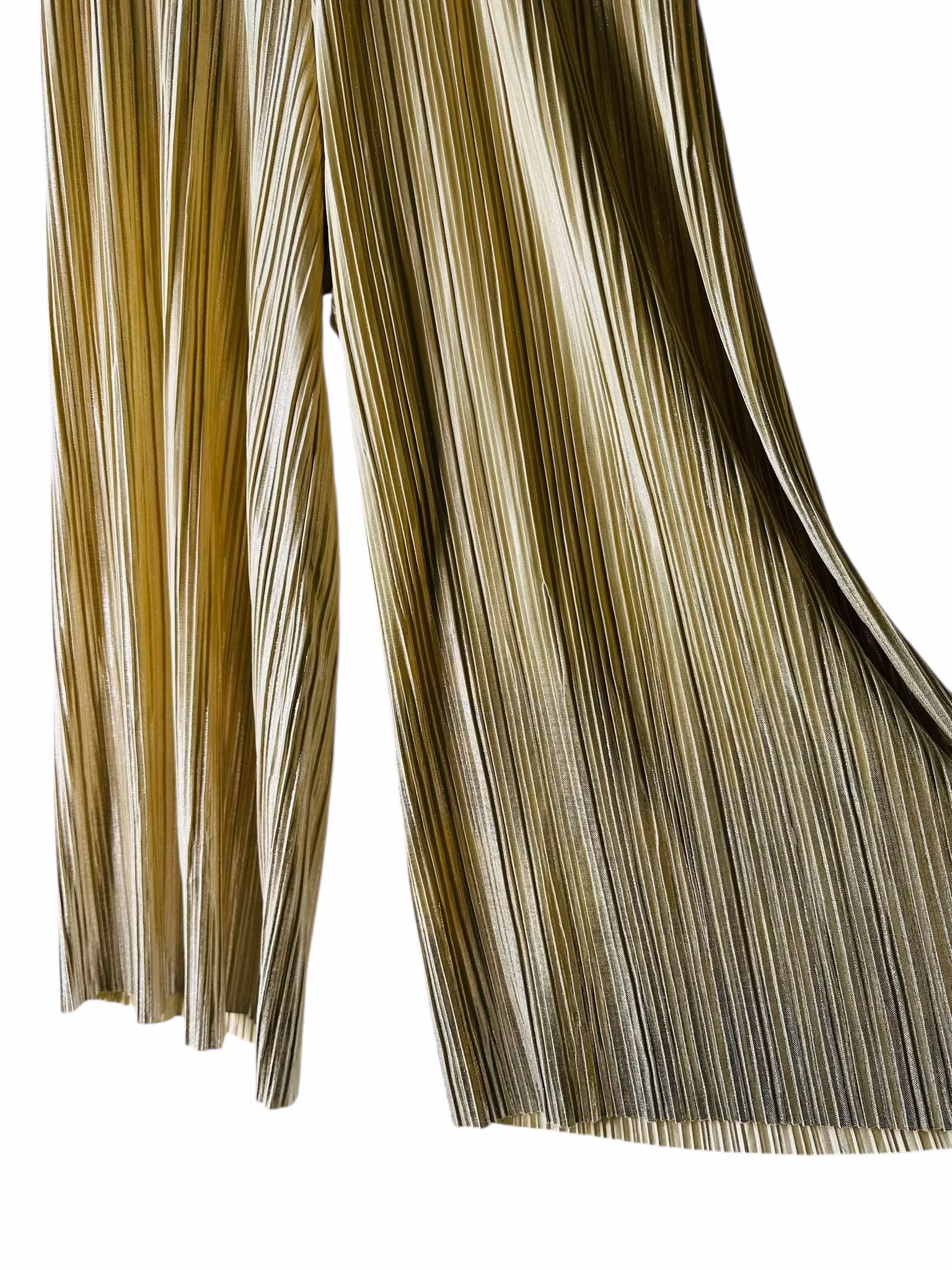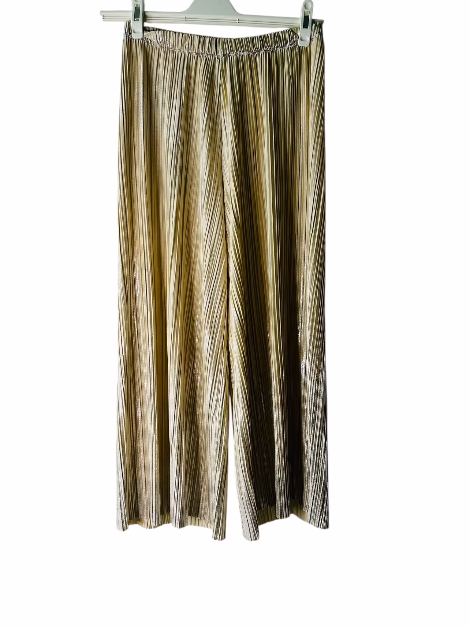 Beskrivning: Kanske världens bekvämaste bralla! Dessa plisserade blanka byxorna funkar både som lounge och till jobb och fest! Här i ljust guldmetallic med vida ben från Gina Tricot.