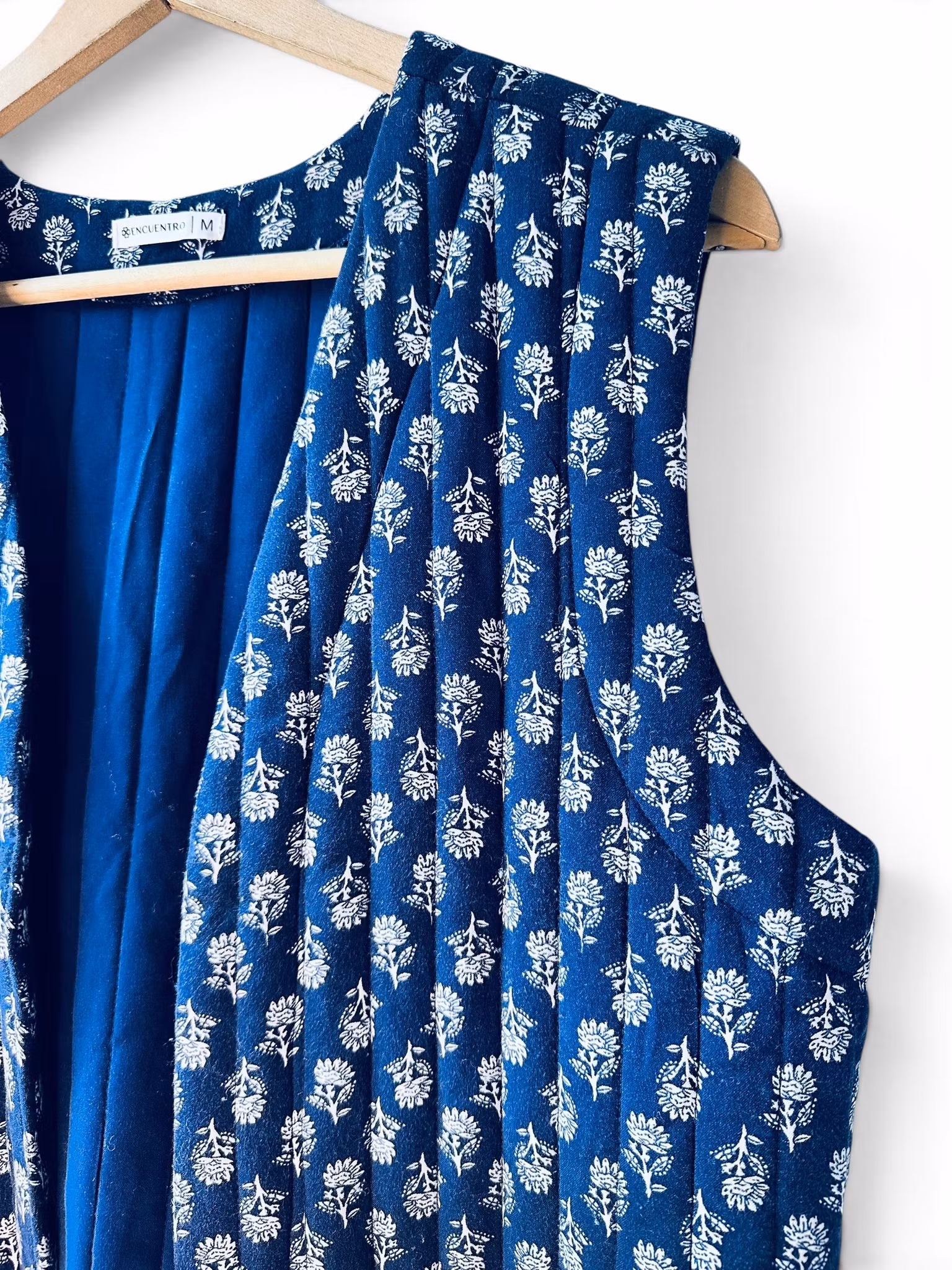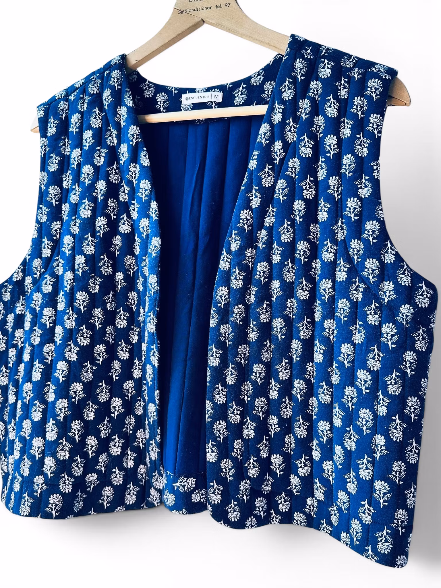 Beskrivning: En mjuk, quiltad väst från spanska Encuentro i djup indigoblå ton med ett fint småblommigt mönster. Den lätt vadderade kvaliteten ger både struktur och en ombonad känsla, samtidigt som de vertikala stickningarna skapar ett smickrande fall. Modellen har öppen front och en avslappnad, något croppad silhuett – perfekt för lager på lager.