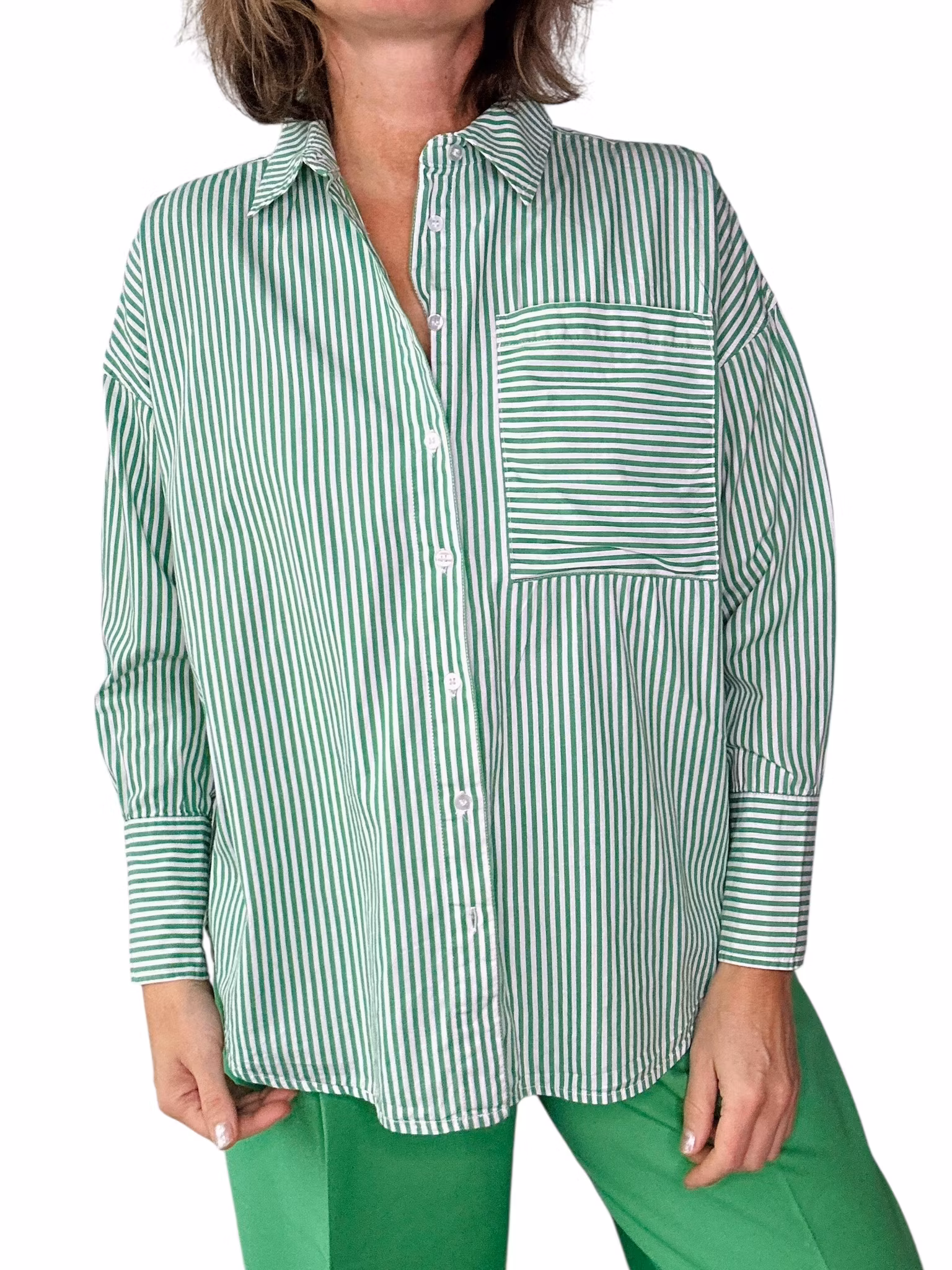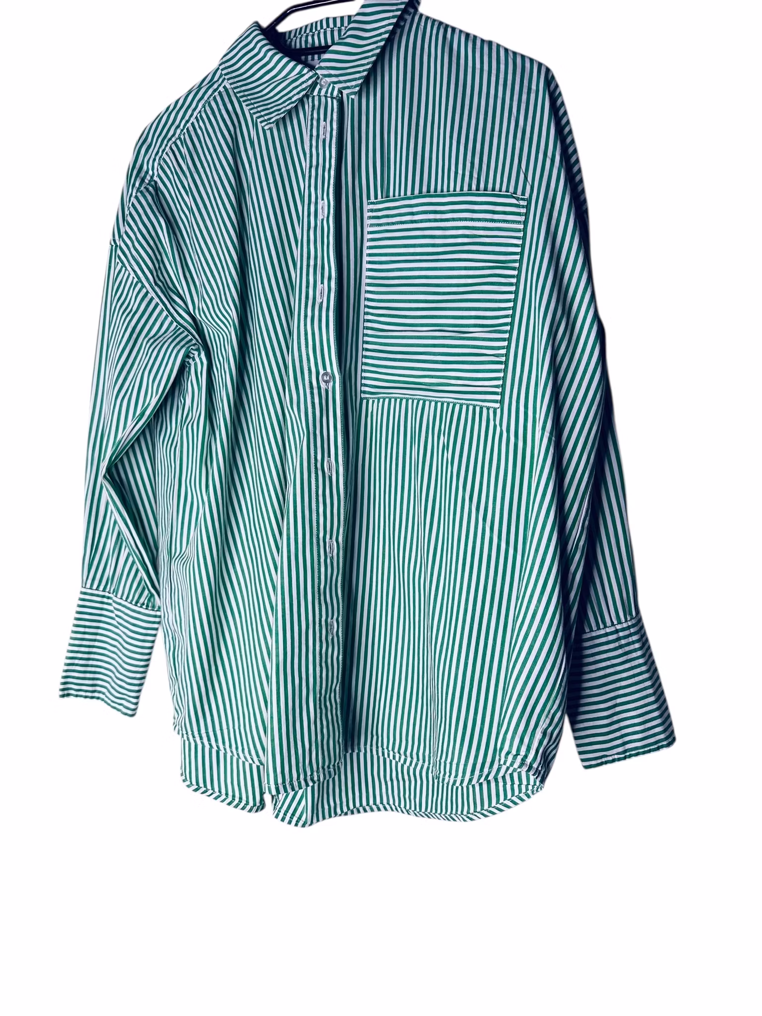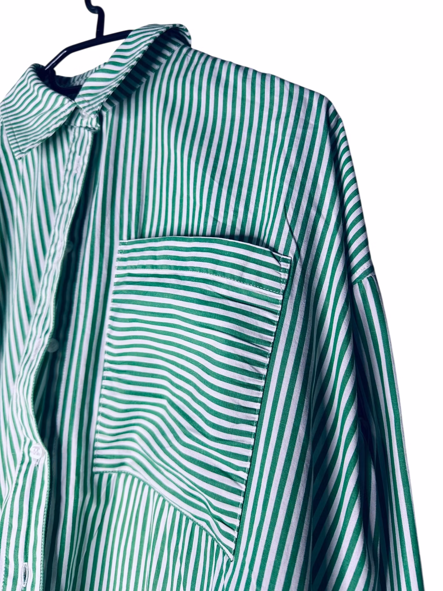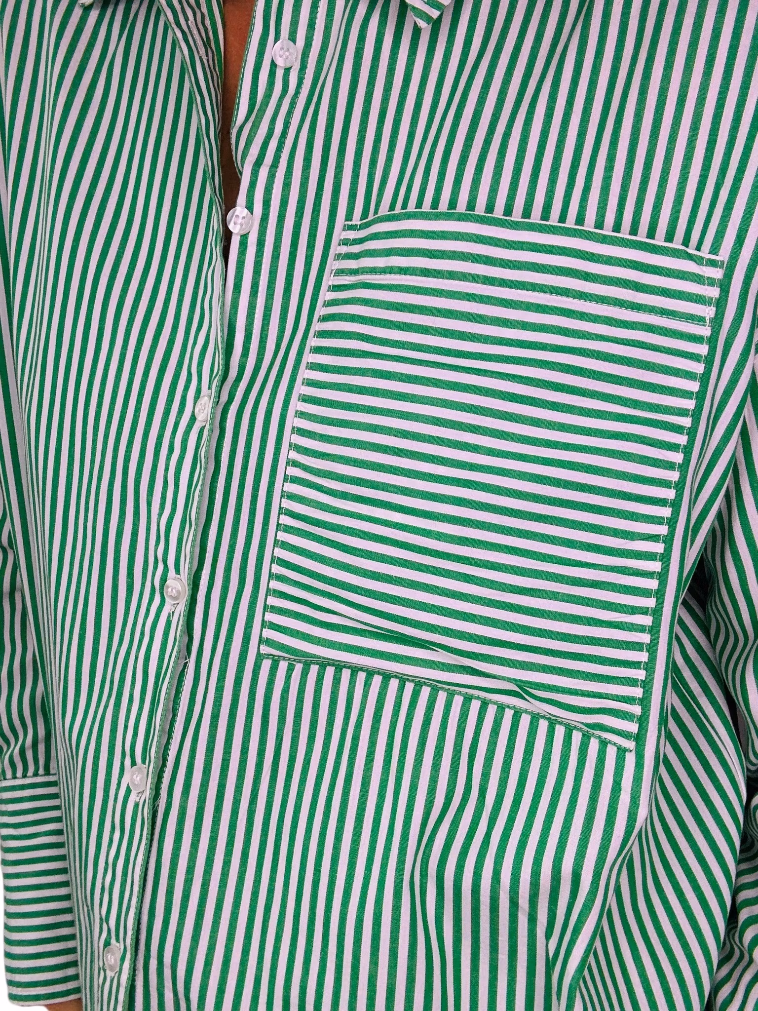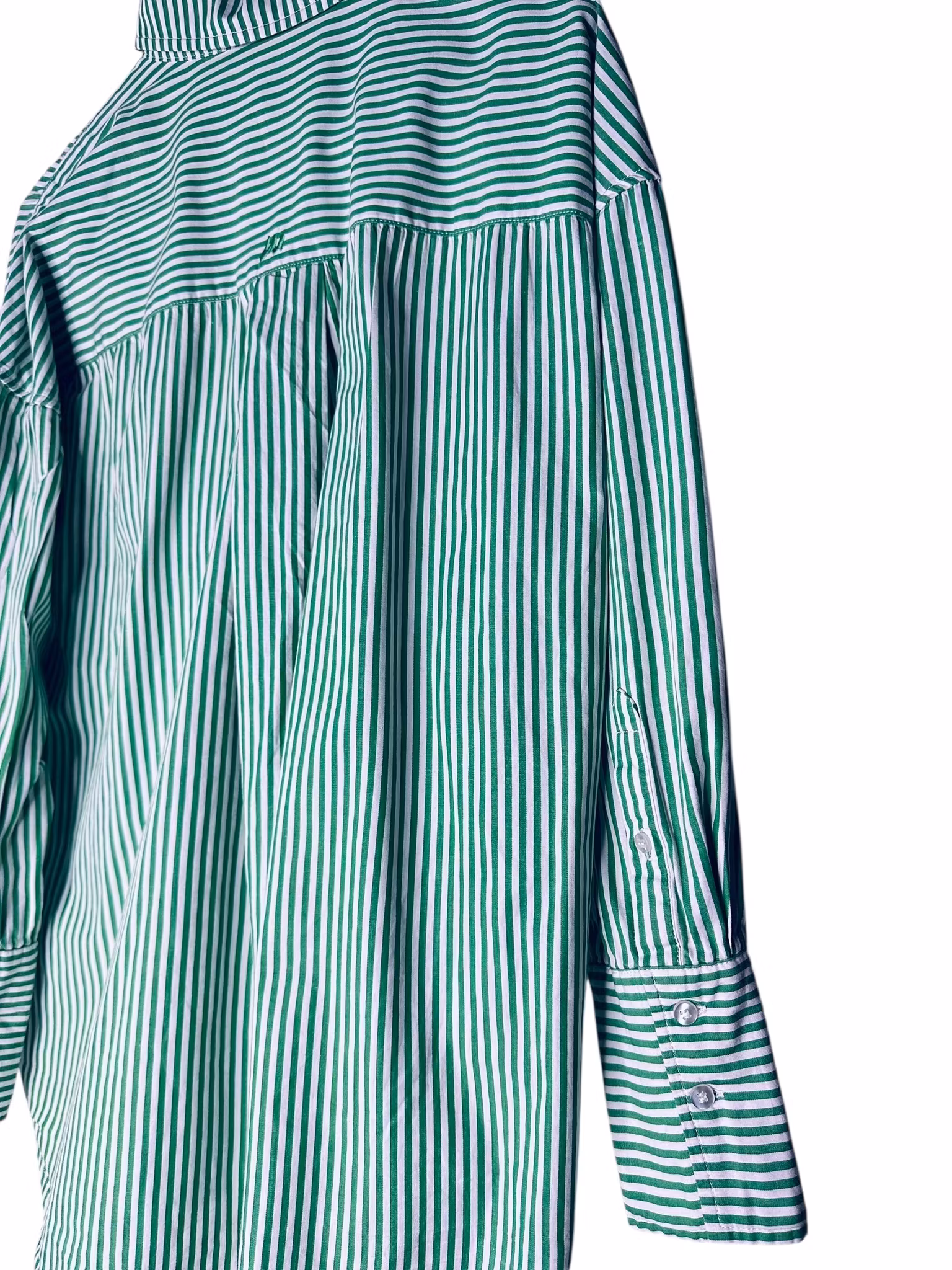 Beskrivning: En krispig bomullsskjorta från danska Moves i en avslappnad form. väldigt lik Hopes klassiska Elma med sin enda, ganska stora bröstficka och boxiga cut. Kul också att ränderna är vända på fickan, en fin detalj. I ryggen finns ett motveck och bokstaven "M" broderat mitt på. Uppfattas som rymlig i storlek.