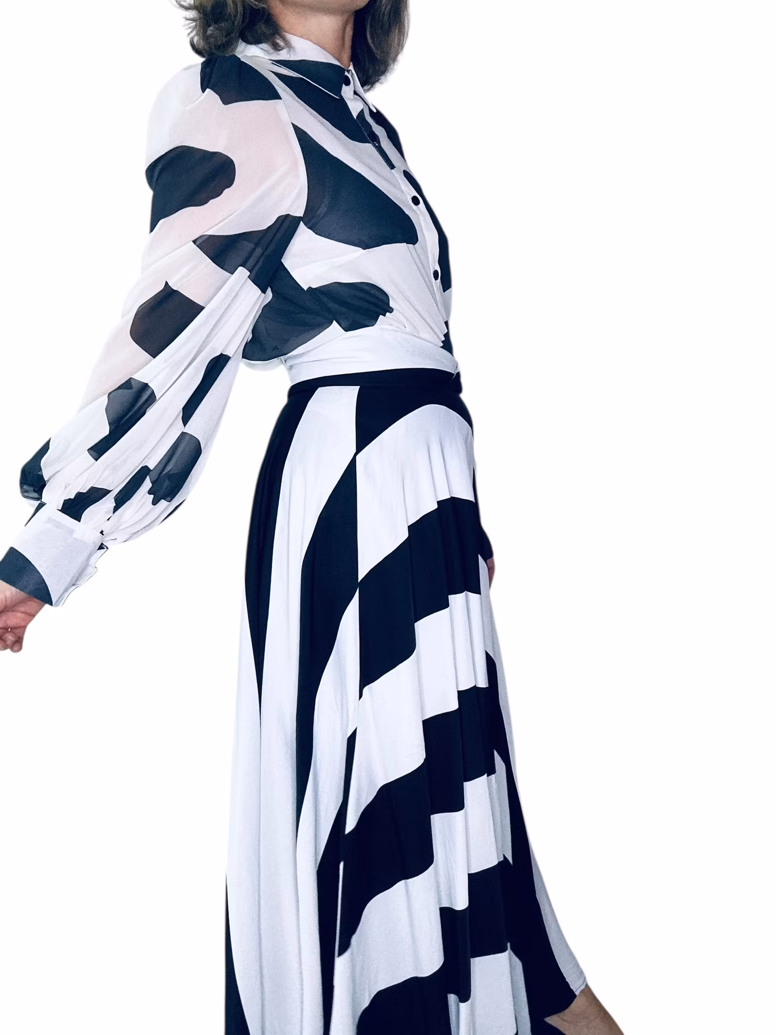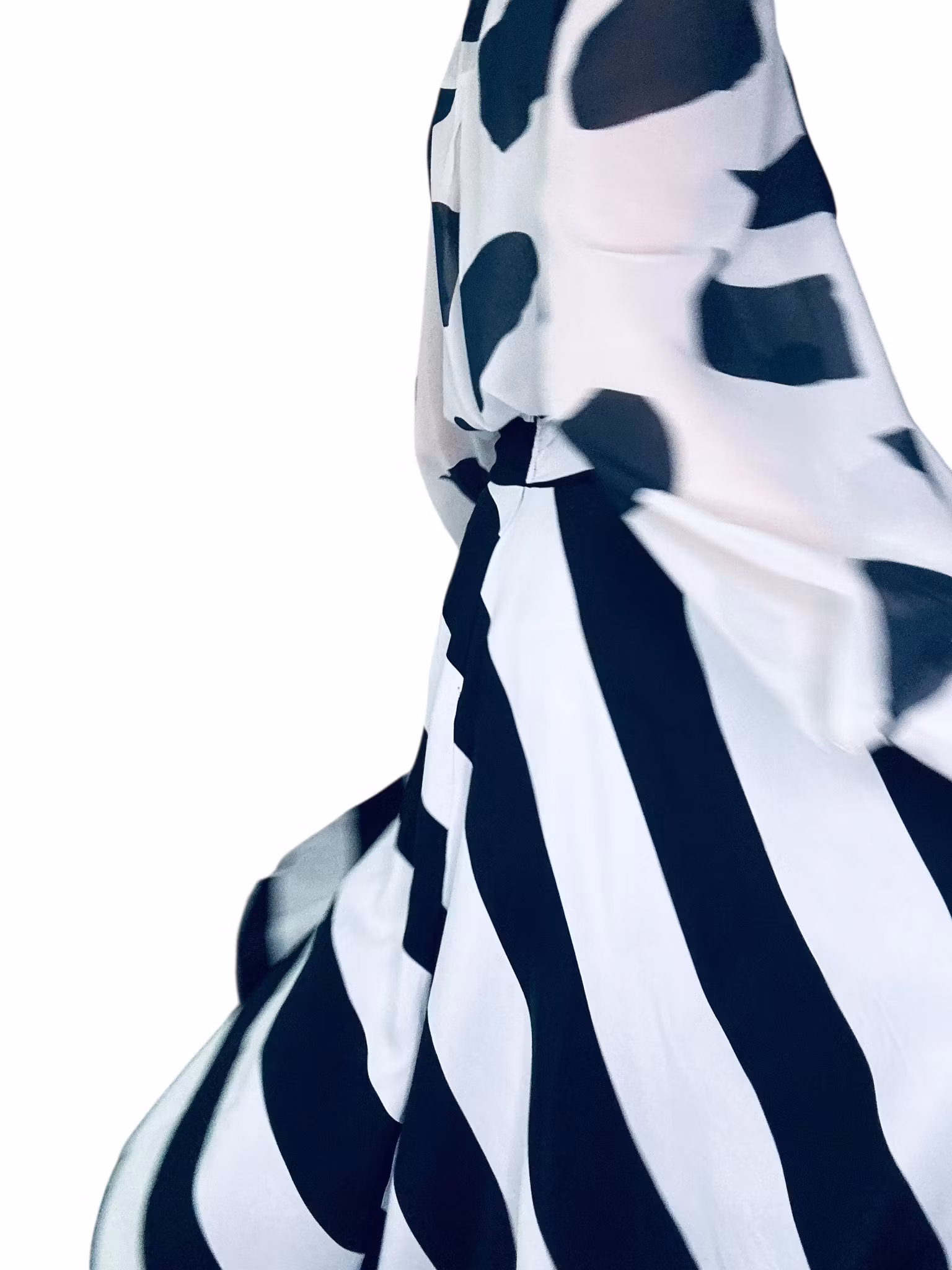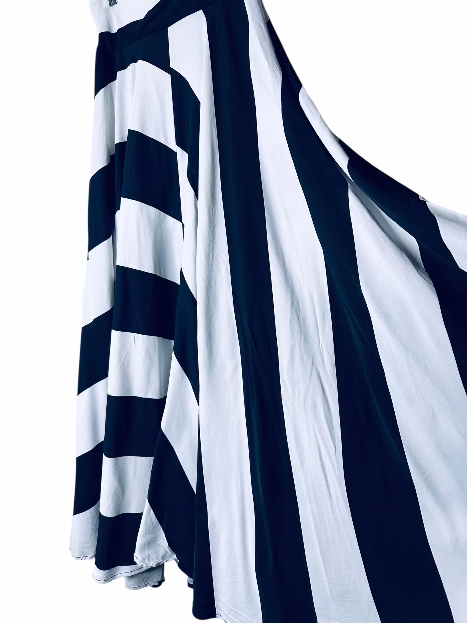 Beskrivning: En kjol med ett otroligt schwung. I tät viskos med svarta och vita ränder som går diagonalt över kjolen. Väldigt vid och klockad modell med bred linning som går omlott framtill. Stängs med dragkedja i ryggen. Från HM.
