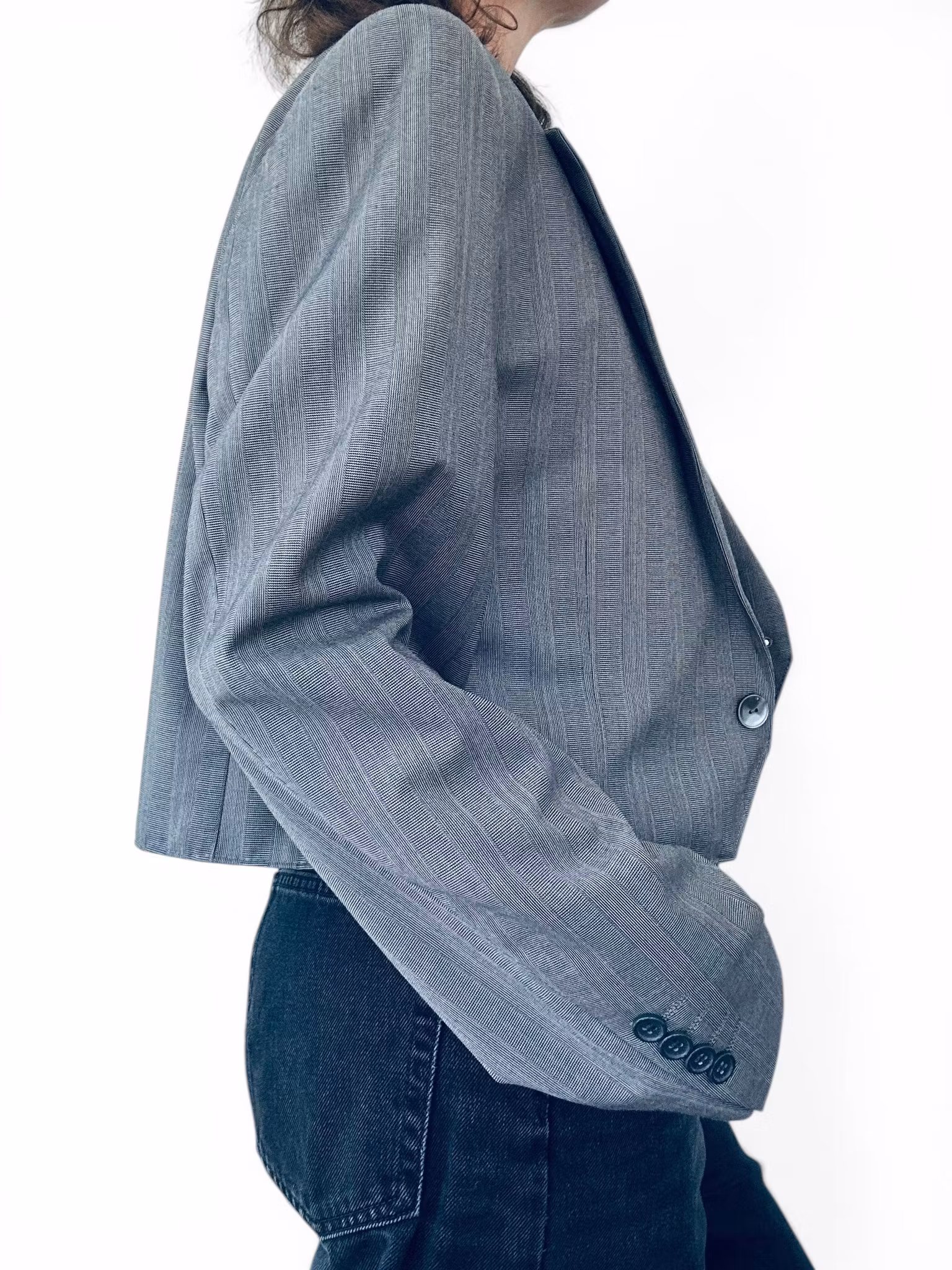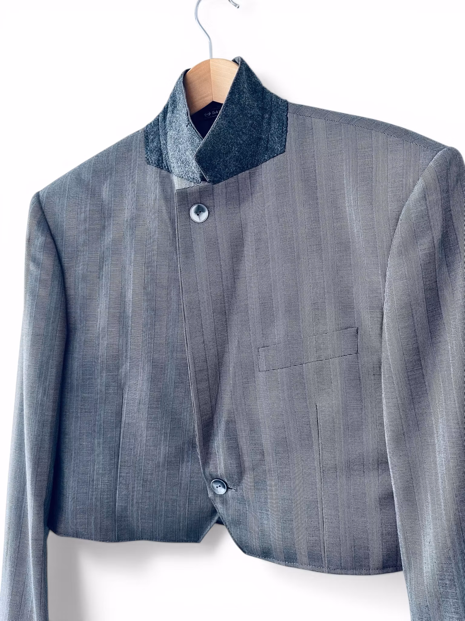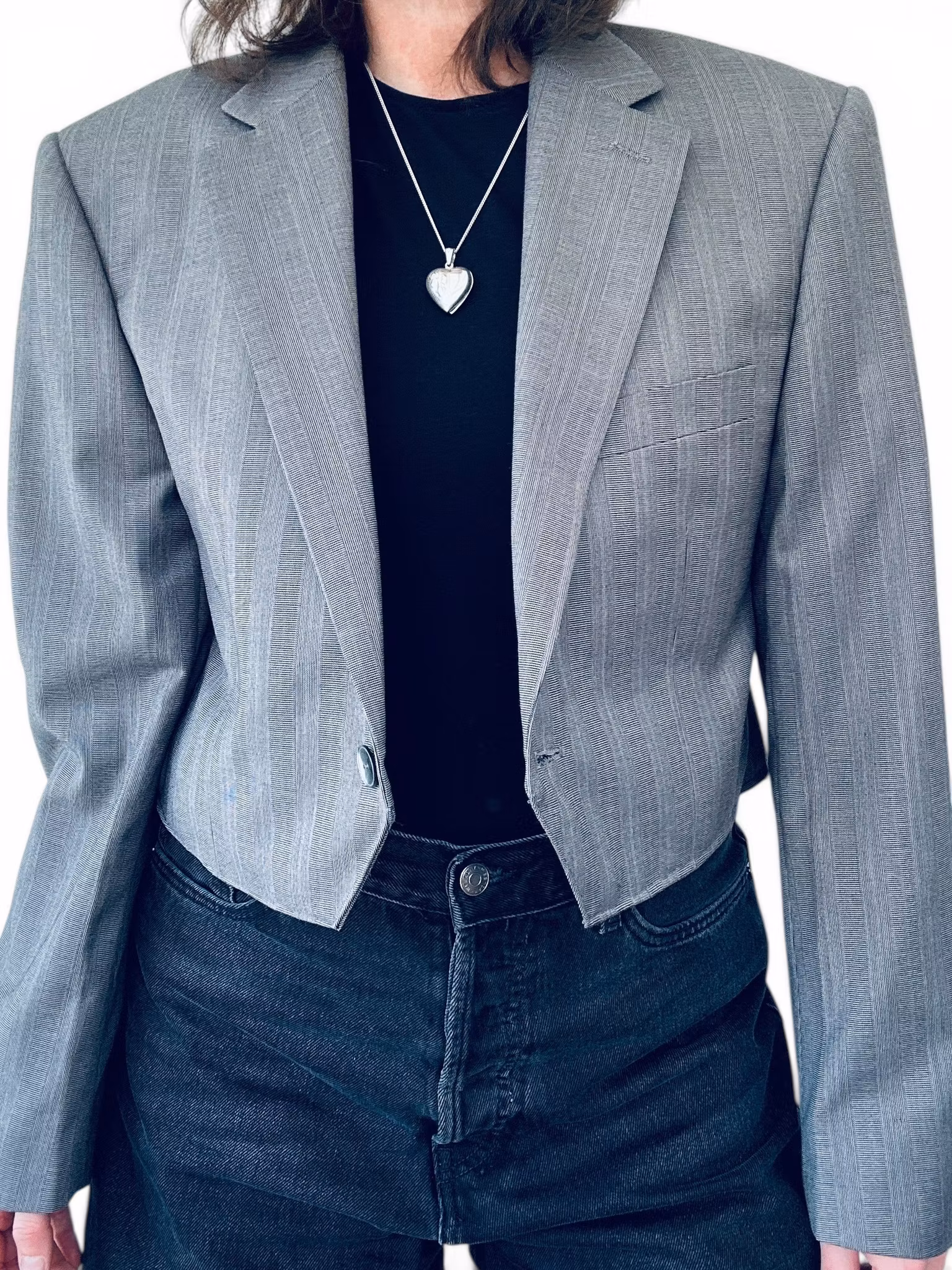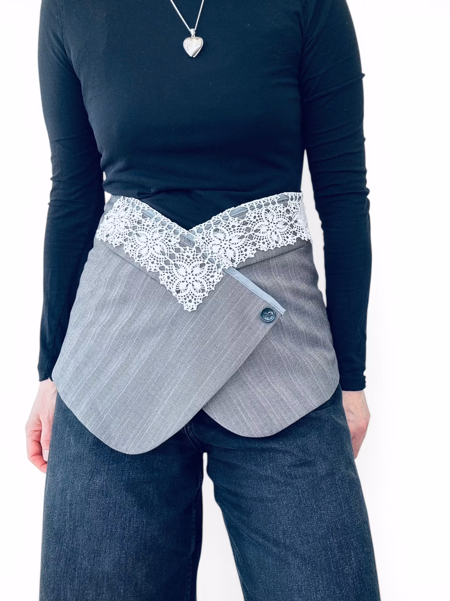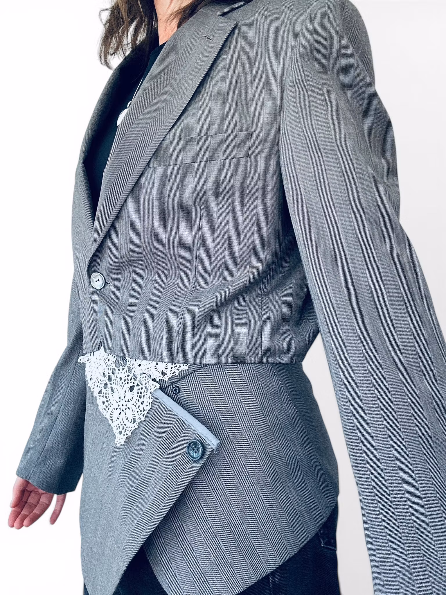 Beskrivning: En unik remake där klassisk herrkavaj möter feminin edge. Den här kavajen har fått nytt liv som en croppad silhuett – tillsammans med ett matchande “apron”-plagg / höftkjol med spetsdetalj. Ett statement set för dig som vill bära något ingen annan har. Kavajen är i en sval grå ton med subtil randstruktur, enkelknäppning och klassiska slag. Den kortade längden ger en modern, mer markerad midja. Bakom ena slaget har en extraknapp sytts så kavajen kan bäras knäppt upp i halsen. Tillhörande del är sydd av samma originalplagg och bärs som ett lager över byxa eller kjol – med en vacker spetskant som bryter av det skräddade och ger en oväntad mjukhet. Stängs med tryckknappar i två lägen för olika midjebredd.