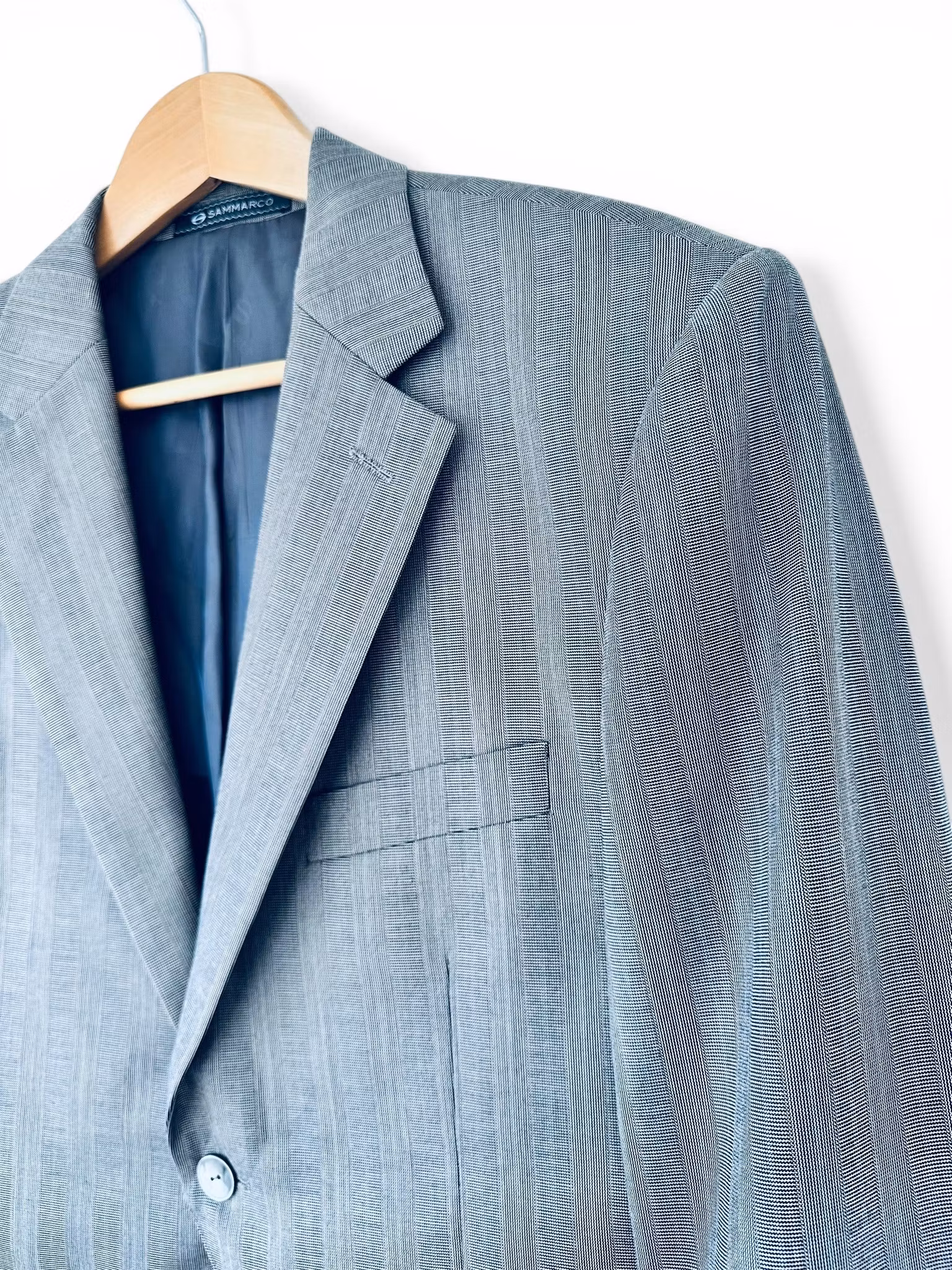 Sammarco är ett mindre, skrädderiinspirerat varumärke med rötter i klassiskt herrmode. Den här typen av plagg producerades ofta med fokus på material och konstruktion snarare än snabba trender. Tillverkad i Super 150’s ull – en finare ullkvalitet med tunnare fibrer som ger ett mjukt fall, en slät yta och en mer exklusiv känsla. Den här typen av tyg används ofta i mer påkostade kostymer.