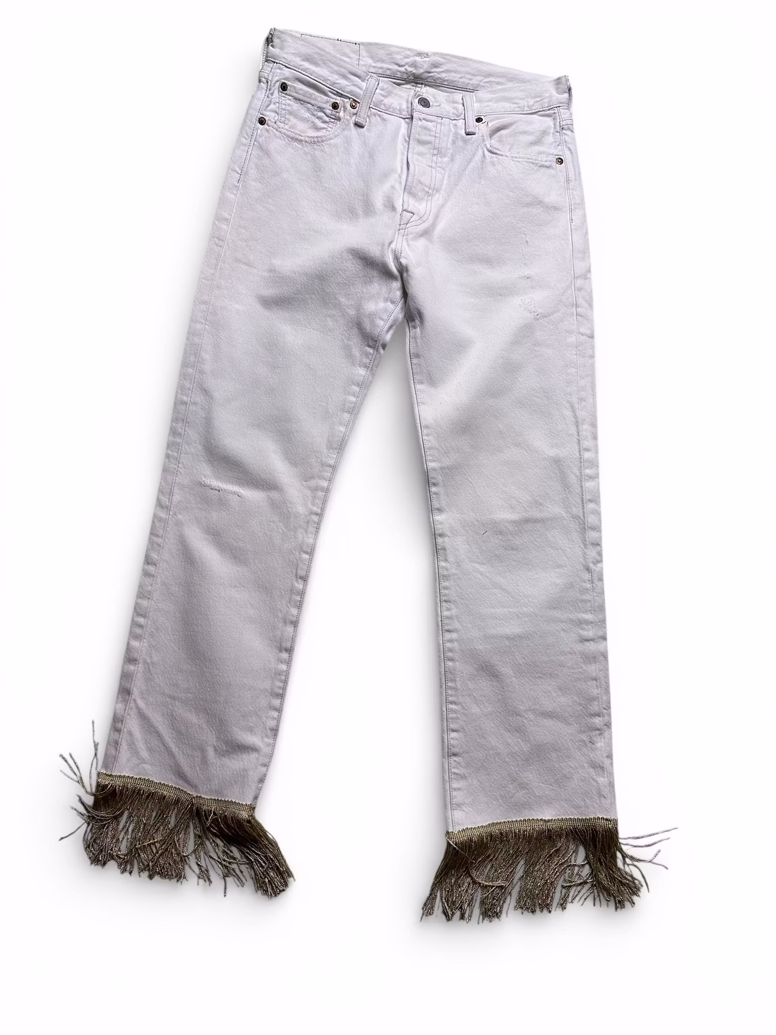 Beskrivning: Klassikern Levi’s 501, skick enligt bilder. Dessa är avklippta och jag har istället satt dit en fin guldig frans så du får ett par alldeles unika och remake-ade jeans med det lilla extra!