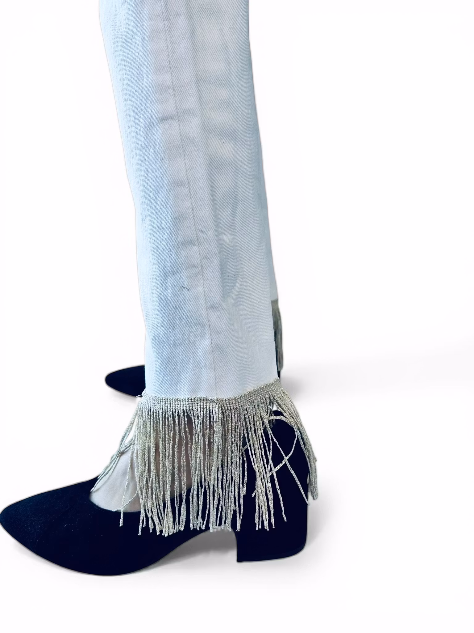 Mått: Midja (mätt rakt över) 40 cm, innerbenslängd 79 cm med frans