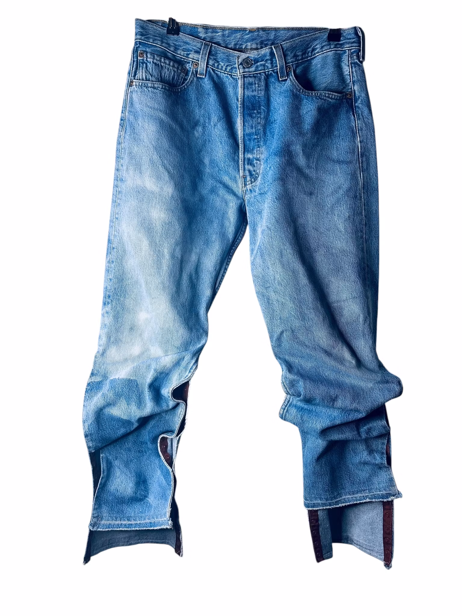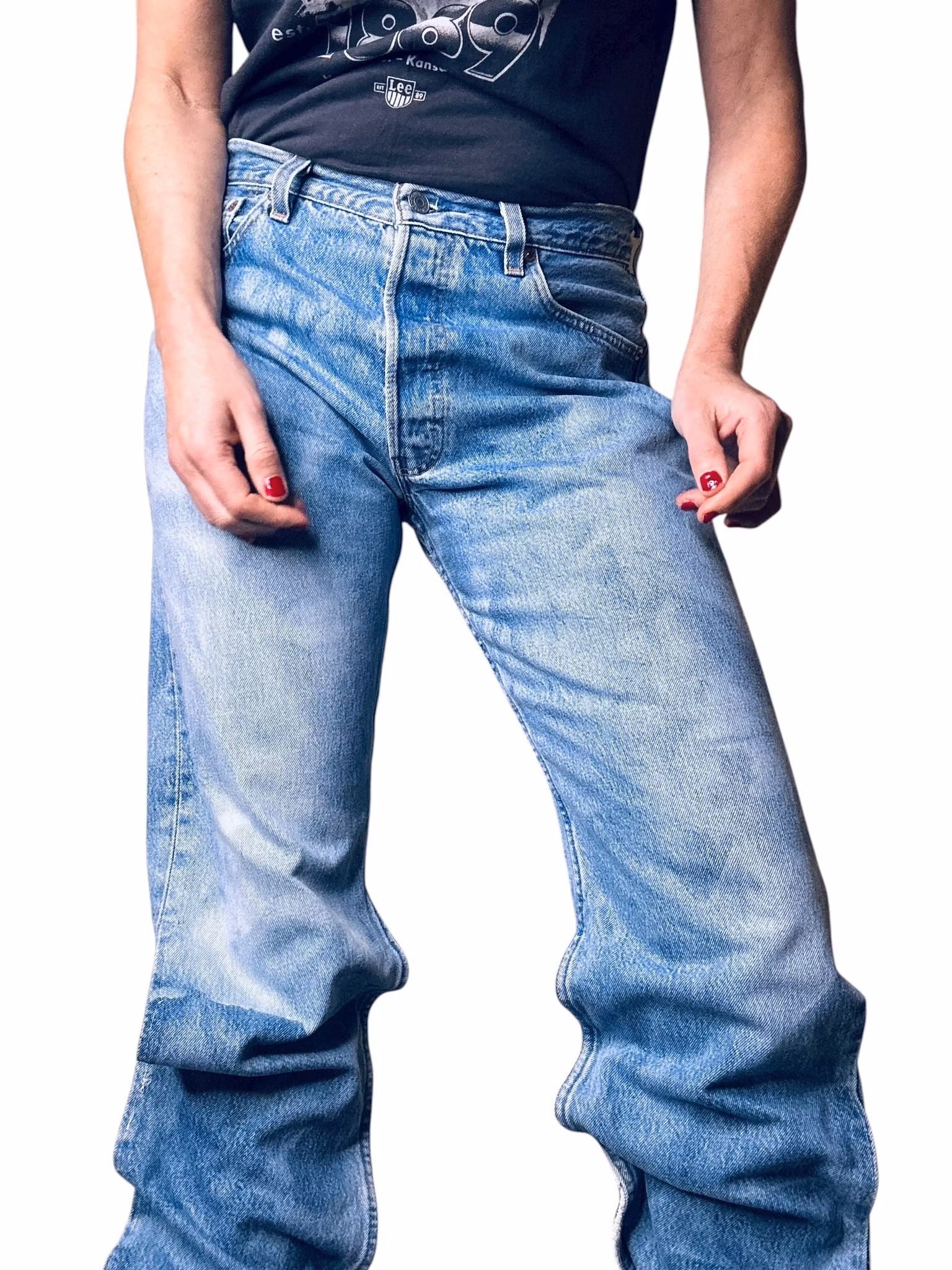 Beskrivning: Ett par vintage Levi's 501:or, "Made in USA". Ljusblå och fläckigt blekta. Sidorna är sprättade upp till knäna - inspirerade av Glenn Martens kollektion för HM - i slitsarna finns band med tryckknappar så en kan ändra looken på jeansen som en känner för. Snyggast tycker vi är att vecka dom så som på bilderna så skorna syns ordentligt och det blir en cool silhuett från sidan.