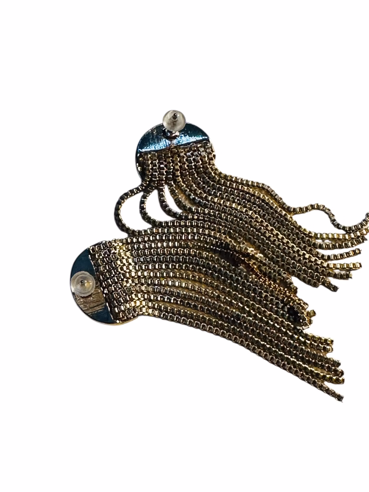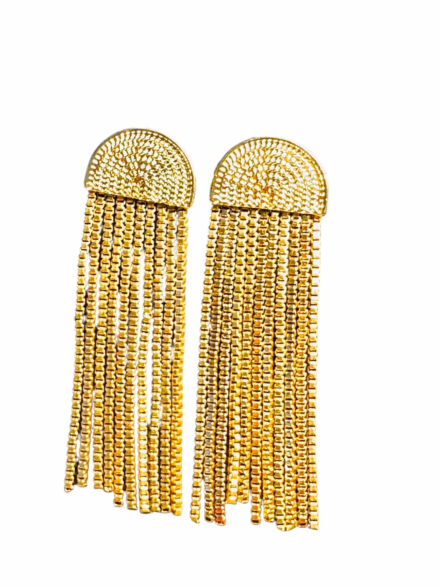 Beskrivning: Örhängen i guldfärgad metall i form av ett uppochnervänt U - eller en regnbåge (!) med lösa kedjor hängande under.