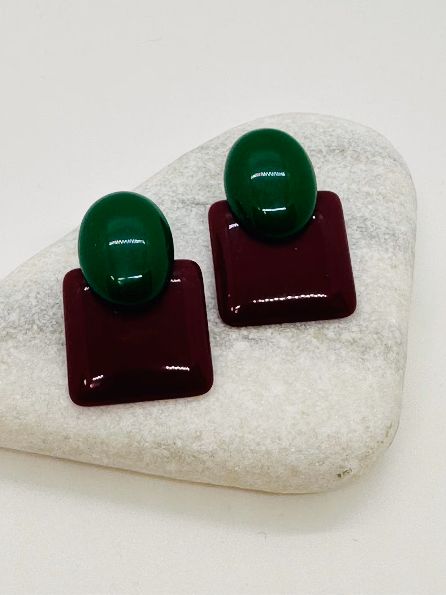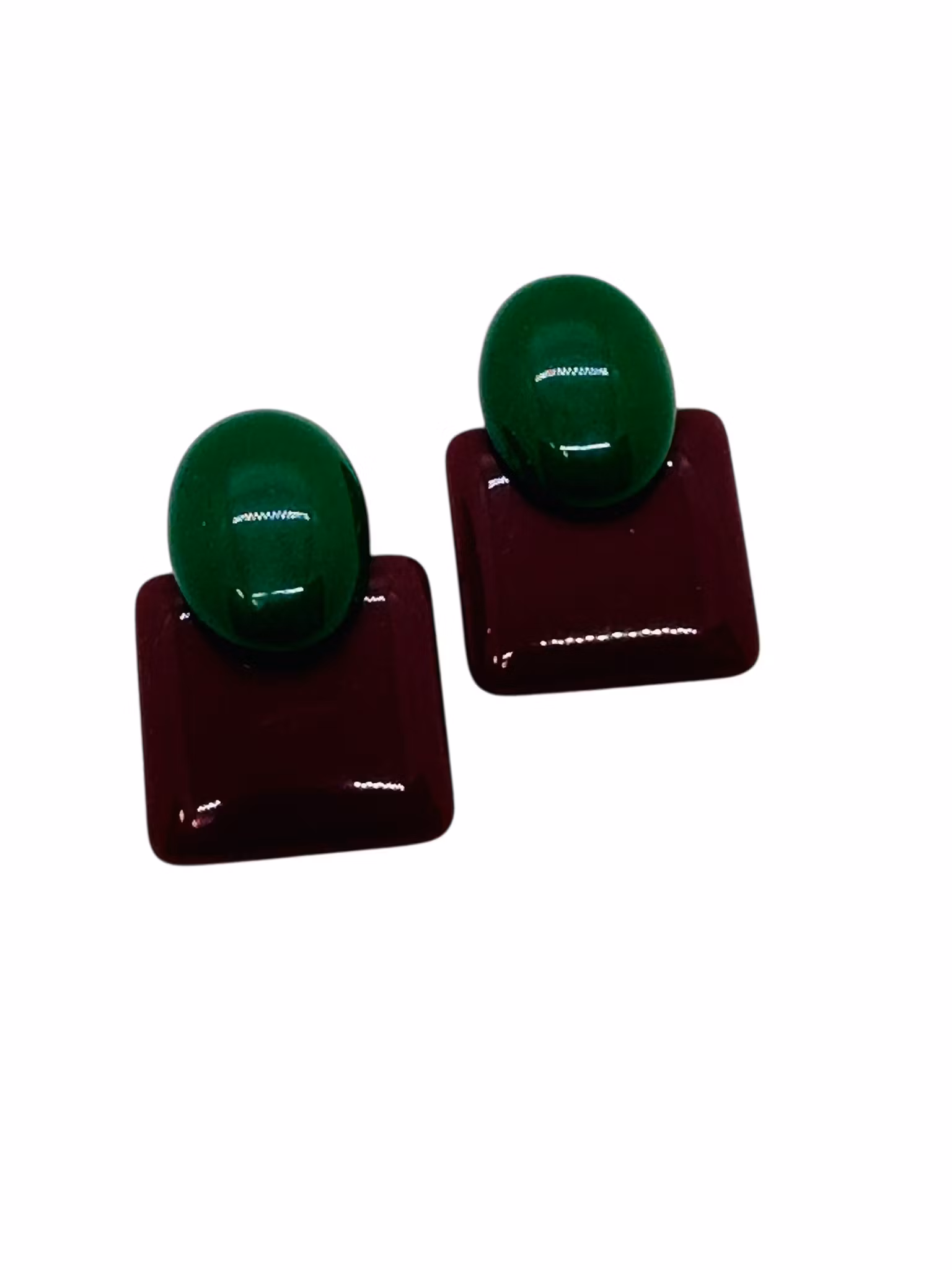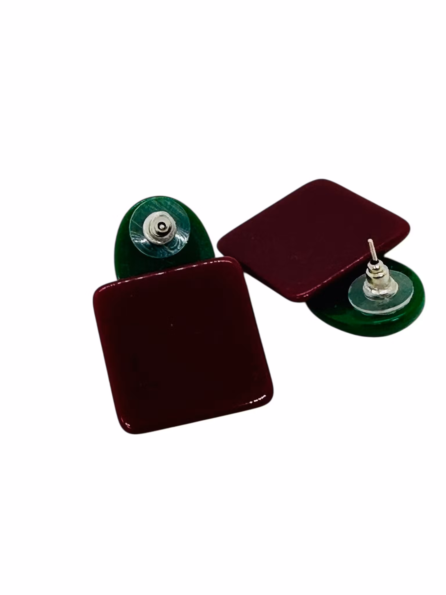 Beskrivning: Stilrena och minimalistiska örhängen i plast med en mörkt grön oval som har en vinröd fyrkant under sig. Påminner mycket om Svenskt Tenns Milano-örhängen.