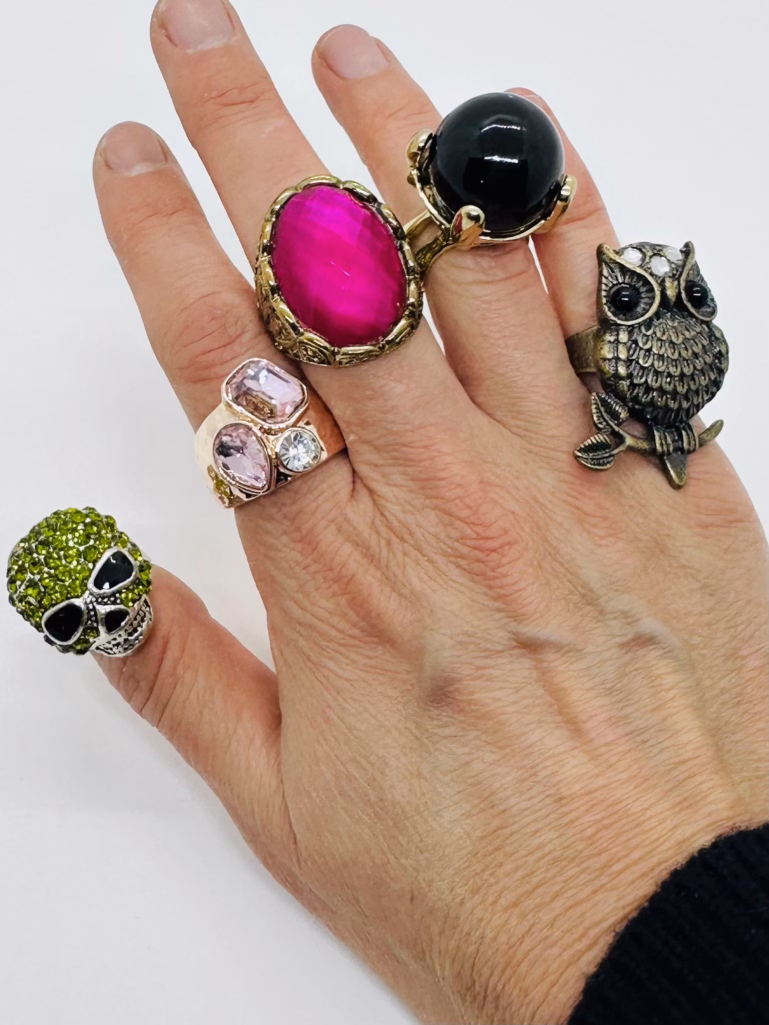 Beskrivning: Stor ring i oxiderad silvermetall med en dödskalle som dekorerats med grön strass.
