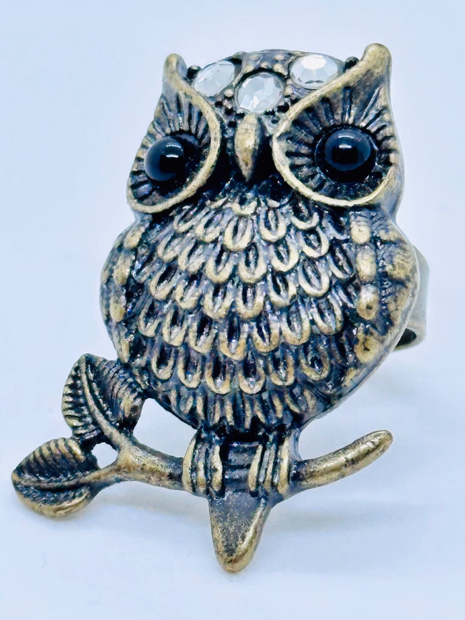 Beskrivning: Stor ring i oxiderad silvermetall i form av en uggla där ögonen är av svart sten och pannan smyckats med vit strass.